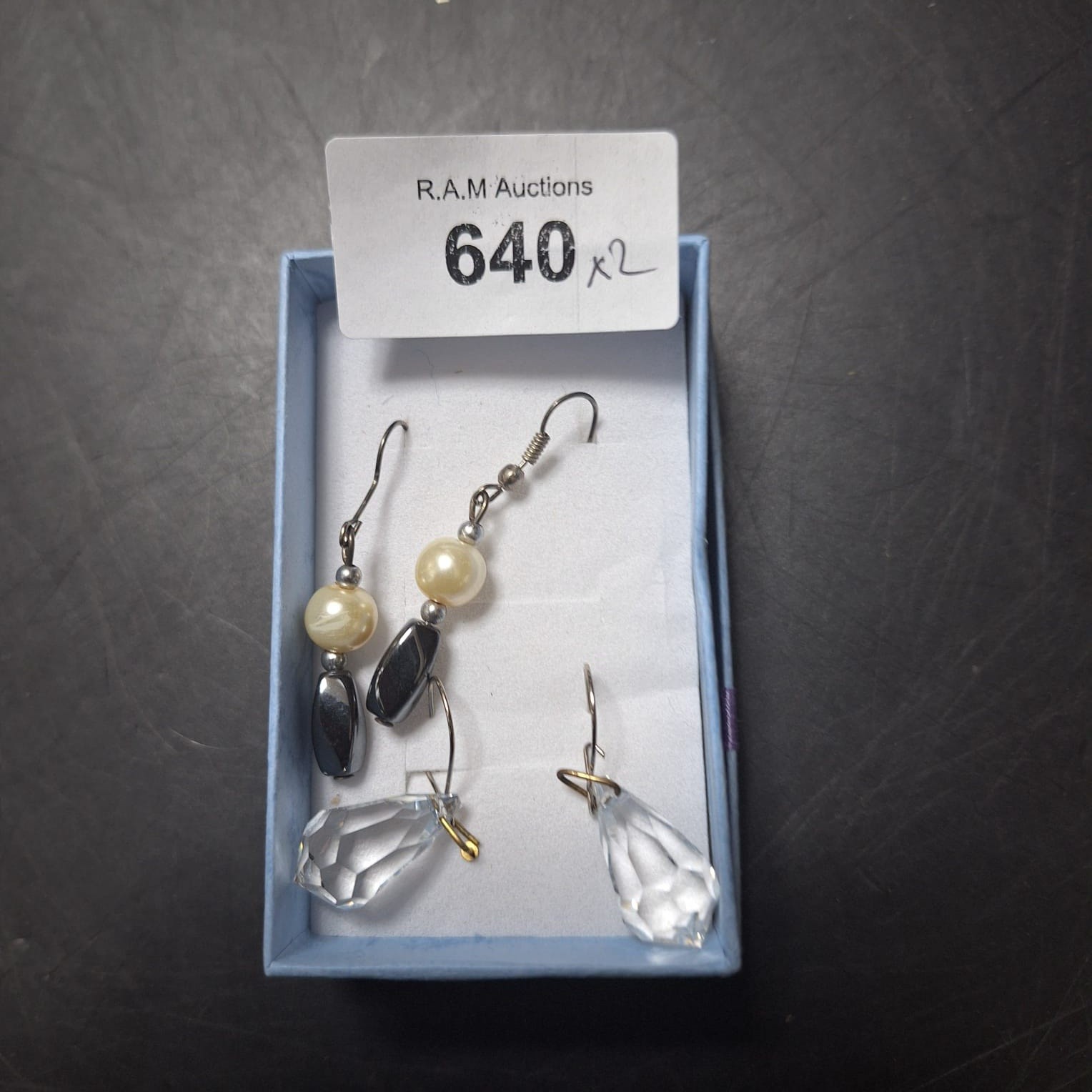 A light blue box contains three pairs of earrings, two featuring cream beads and a dark gray rectangular bead, and one with clear faceted teardrop-shaped stones.