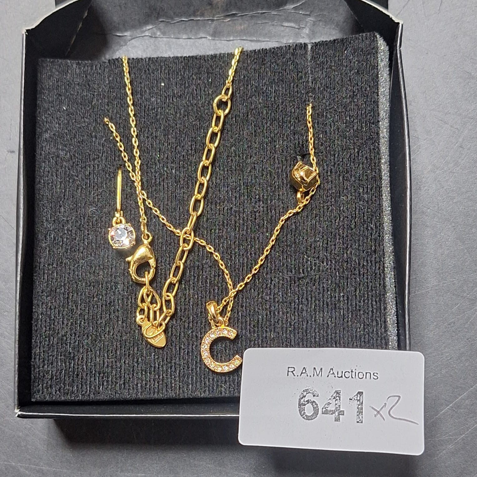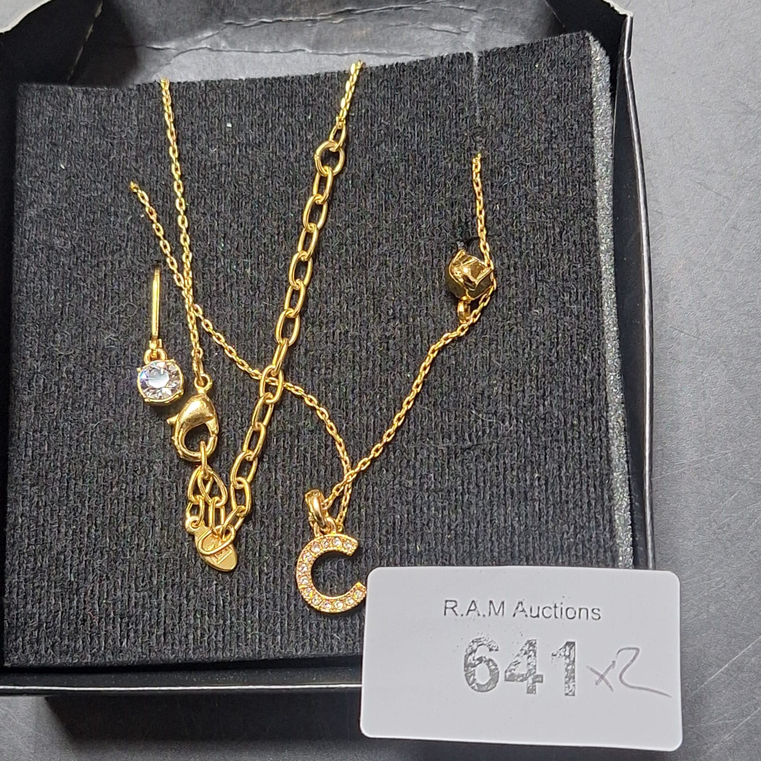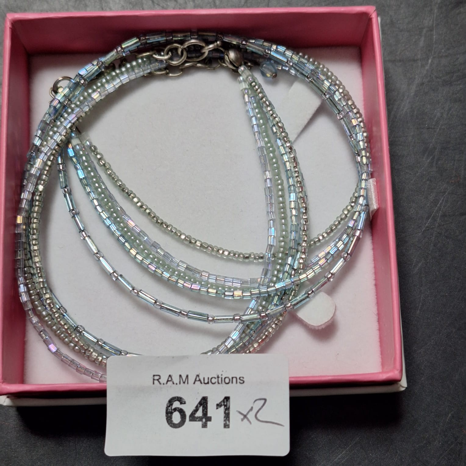 Multi-strand iridescent bead necklace and a gold-toned necklace set with pendant and charm.