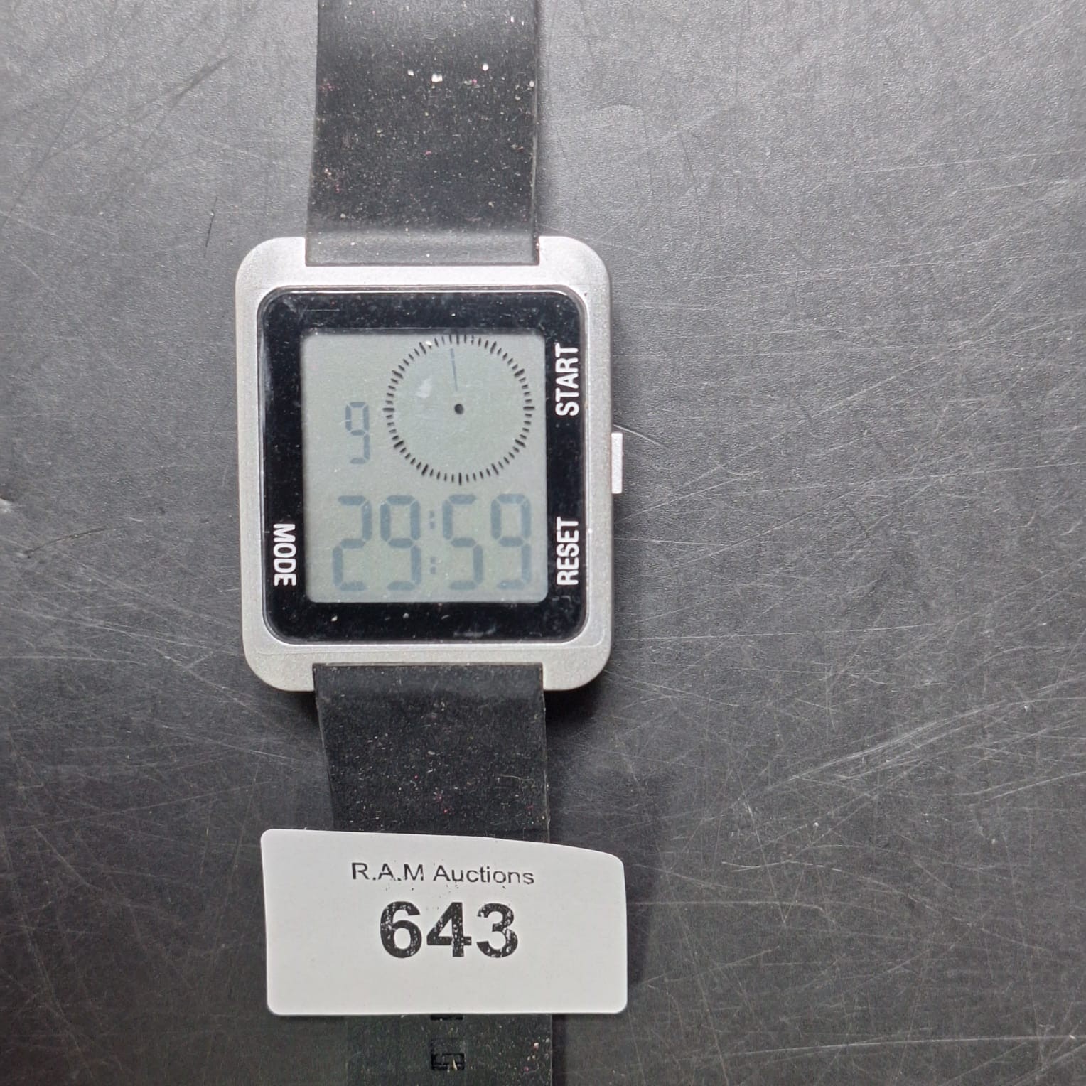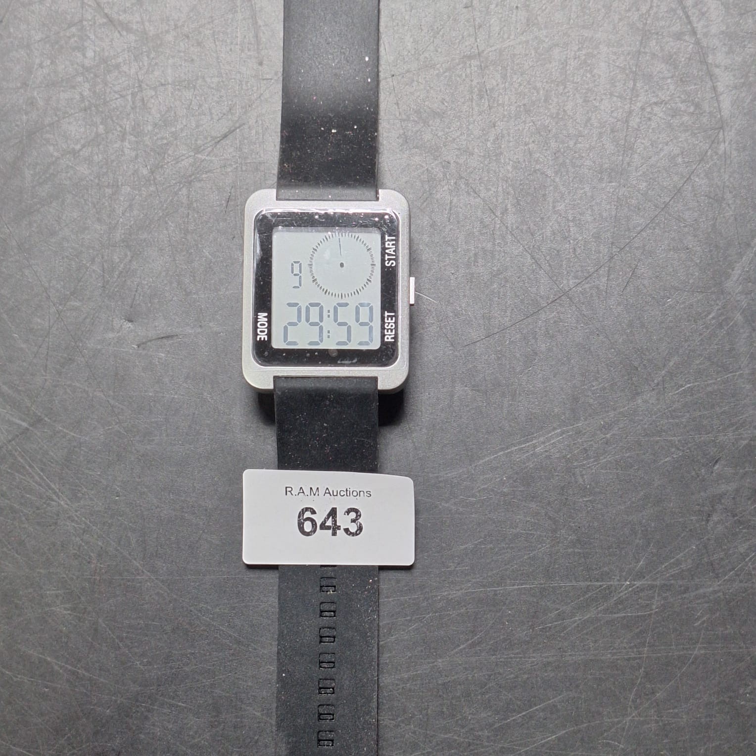 Square digital watch with silver-toned metal case, black rubber band, and digital time display with an analog sub-dial.