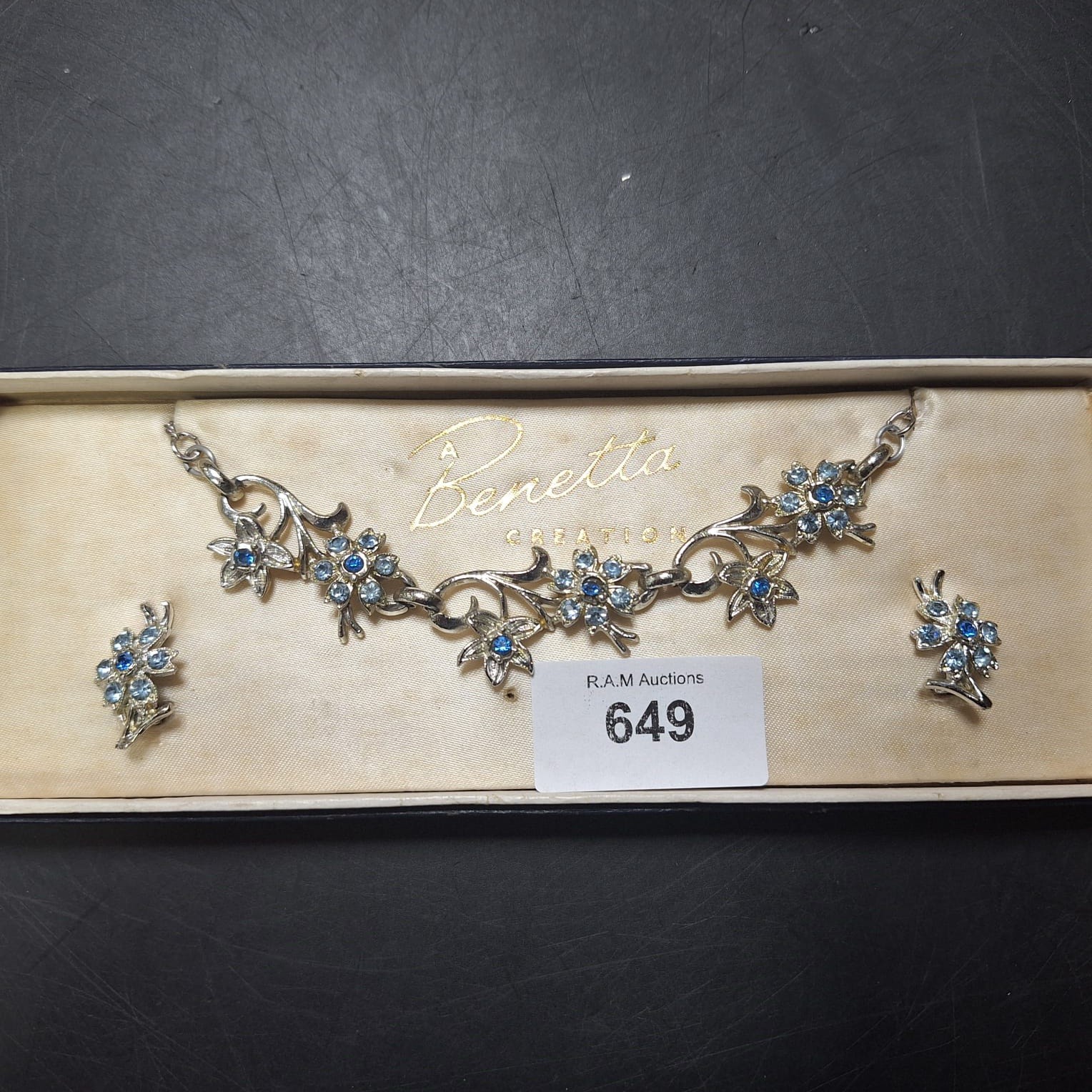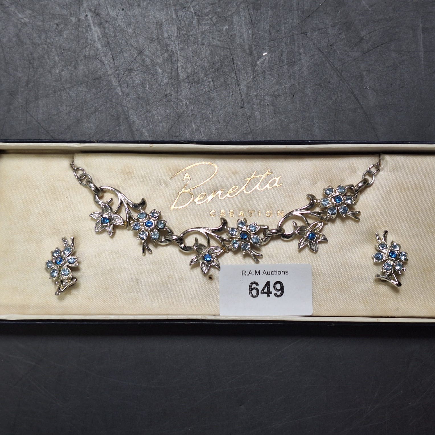 Silver-toned necklace and matching stud earrings with light blue rhinestone flower accents.