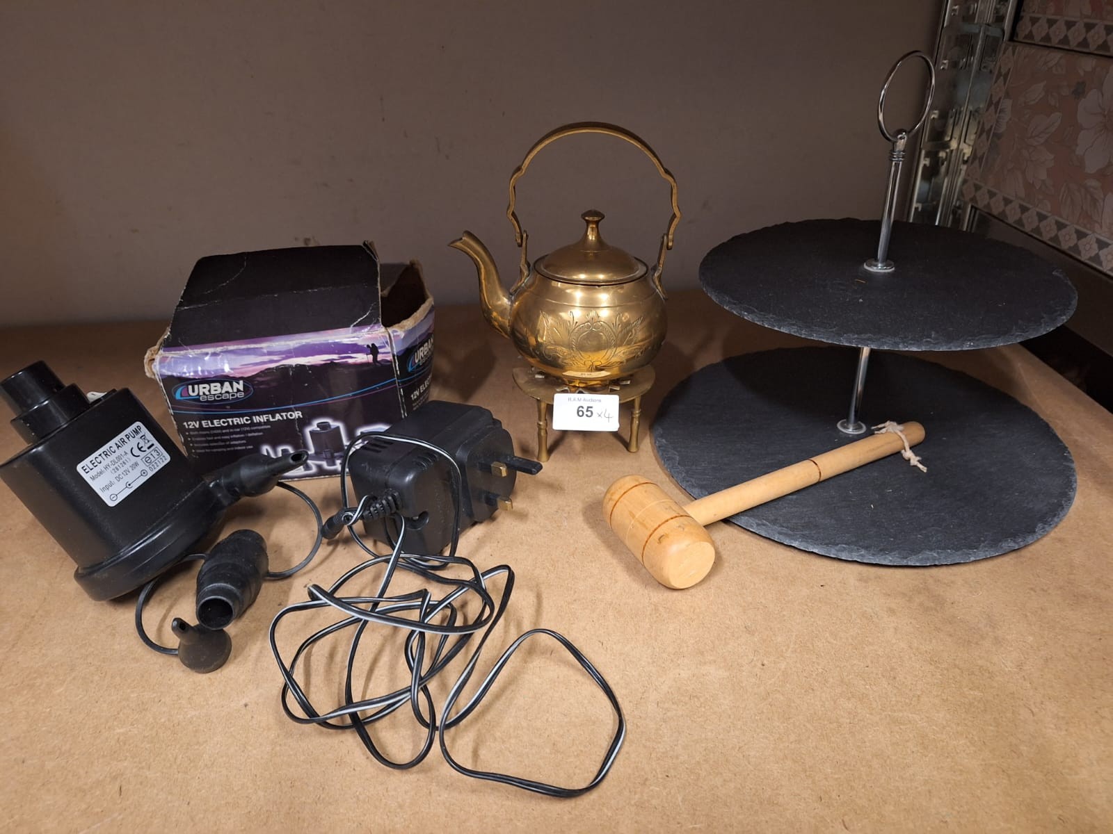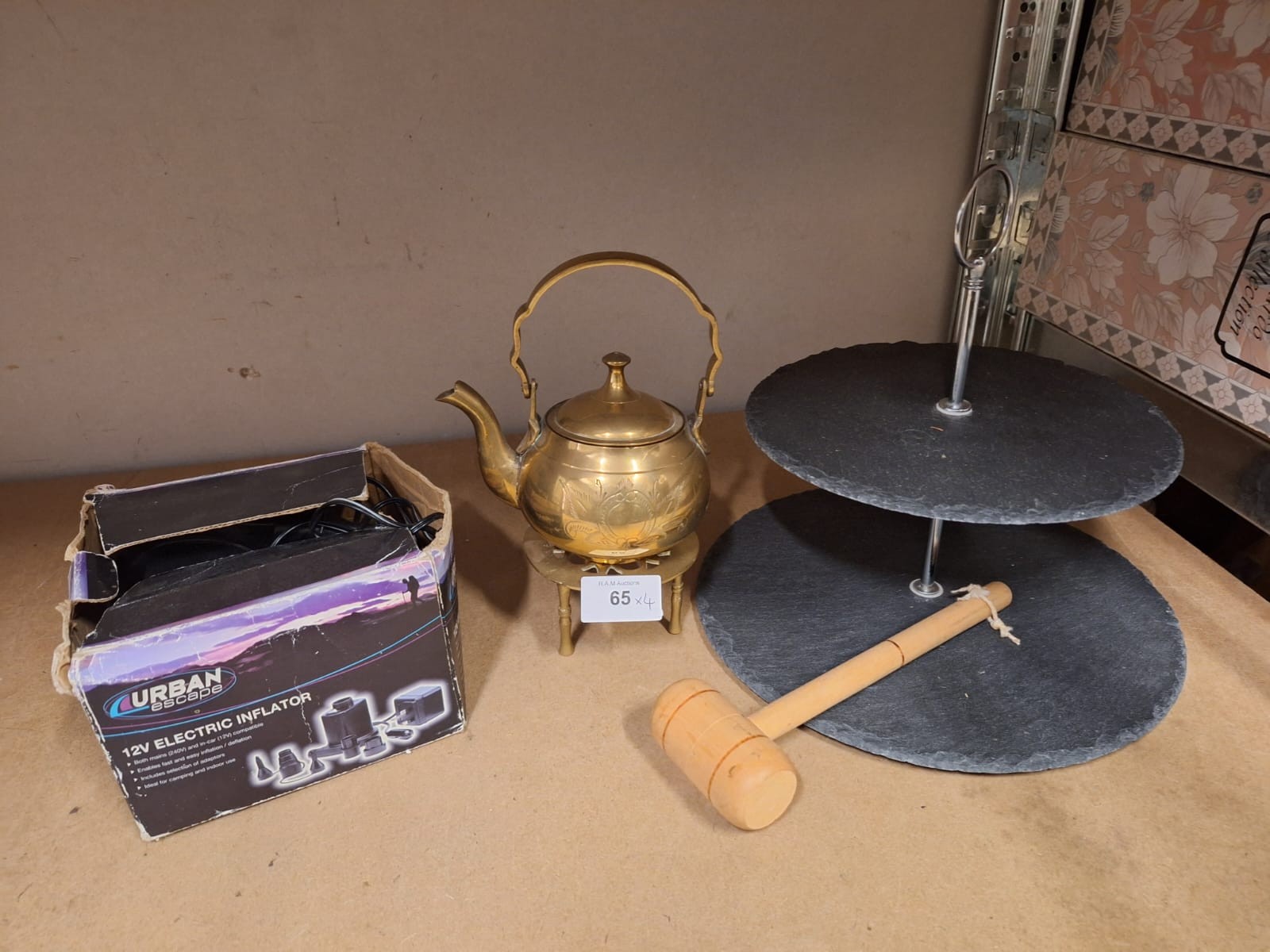 Collection of home goods including a decorative brass kettle, a two-tiered serving stand, a wooden mallet, and a 12V electric inflator.