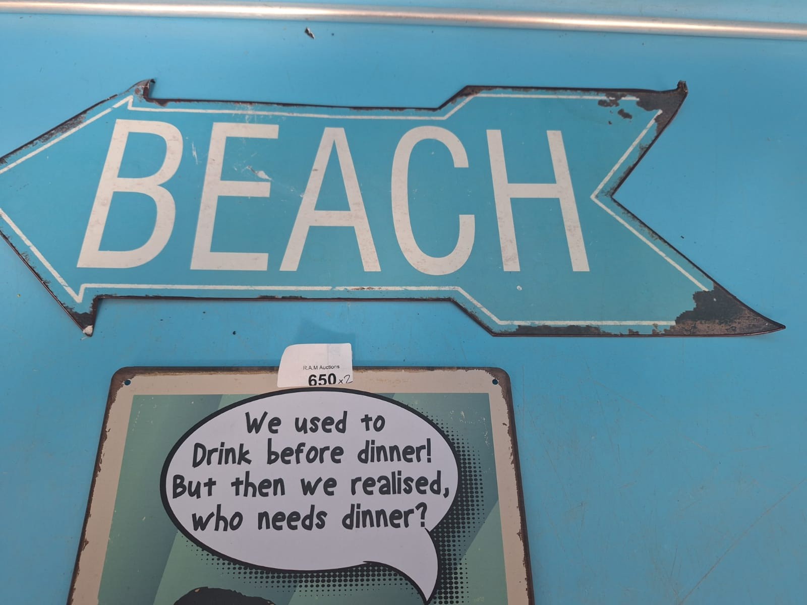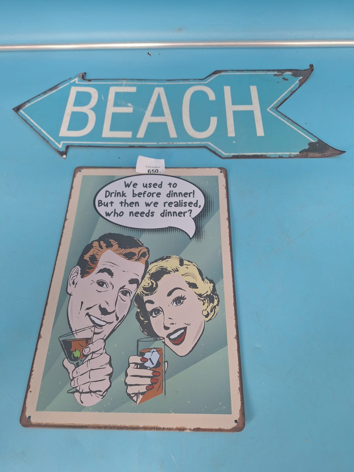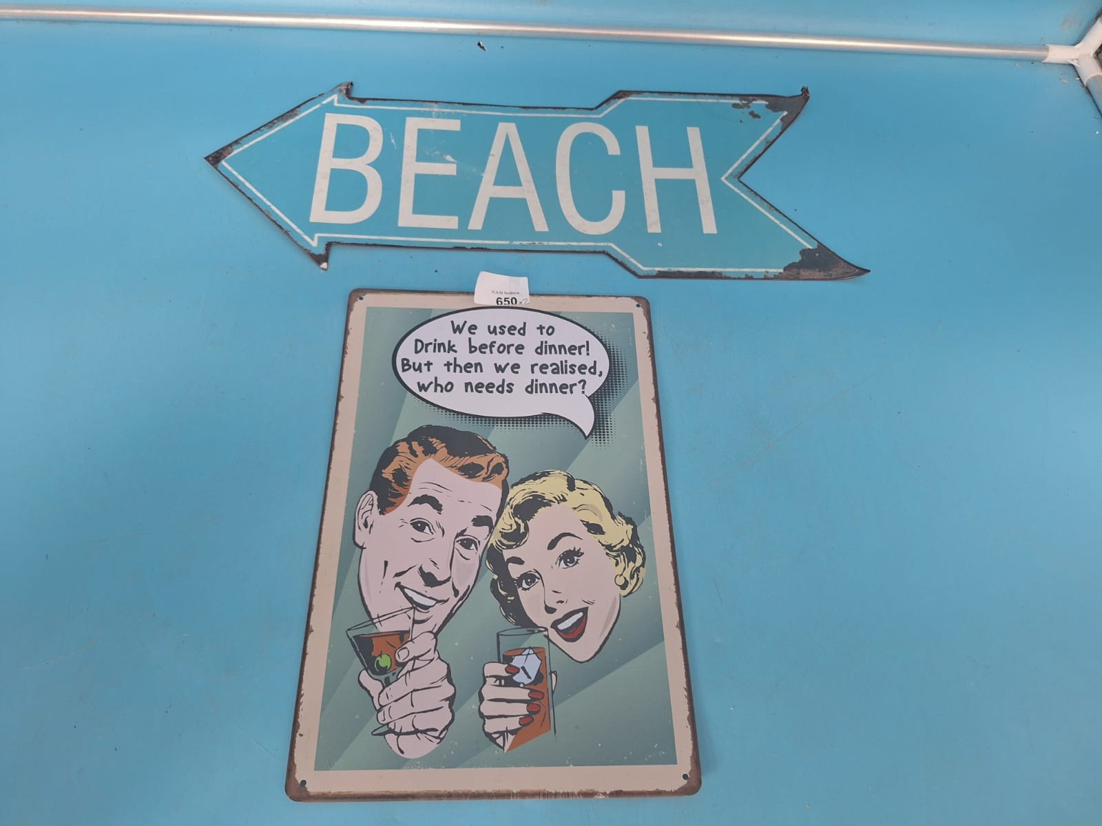 Metal arrow sign with “BEACH” text and a rectangular sign with a retro cocktail illustration and humorous text.