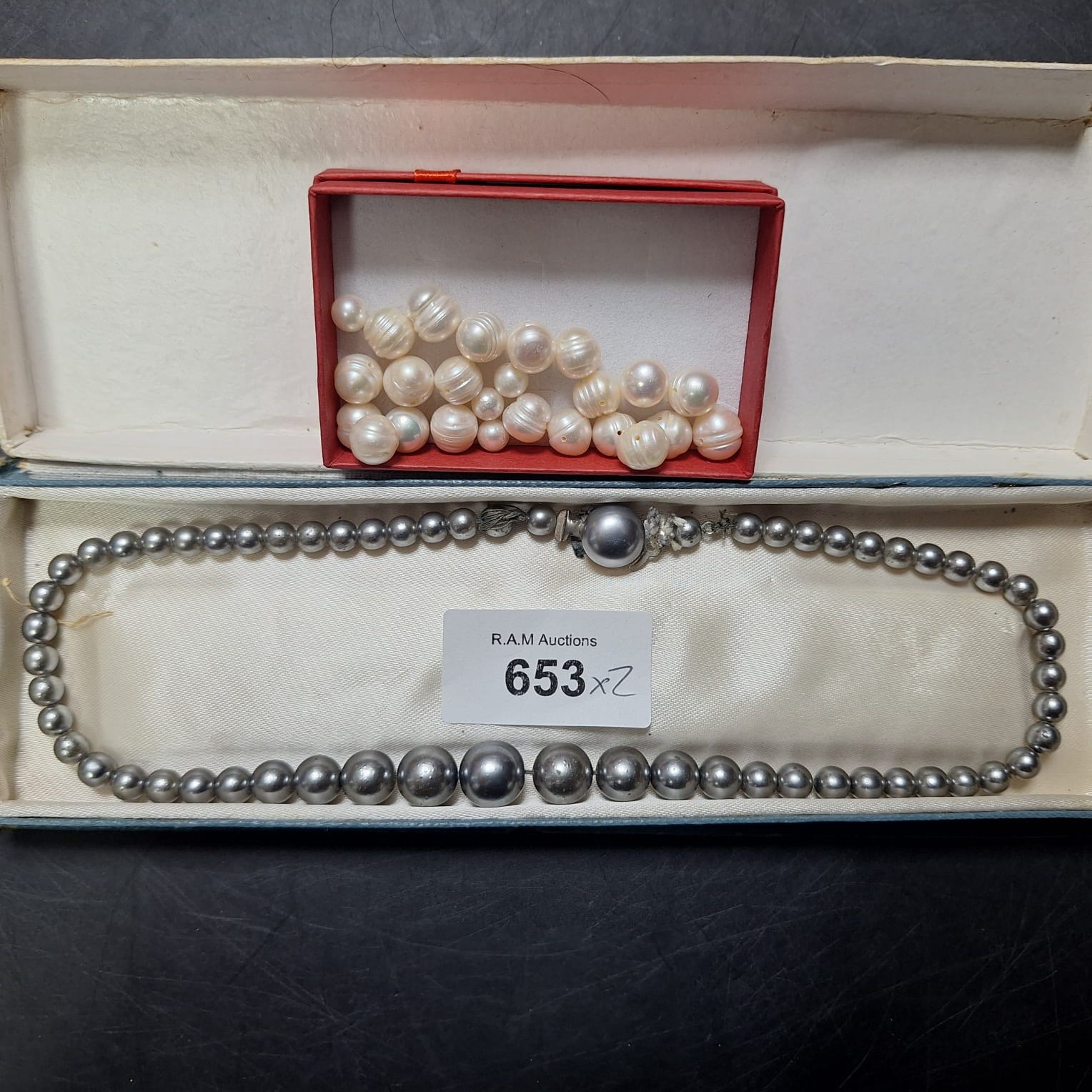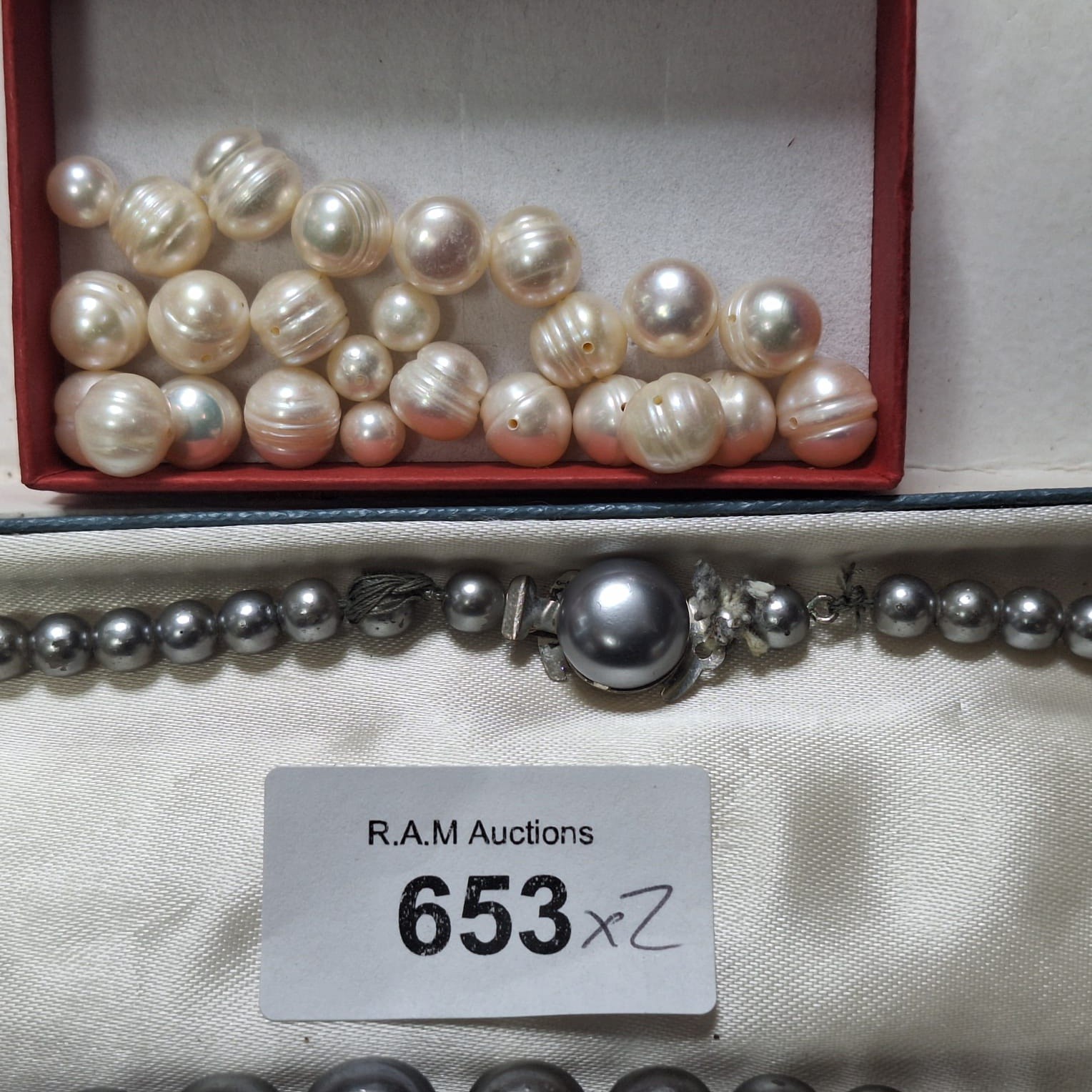 Off-white pearls with grooved surfaces and a dark gray pearl necklace with a pearl clasp.
