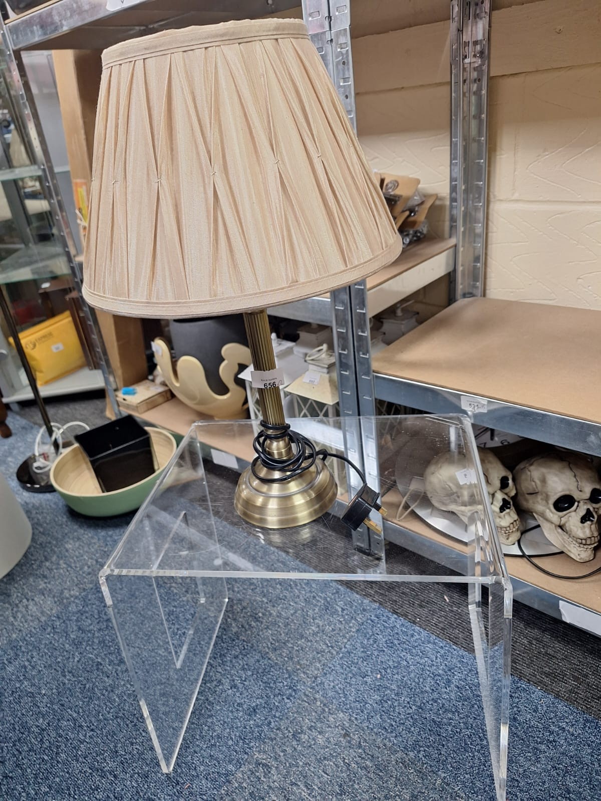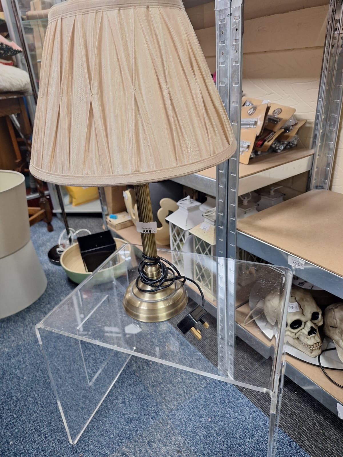 Pleated beige fabric shade table lamp with brass-colored metal base and UK plug, on a clear acrylic table.