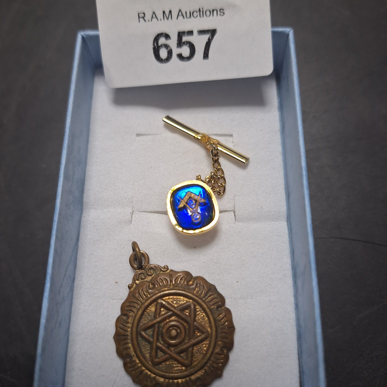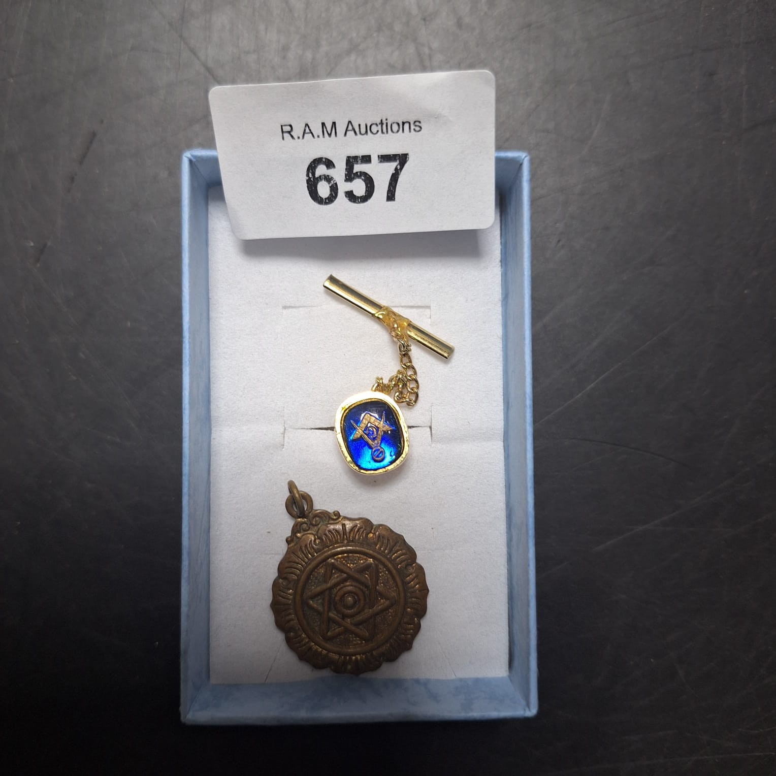 Gold-tone tie tack with blue square inset and bronze-tone medallion with star and eye design.