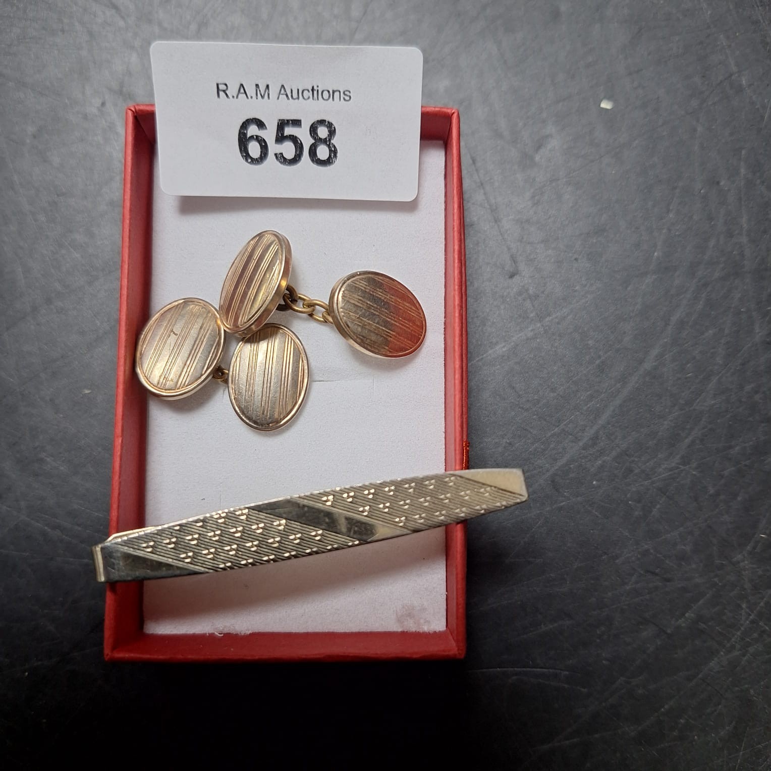 Gold-colored oval cufflinks with vertical lines and a geometric pattern tie clip.
