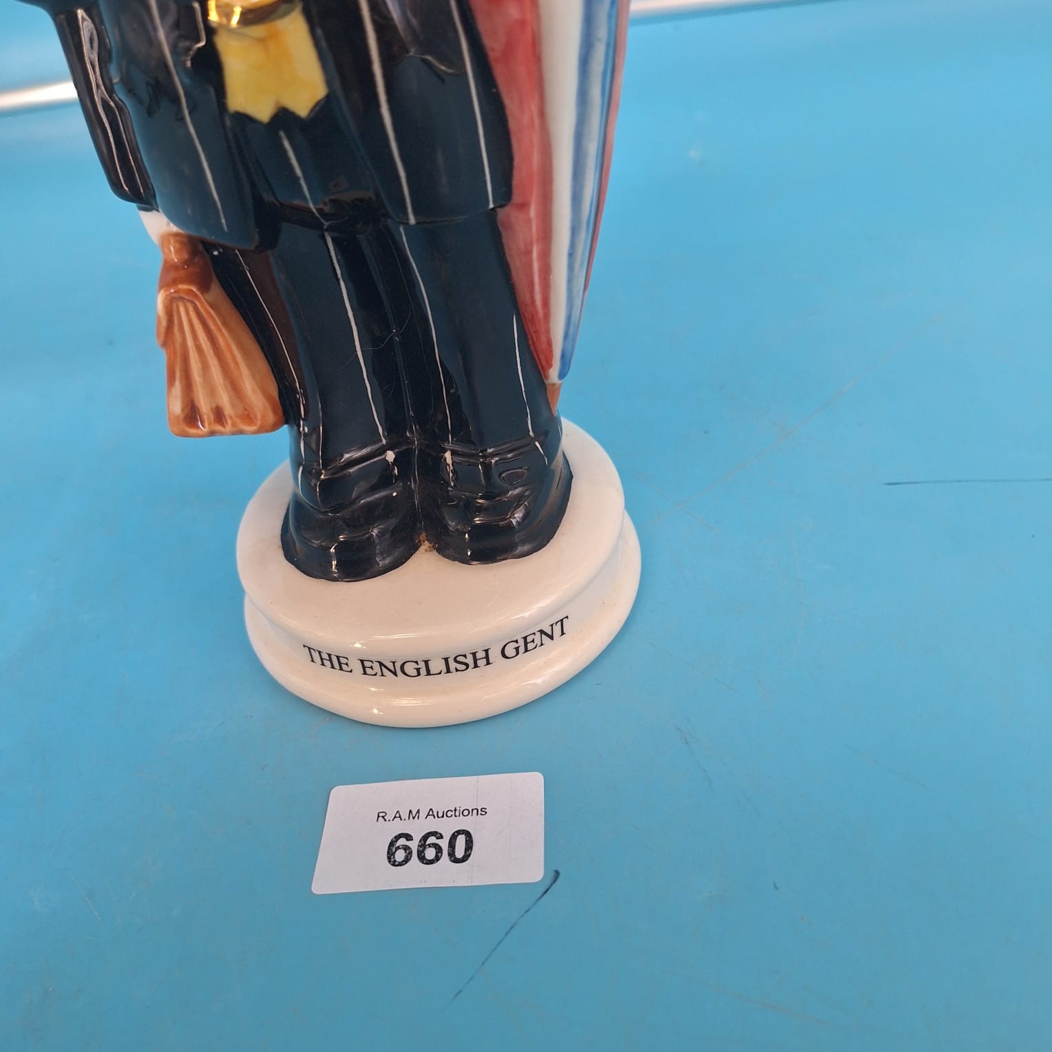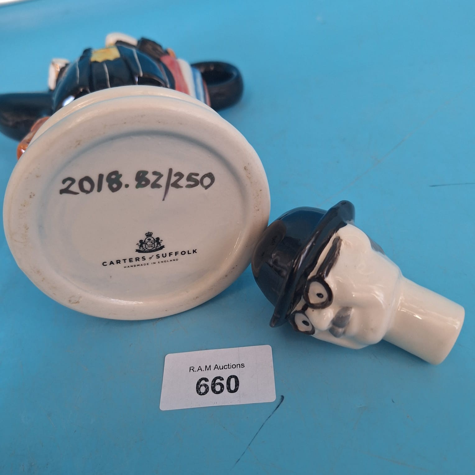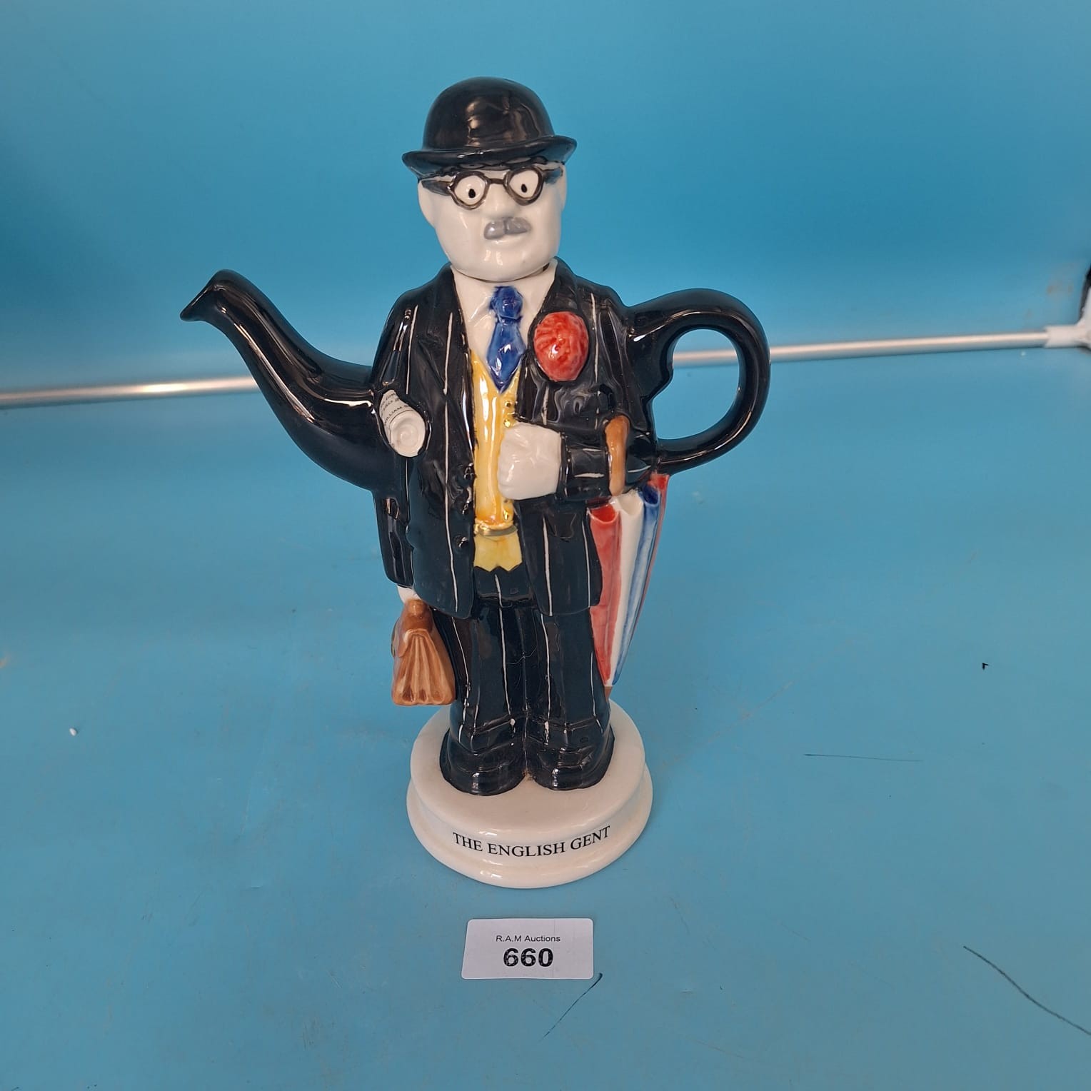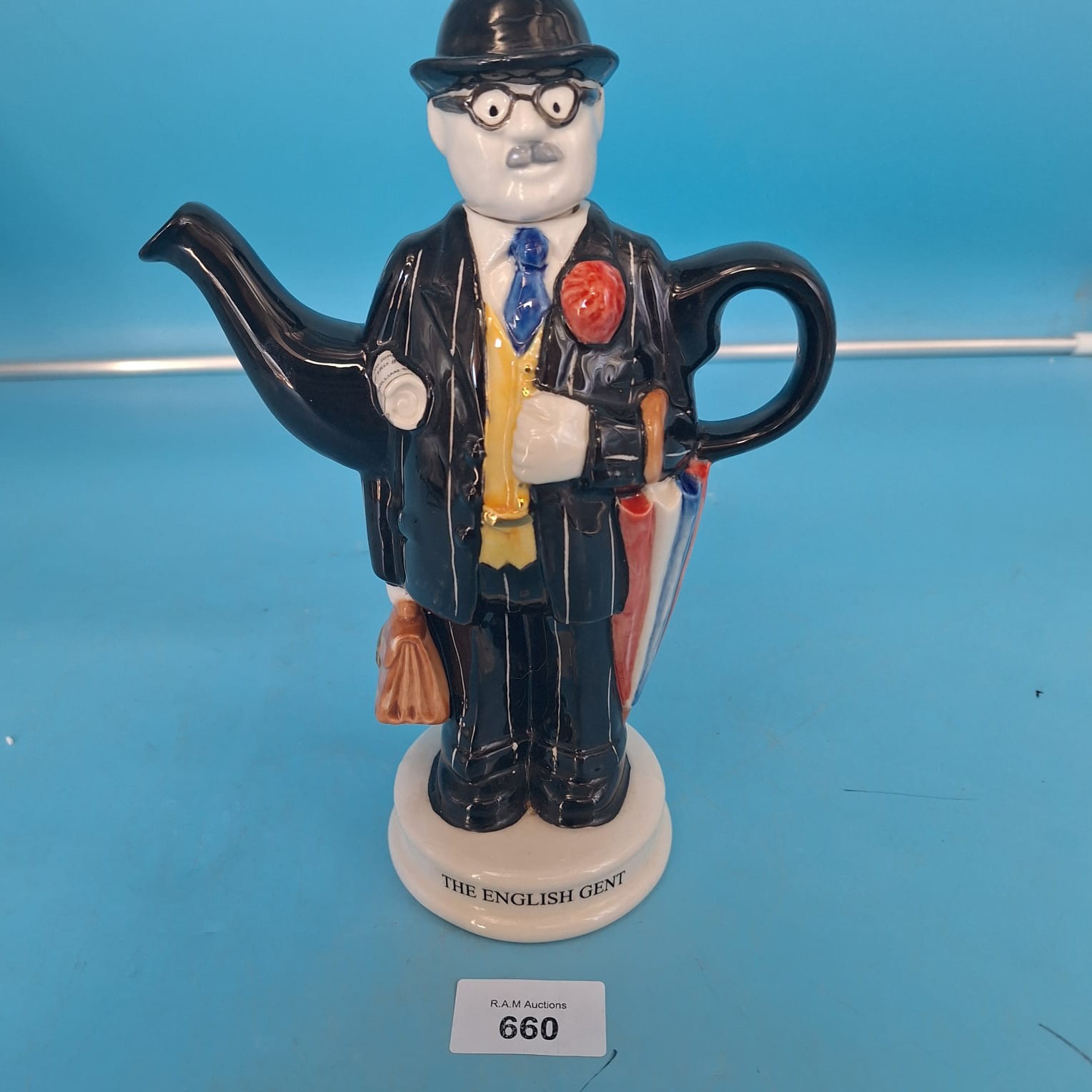 A handcrafted ceramic teapot from Carters of Suffolk, depicting an English gentleman in a pinstripe suit, bowler hat, and glasses, carrying a briefcase, flower, and umbrella.