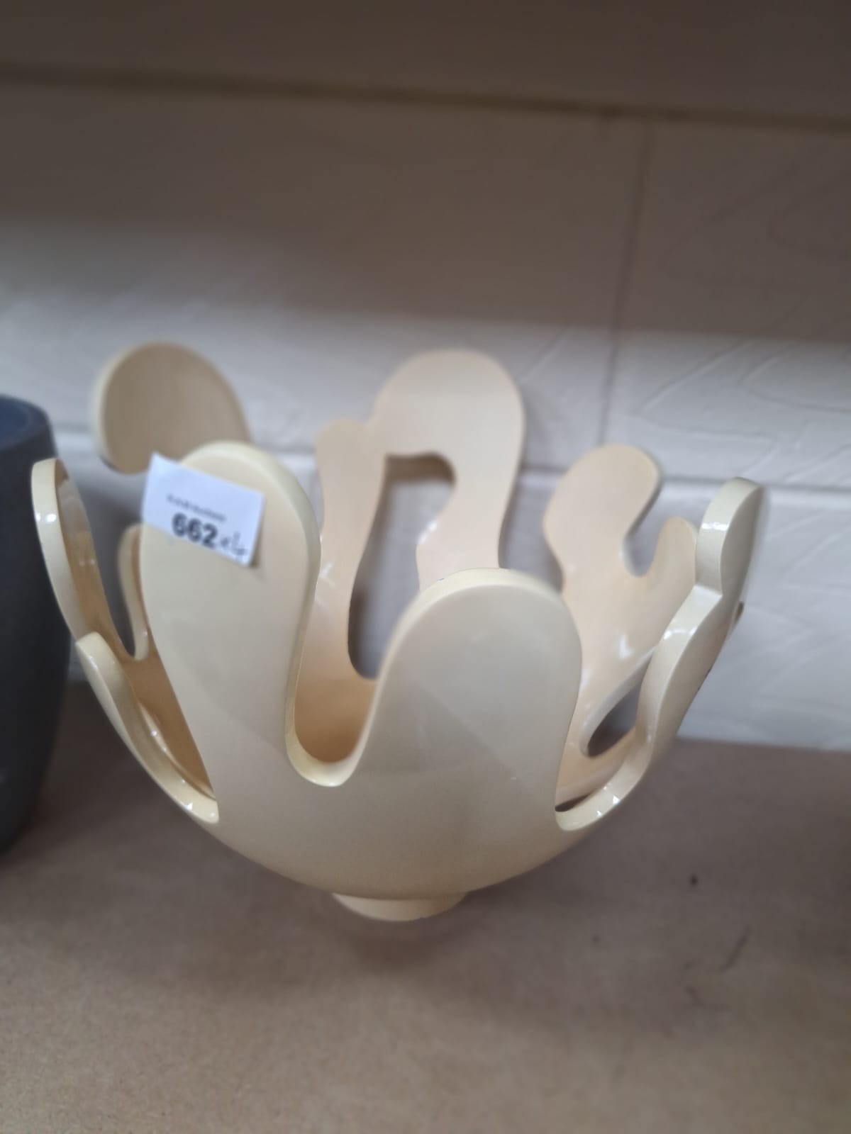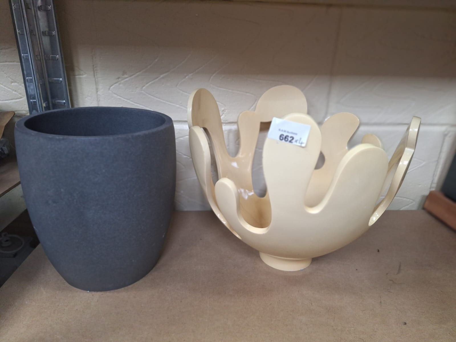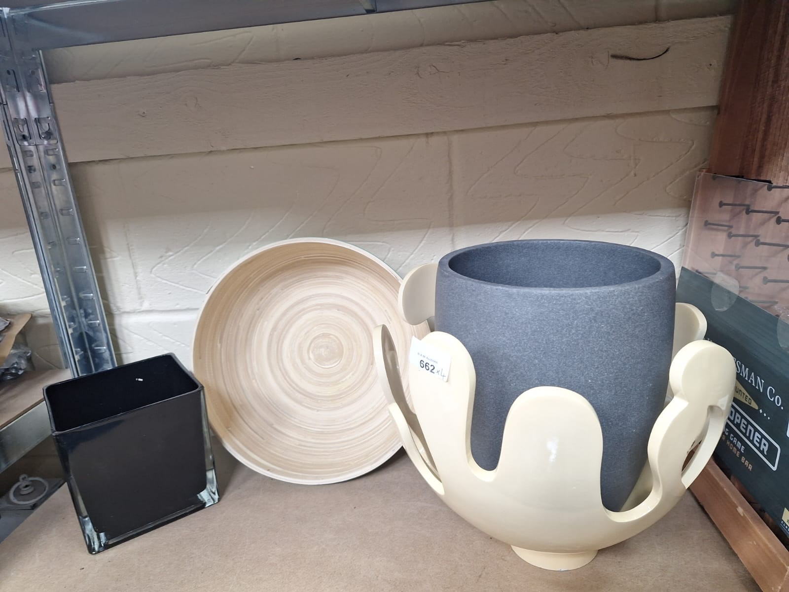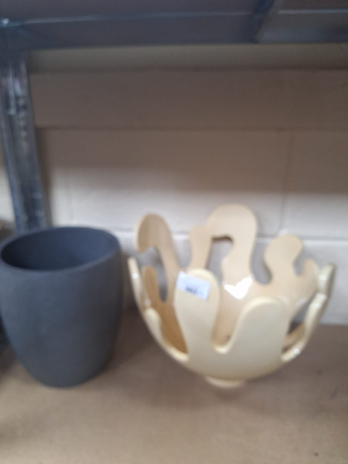 Lot includes a woven bowl, a dark gray cylindrical planter, and a cream-colored abstract planter holder.