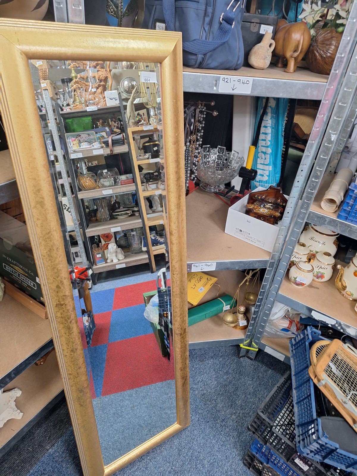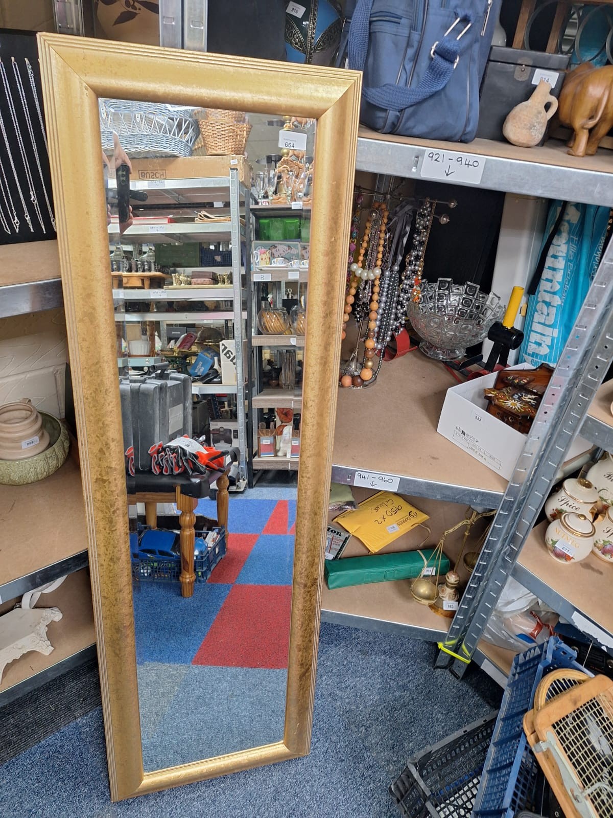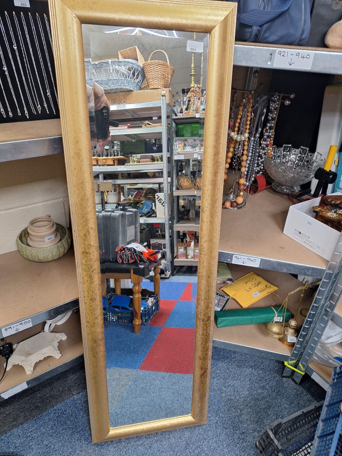 A tall, narrow mirror with a textured gold-colored frame.
