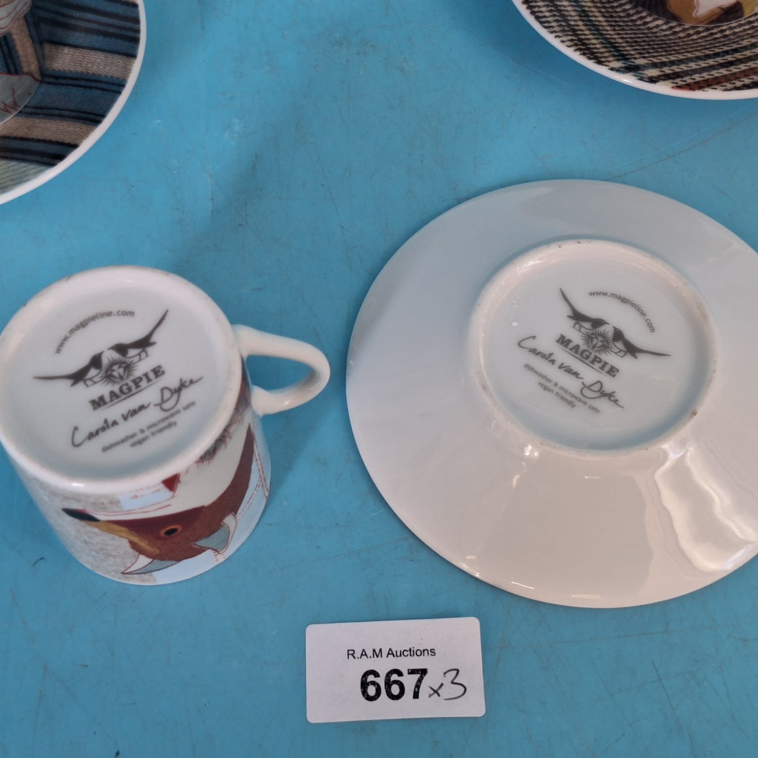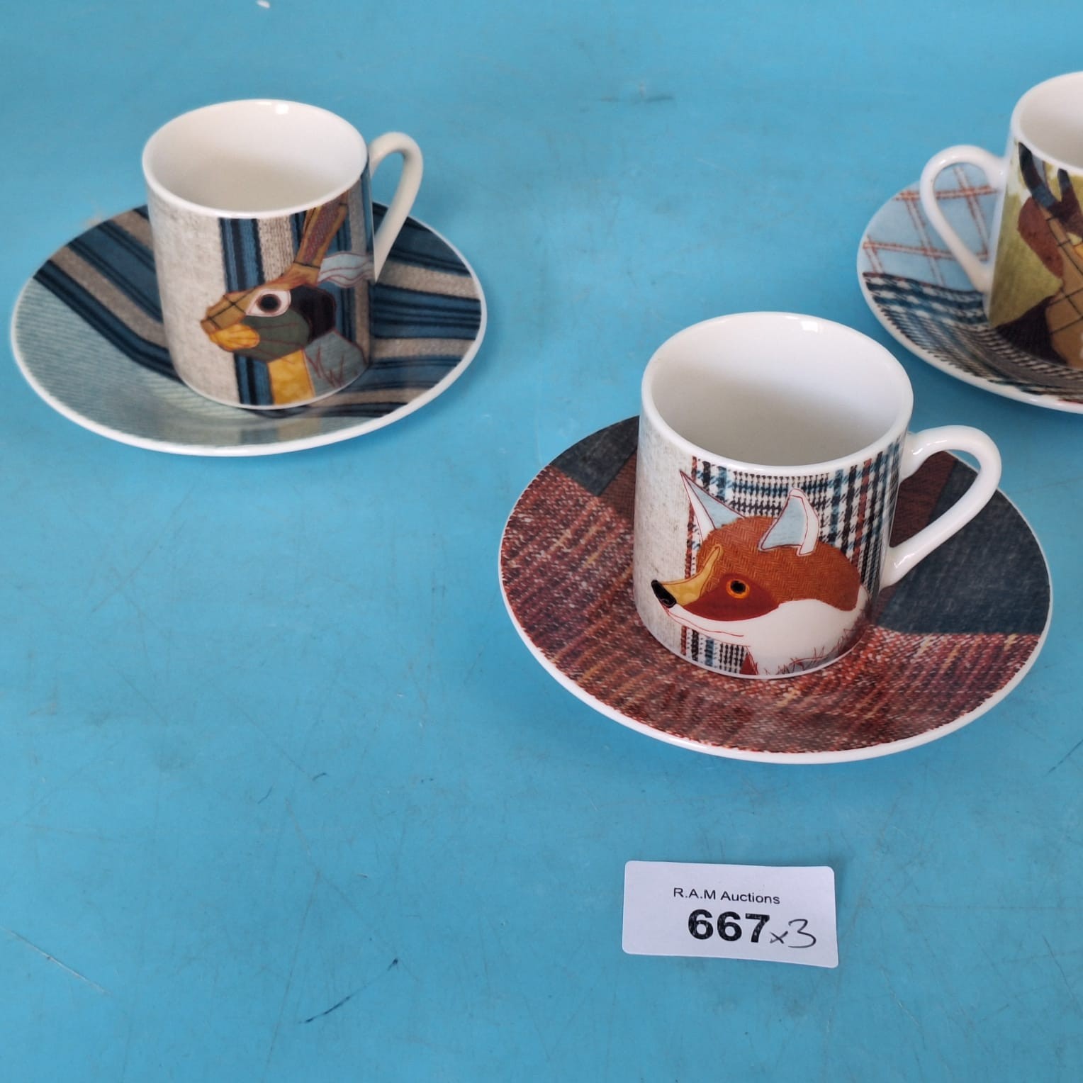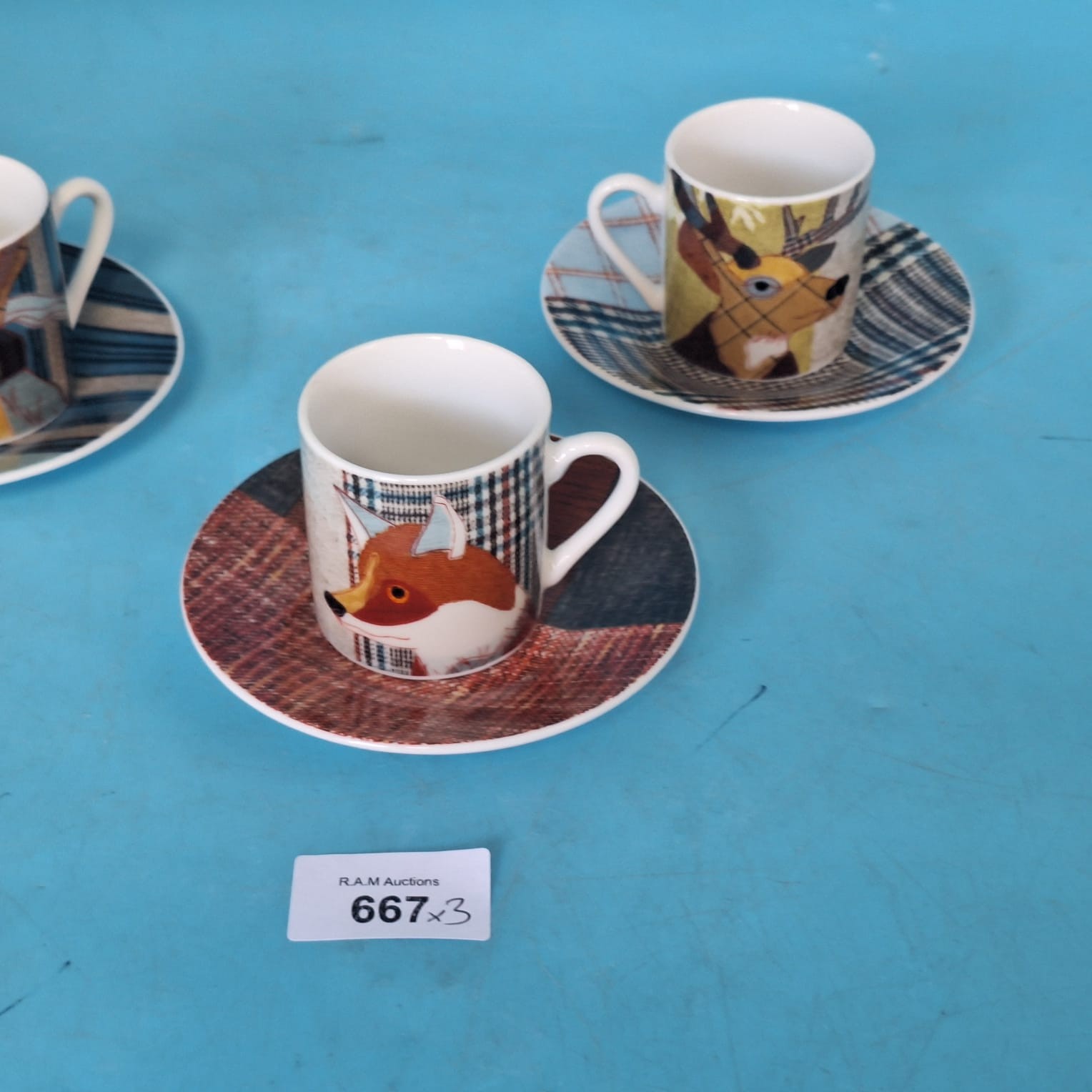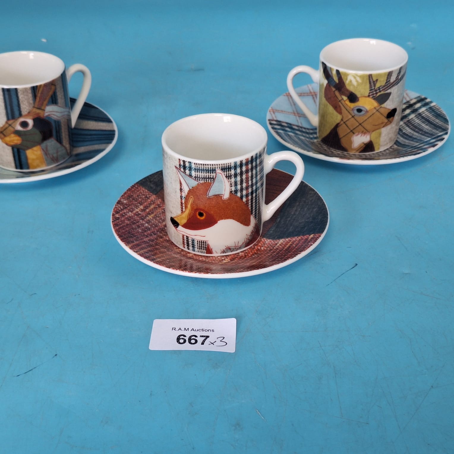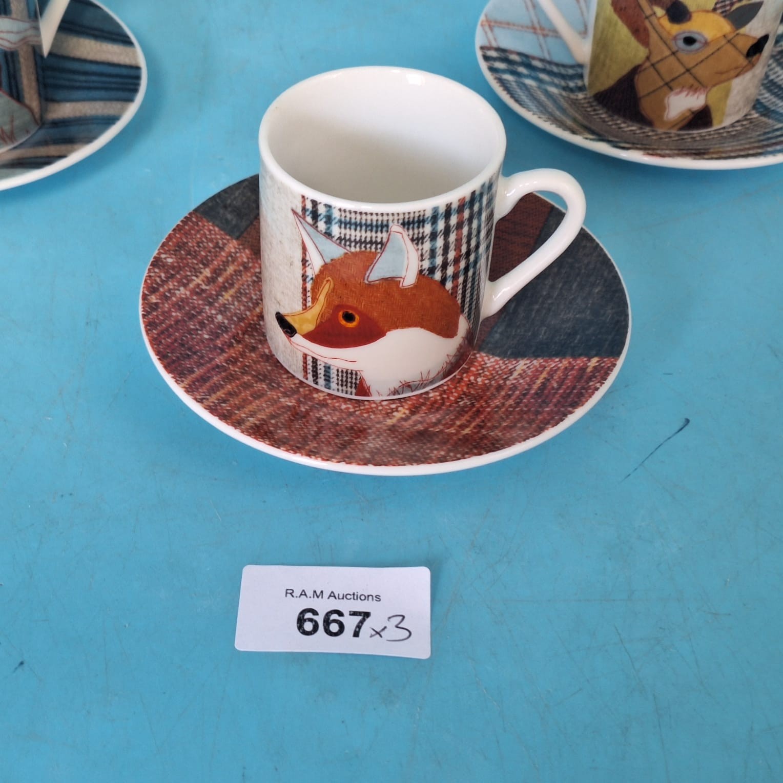 Porcelain espresso cup and saucer set featuring animal heads and plaid designs.