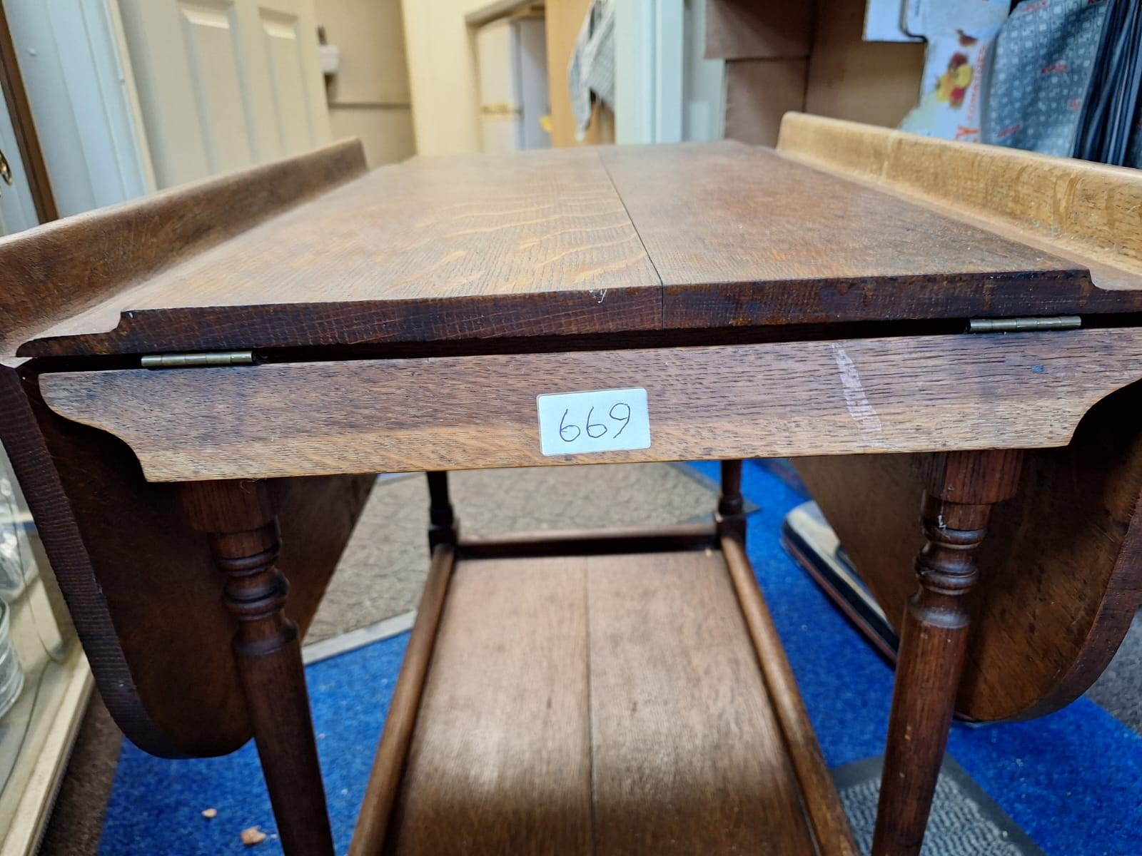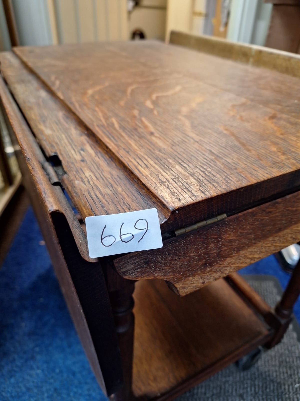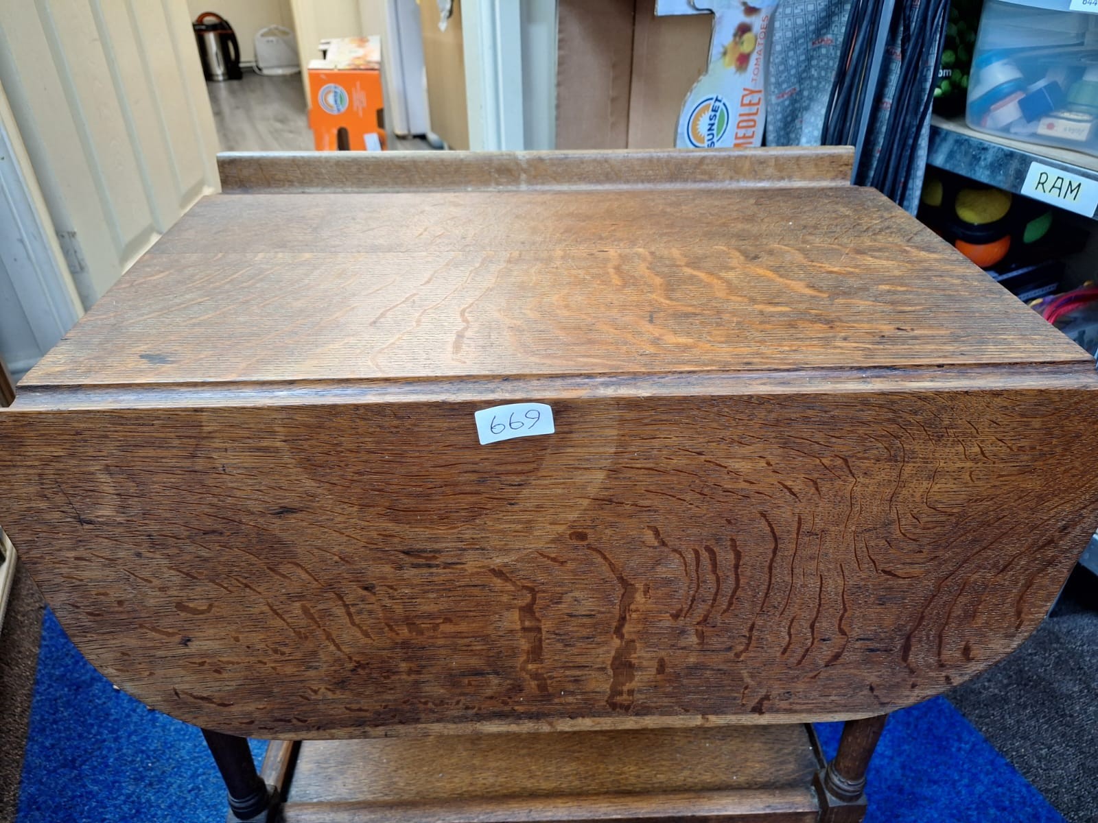Dark brown wooden drop-leaf serving cart with turned legs and brass hinges.