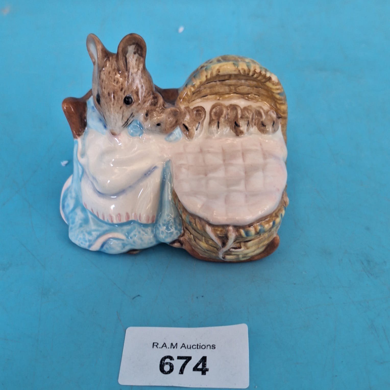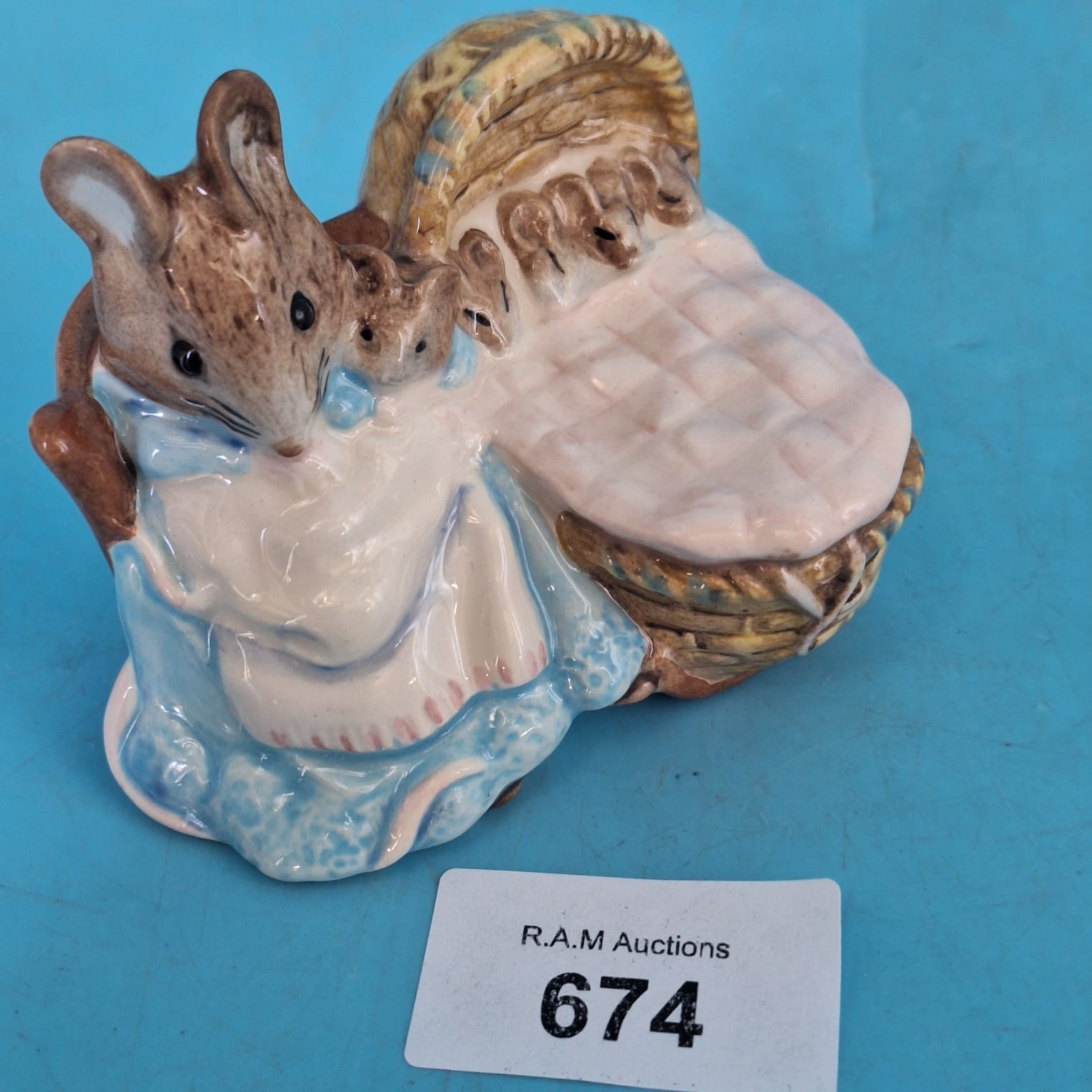 Royal Albert ceramic figurine of Hunca Munca with a cradle, based on Beatrix Potter’s work.