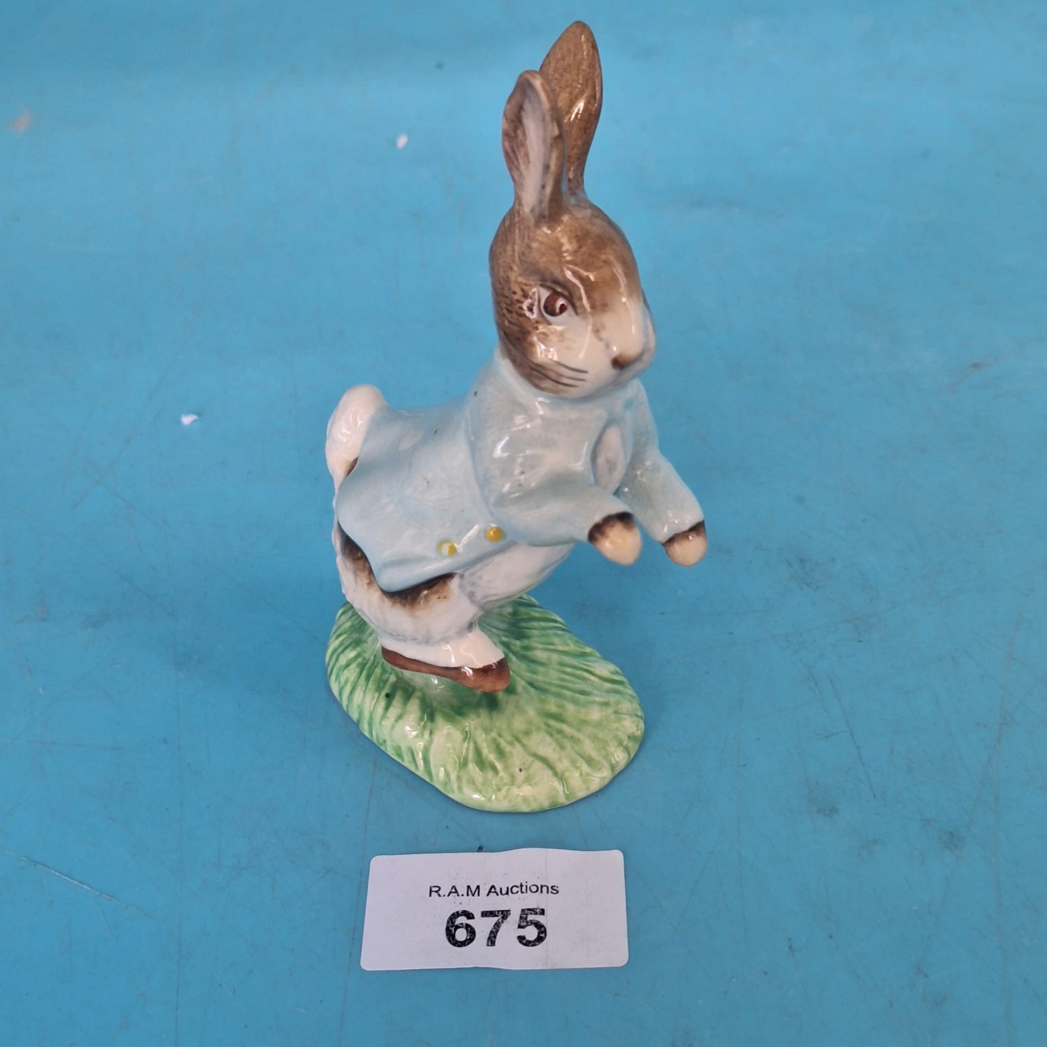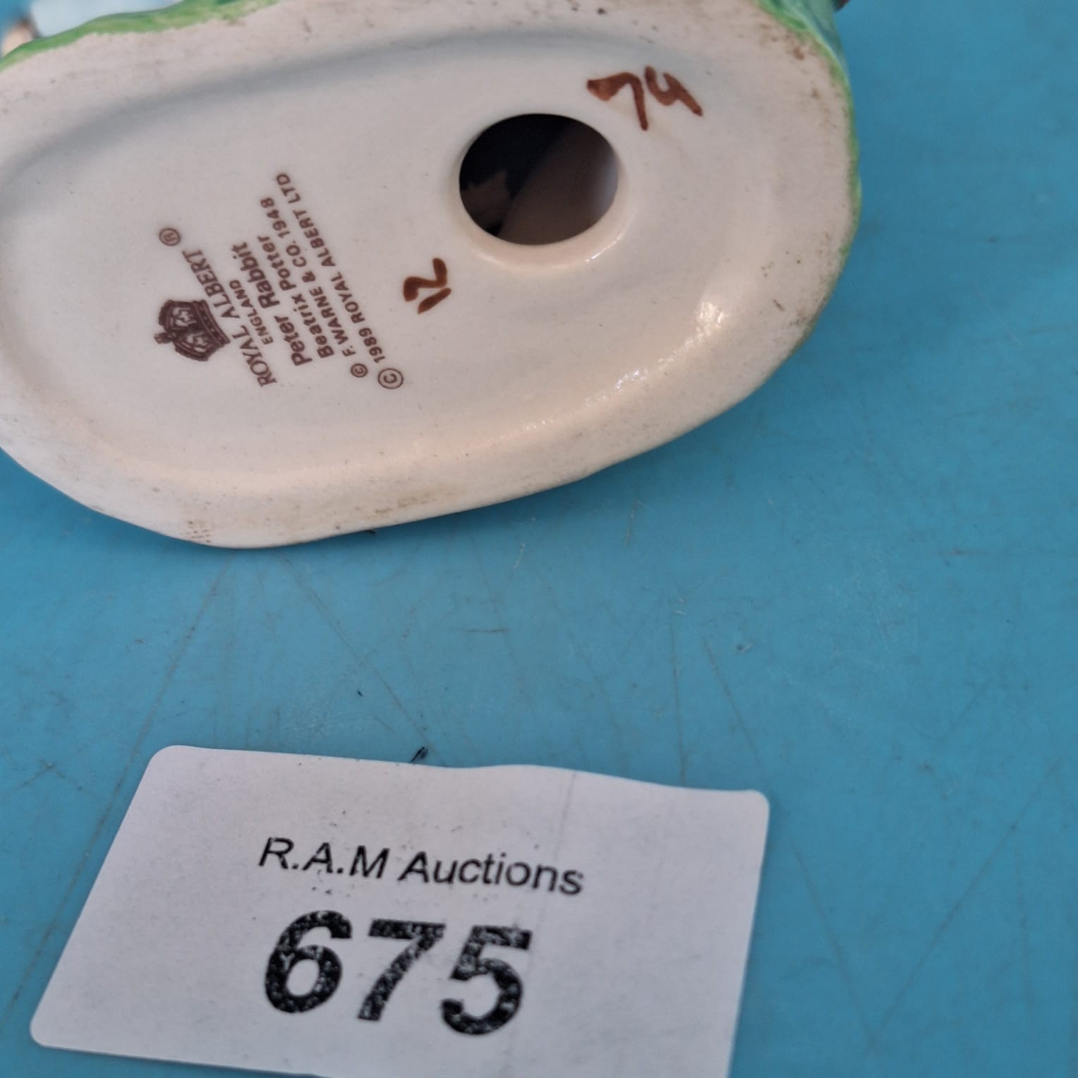 Royal Albert porcelain figurine of Peter Rabbit in a light blue jacket, standing with paws raised on a green grass base, made in England.