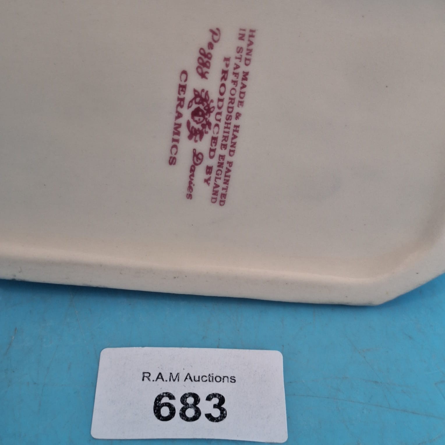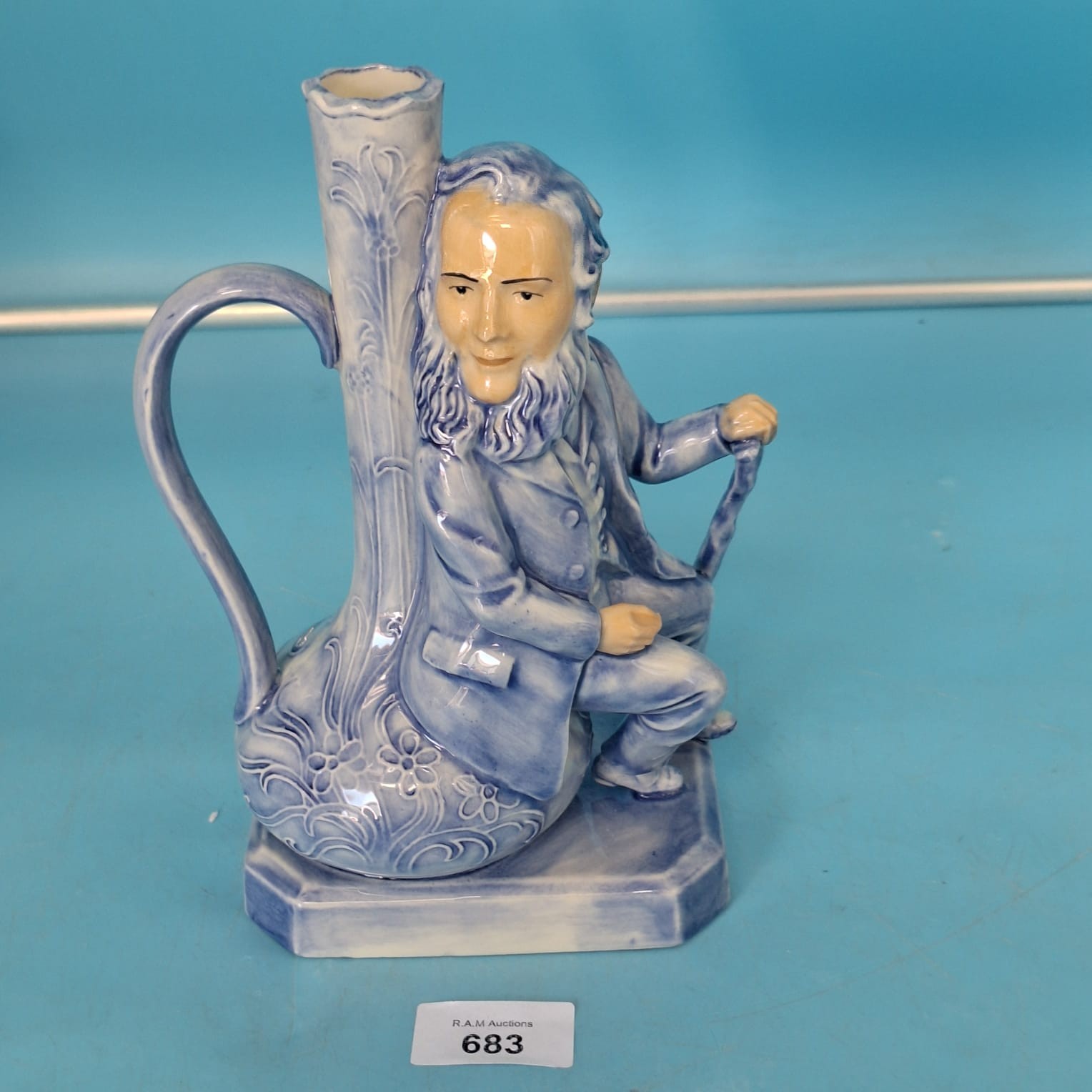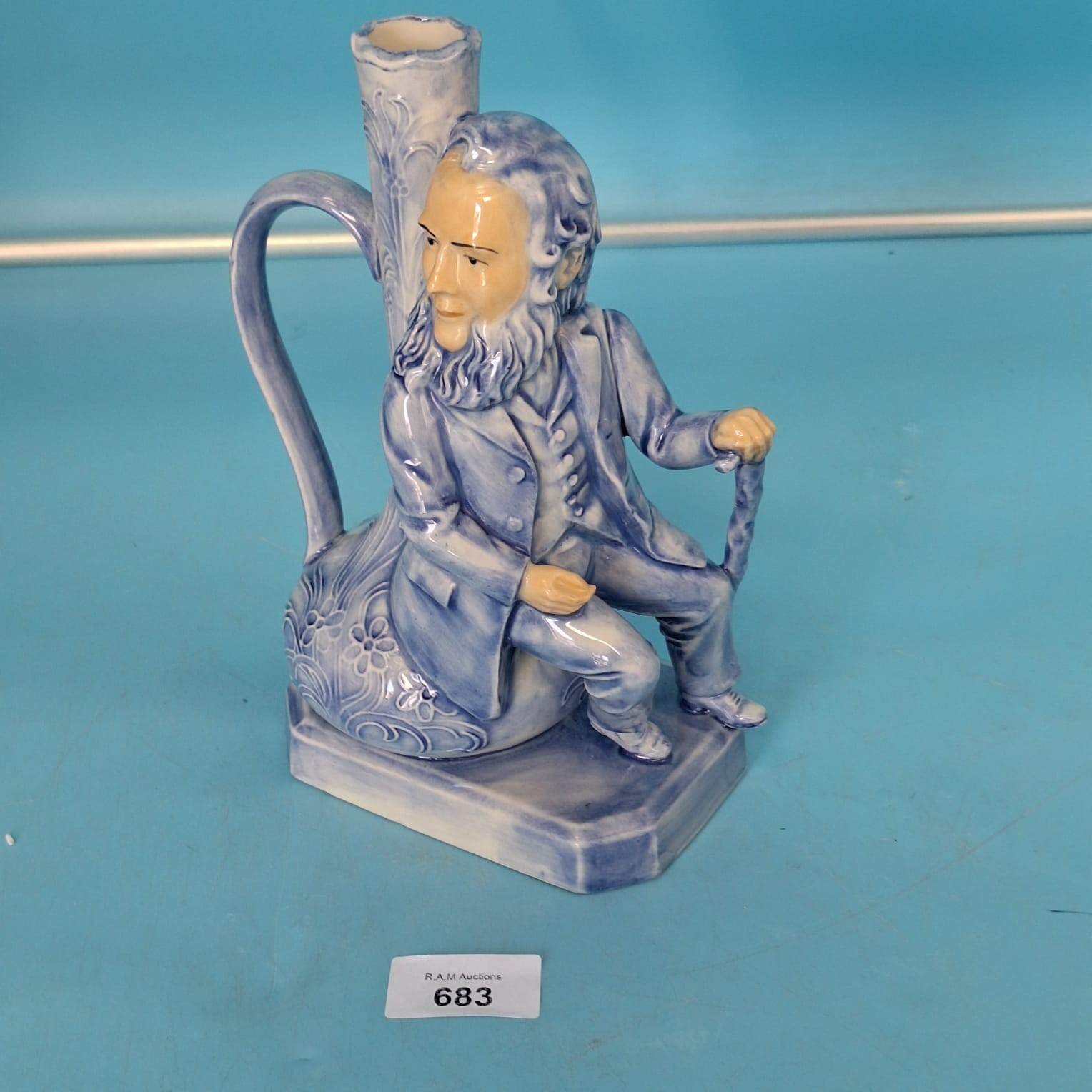 Blue and white ceramic jug depicting a seated man with a beard holding a cane, hand-painted in Staffordshire, England.