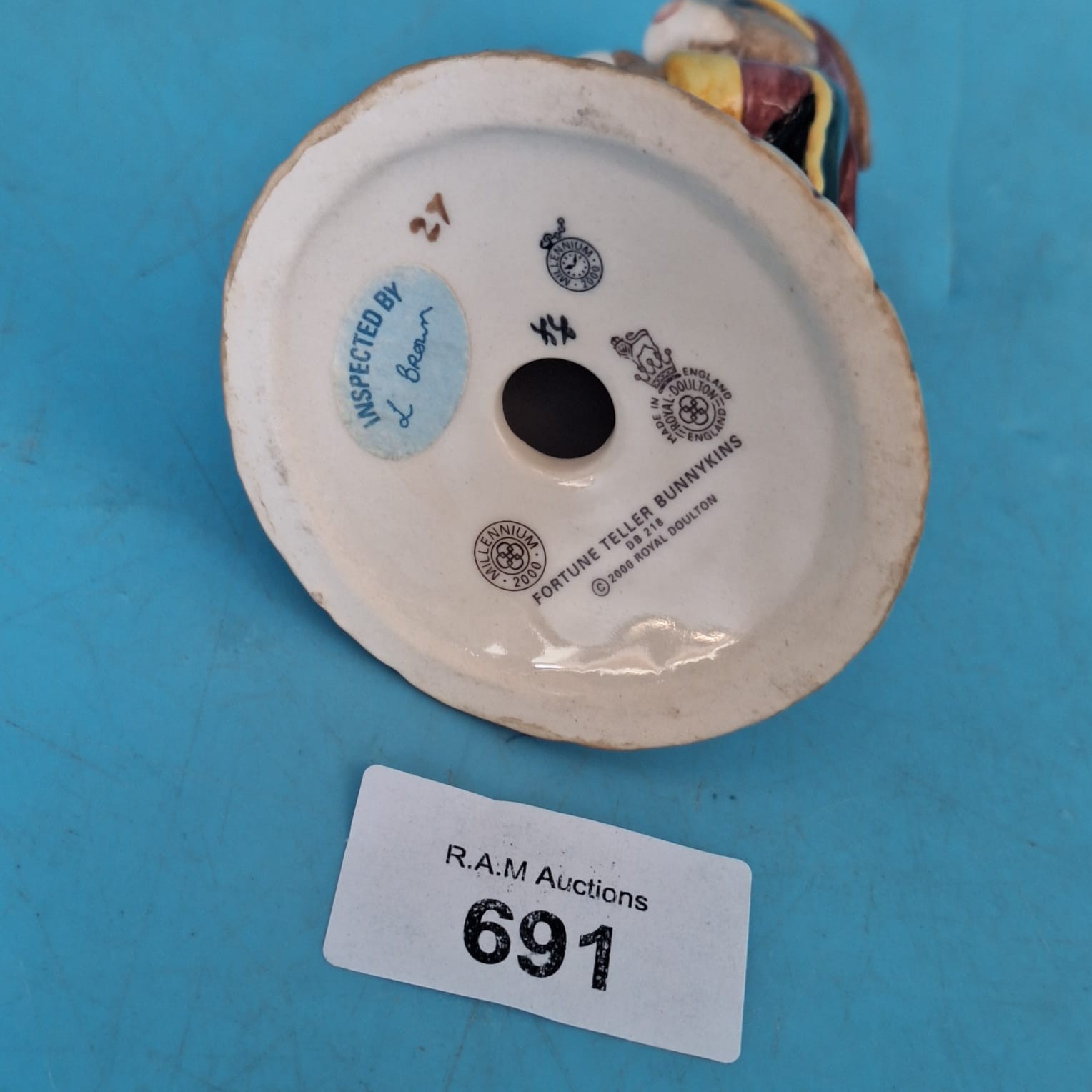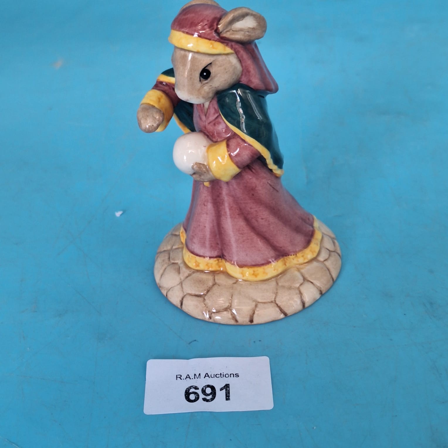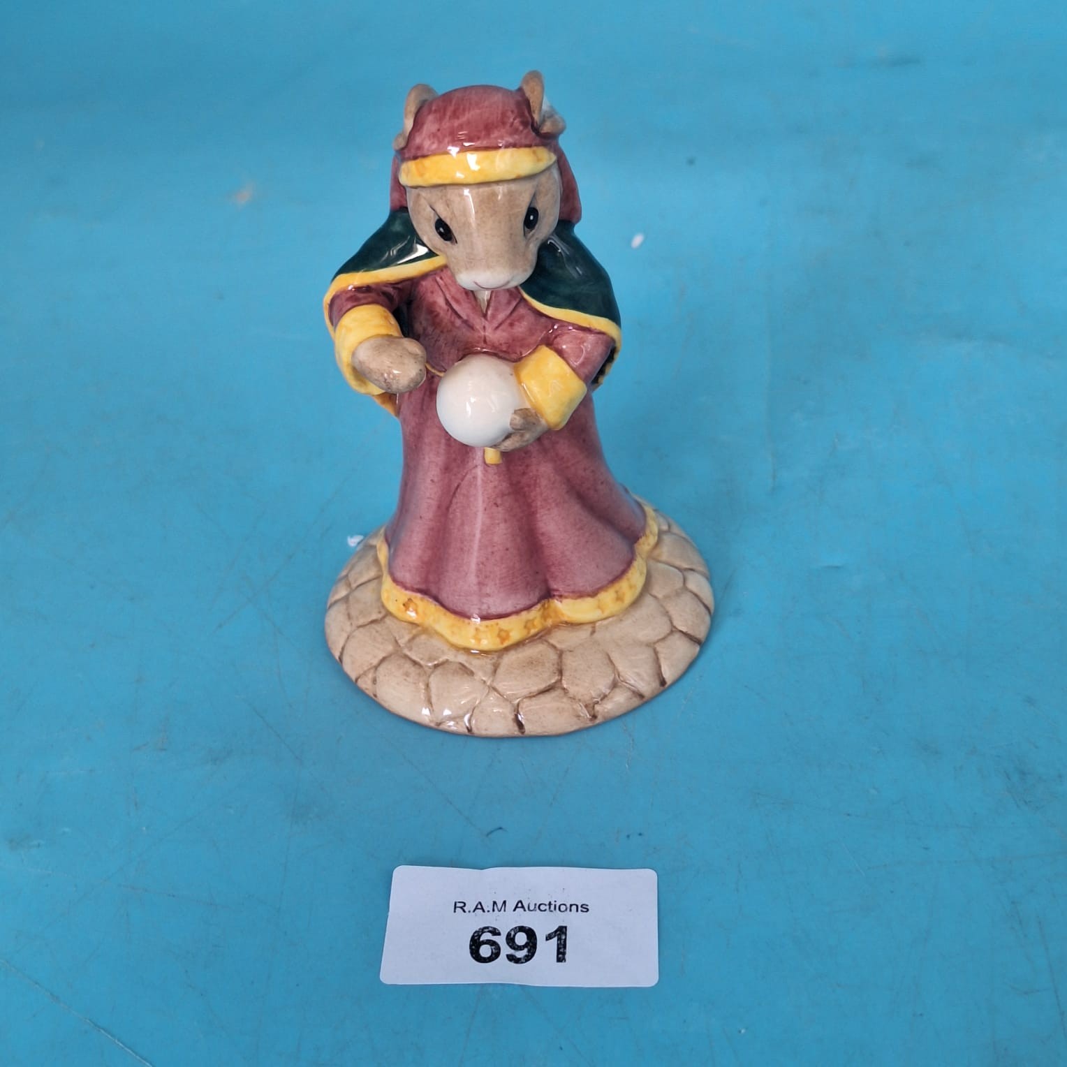 Ceramic figurine of a mouse-like creature in a maroon robe, green cape, and yellow trim, holding a white sphere on a stone-colored base.