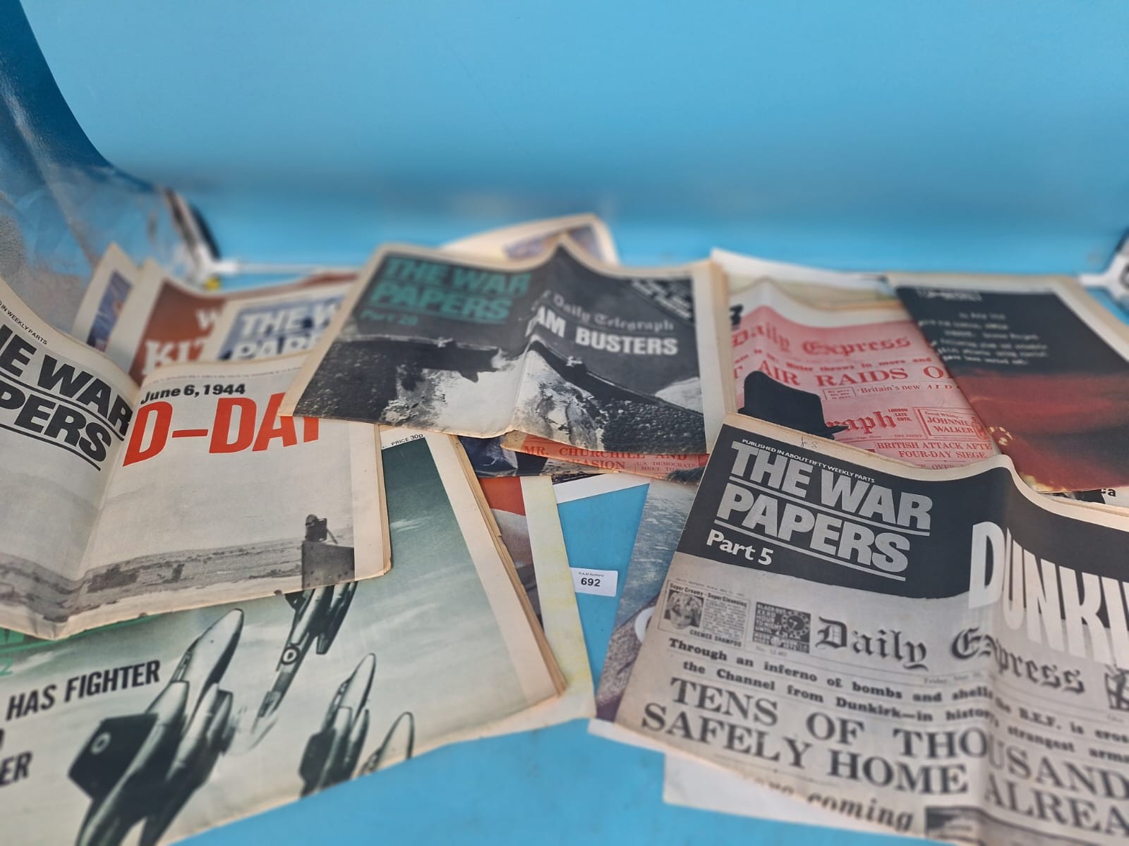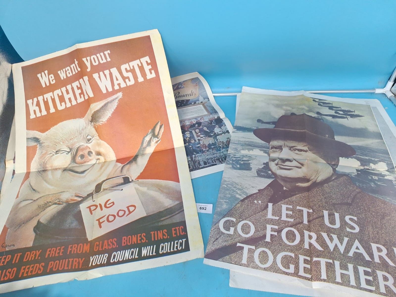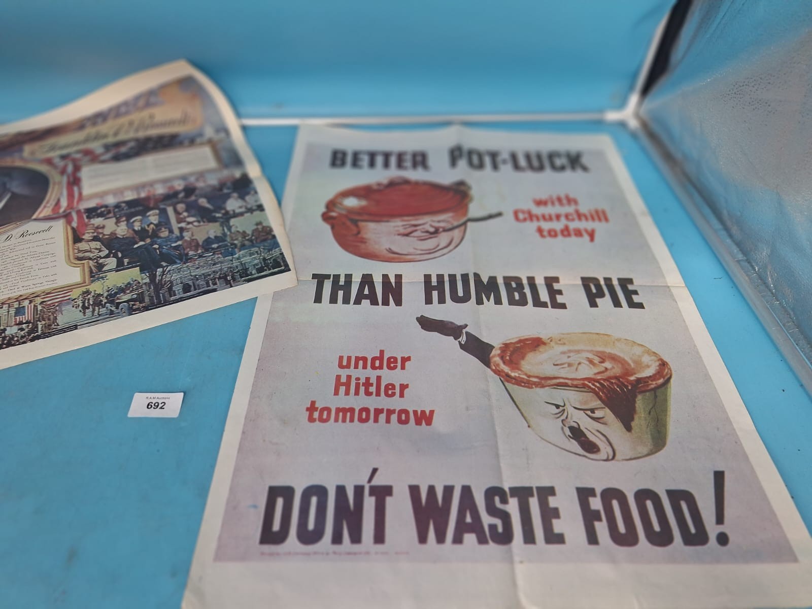 Collection of historical printed materials including newspapers and propaganda posters from World War II.
