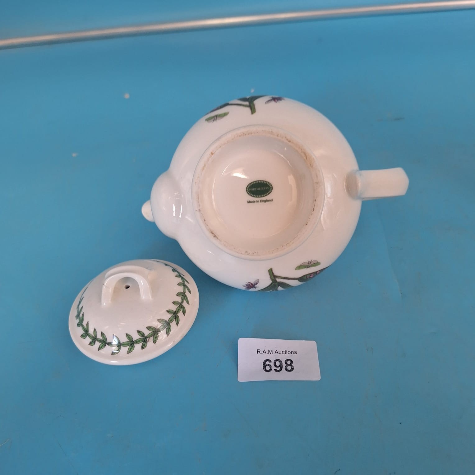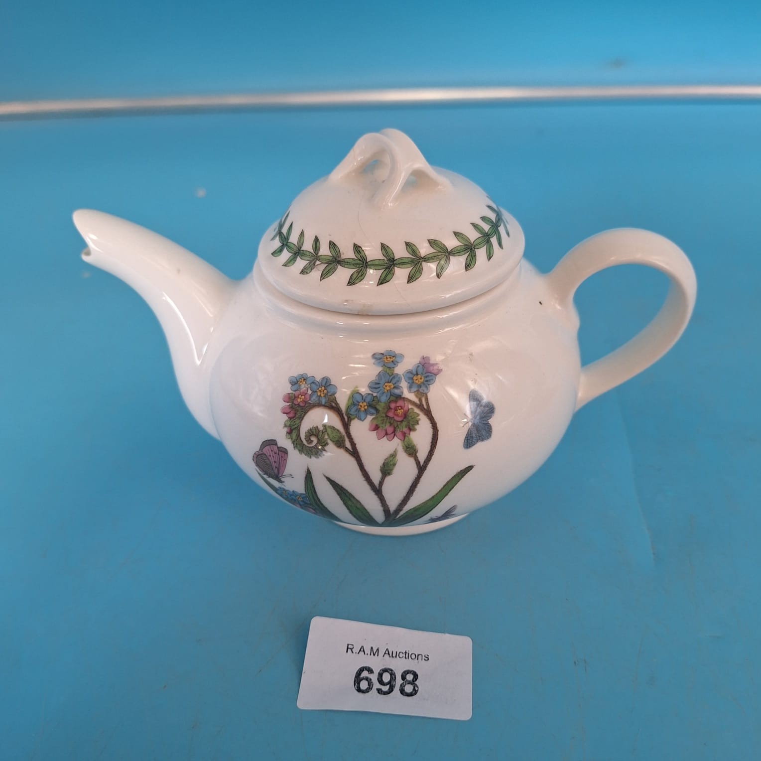 White porcelain teapot with forget-me-not floral design, blue, pink, and green accents, curved spout, curved handle, and green garland lid border.