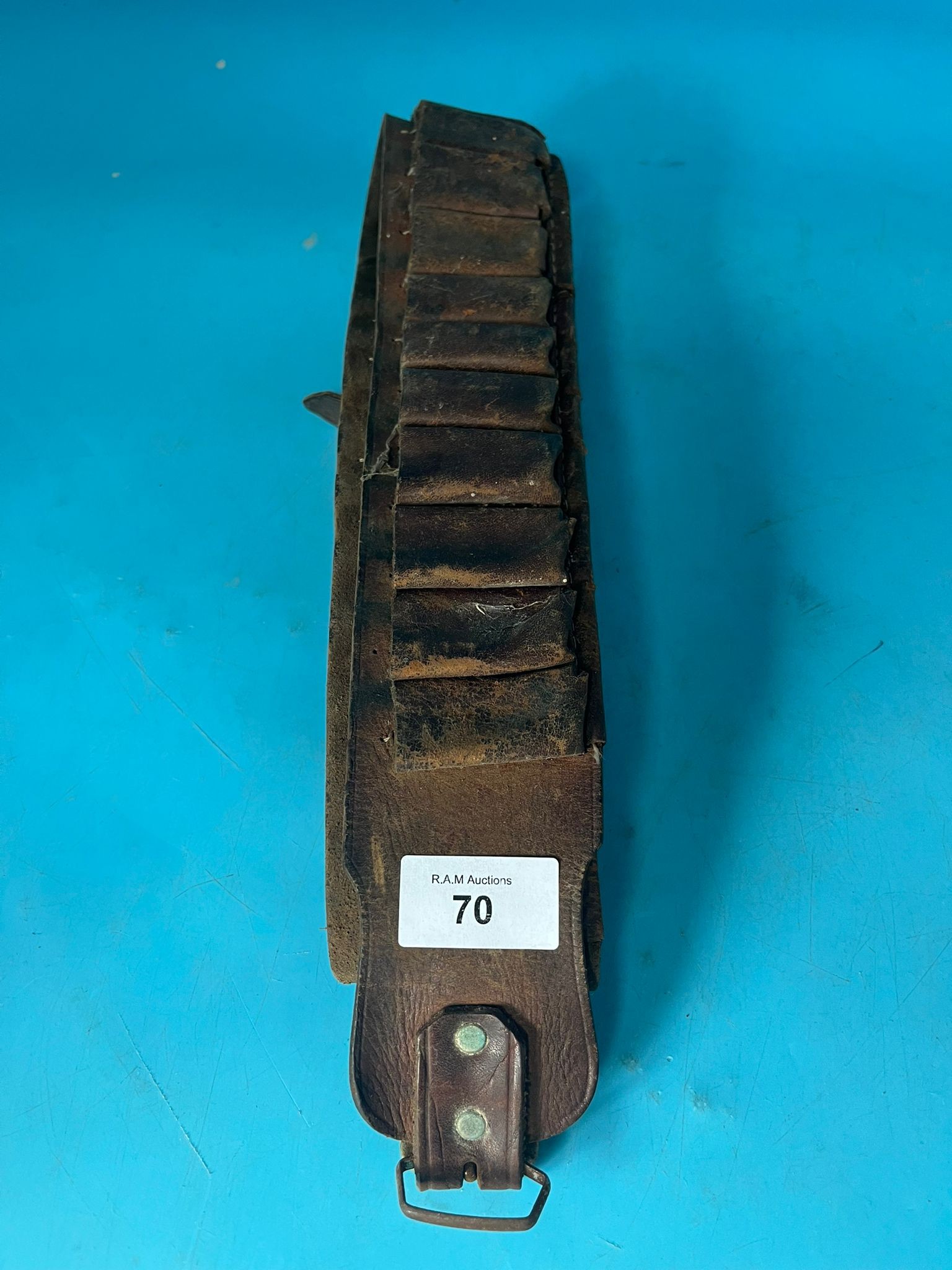 A worn brown leather cartridge belt with multiple compartments and a metal buckle.
