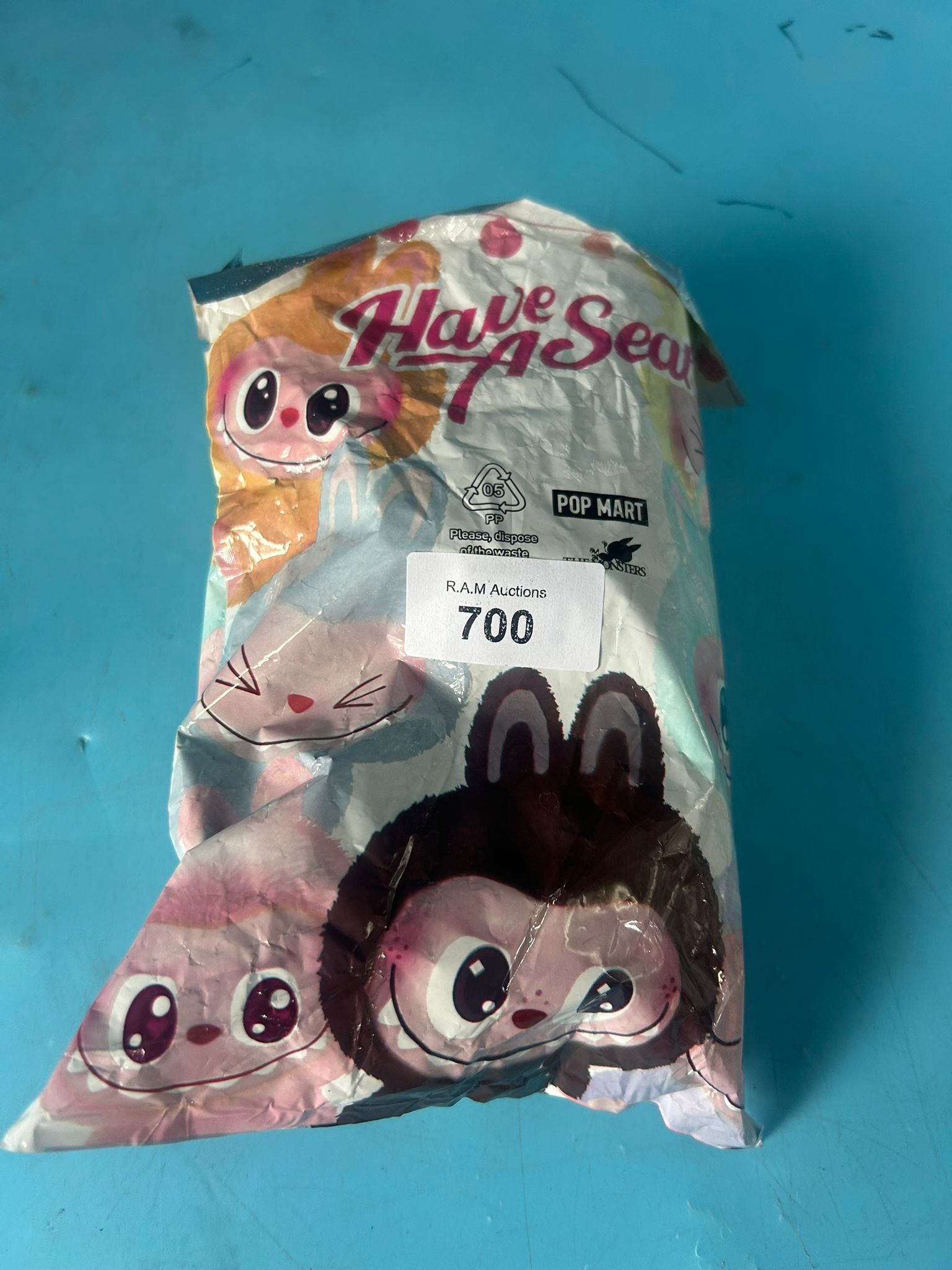 A crumpled pink, white, and brown plastic bag with cartoon illustrations, featuring “Have a Sea” and “POP MART” text.