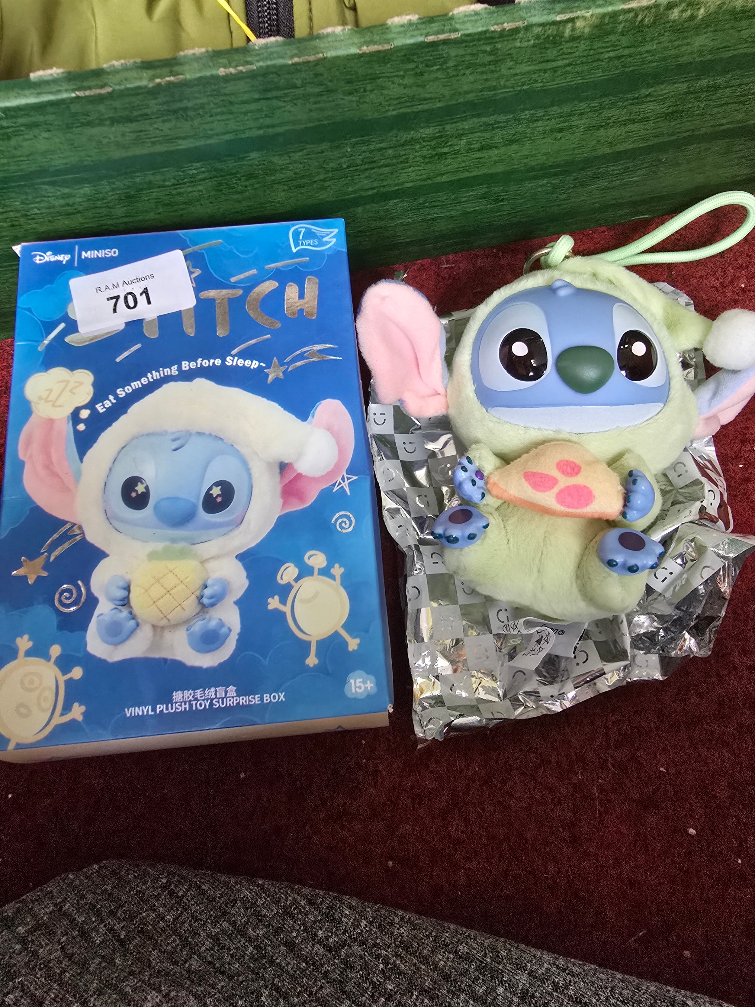 Light green Stitch plush keychain in a hooded outfit holding a pizza slice, packaged in a silver foil wrapper and a blue box with Disney MINISO branding.