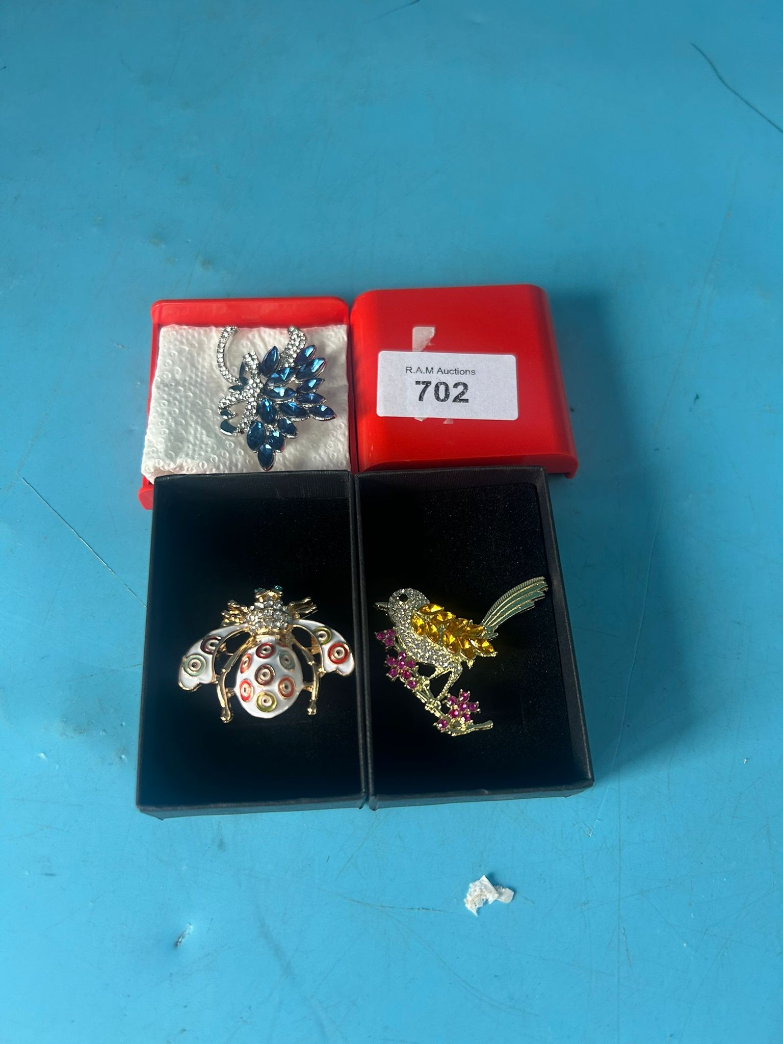 Silver-toned metal brooches with rhinestone embellishments in floral, insect, and bird designs.