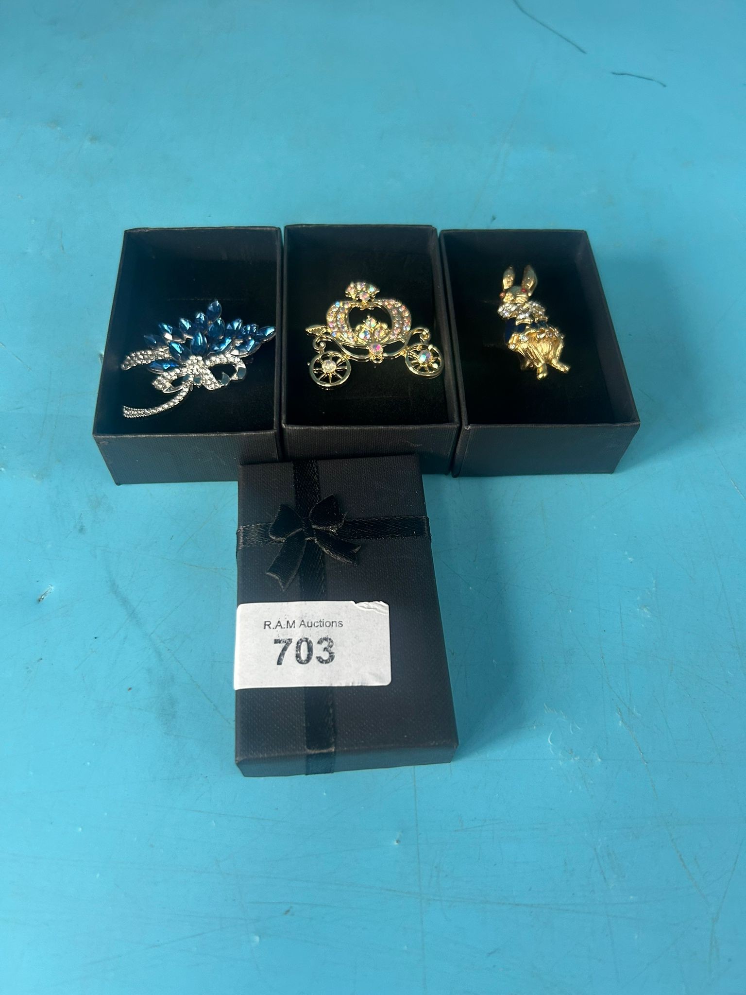 Metal brooches with colored stones and crystals, including floral, carriage, and rabbit motifs.