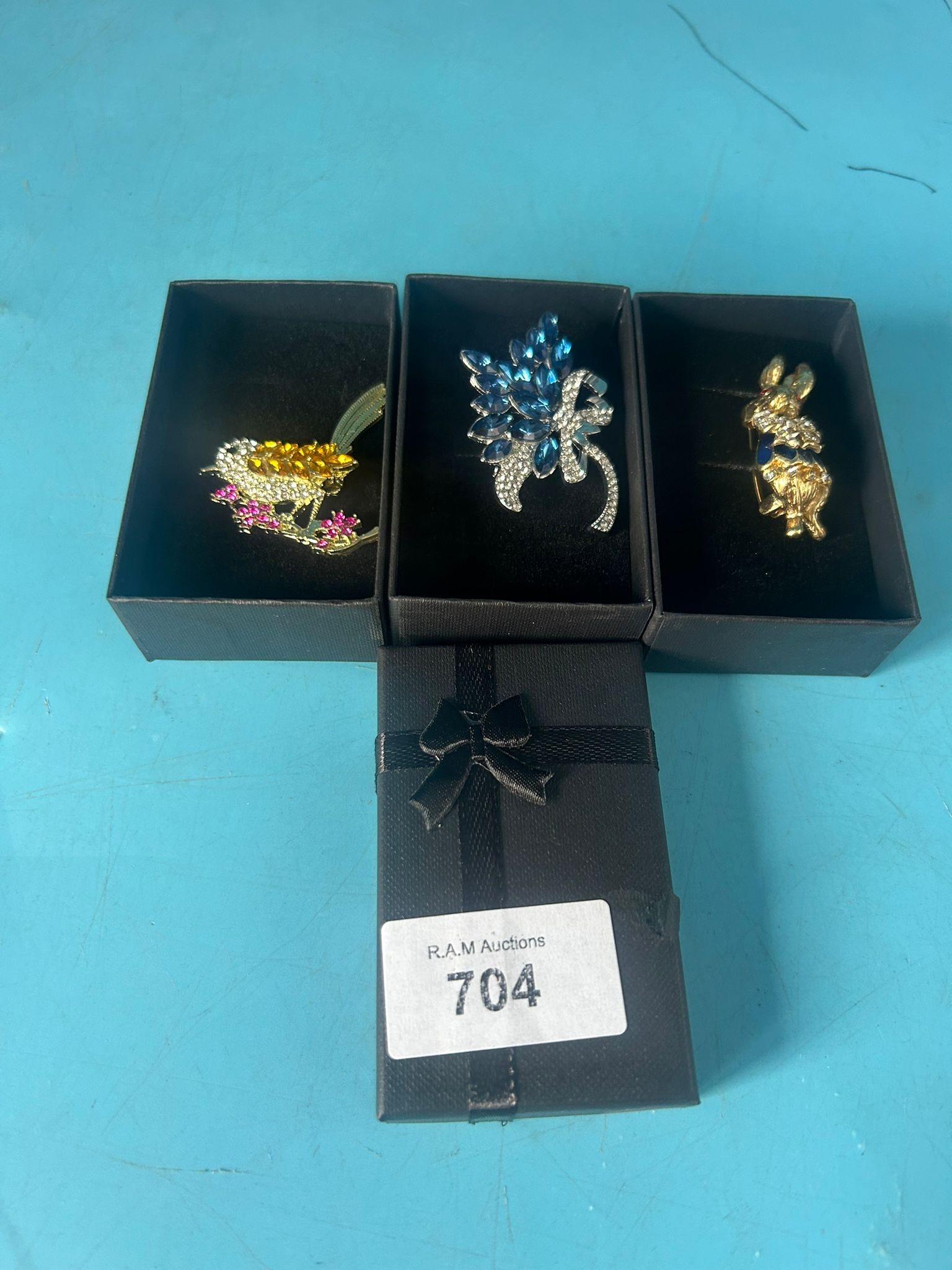 A collection of three brooches featuring a bird with pink and clear rhinestones, a floral design with blue and clear rhinestones, and a stylized animal with gold and clear rhinestones.