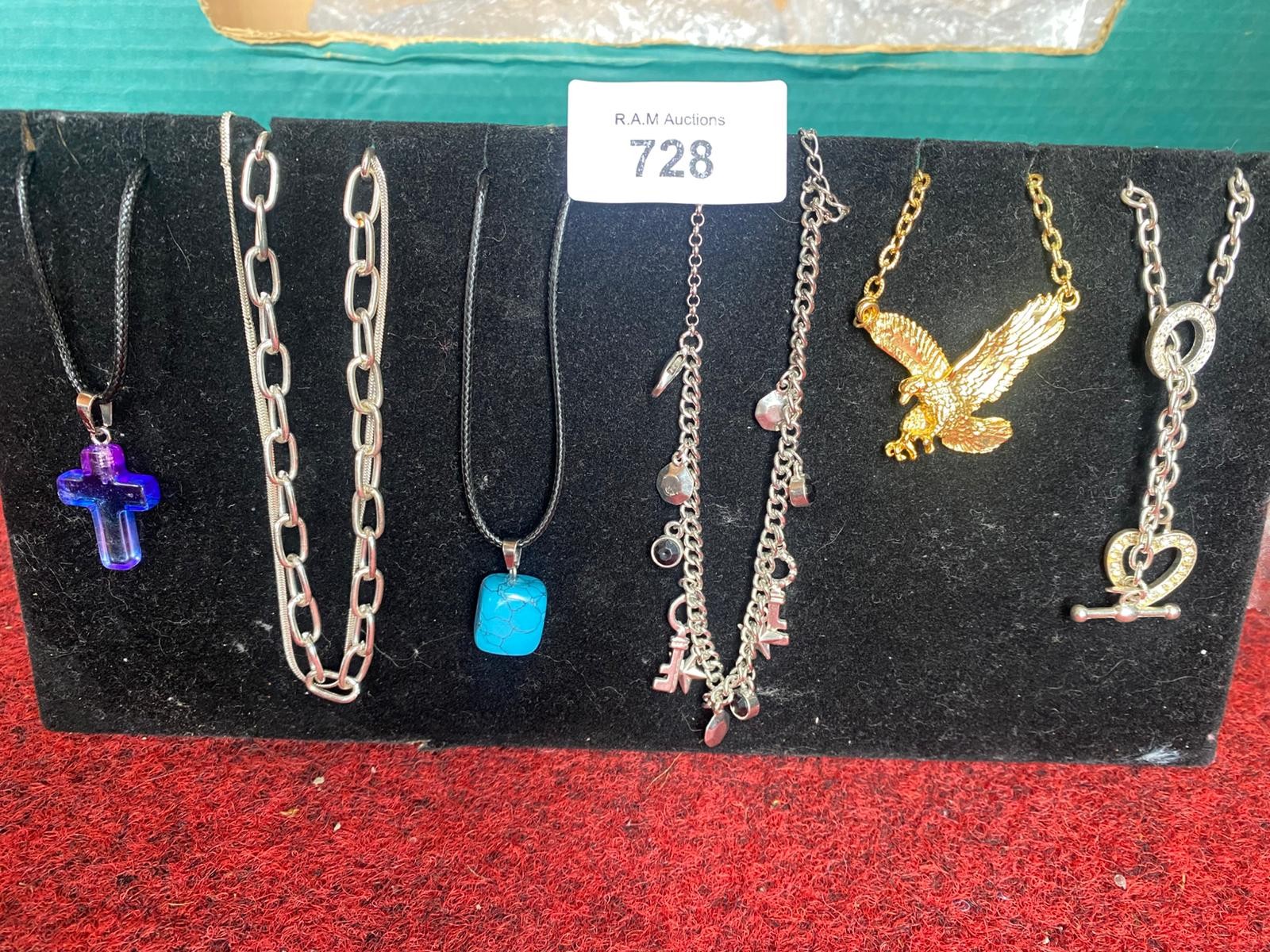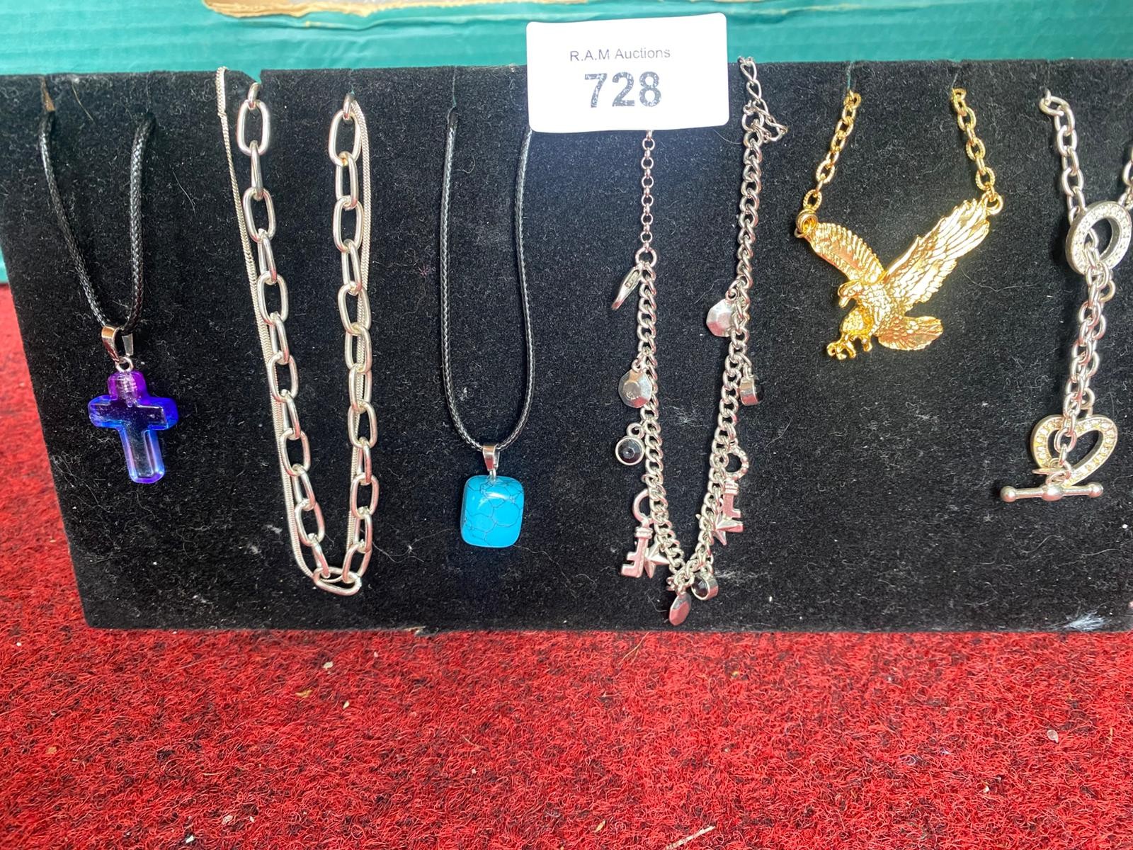 A collection of necklaces featuring various pendants including a cross, oval links, turquoise square, charms, eagle, and keyhole, presented on a black stand.