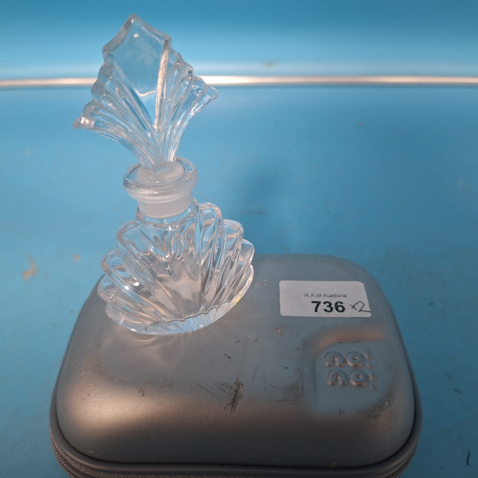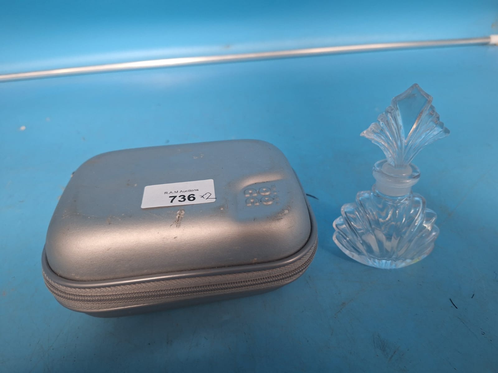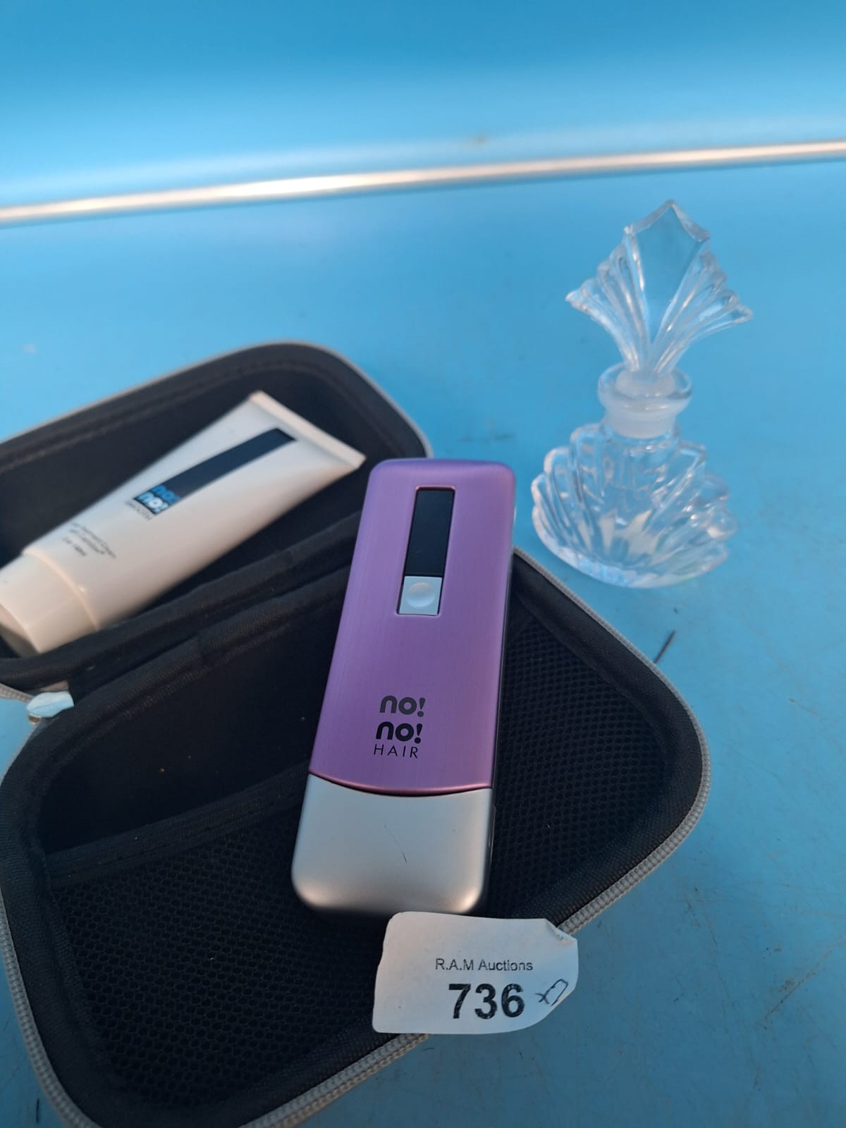 A silver-grey carrying case contains a handheld hair removal device and a tube of lotion, alongside a faceted glass perfume bottle with a fan-shaped stopper.