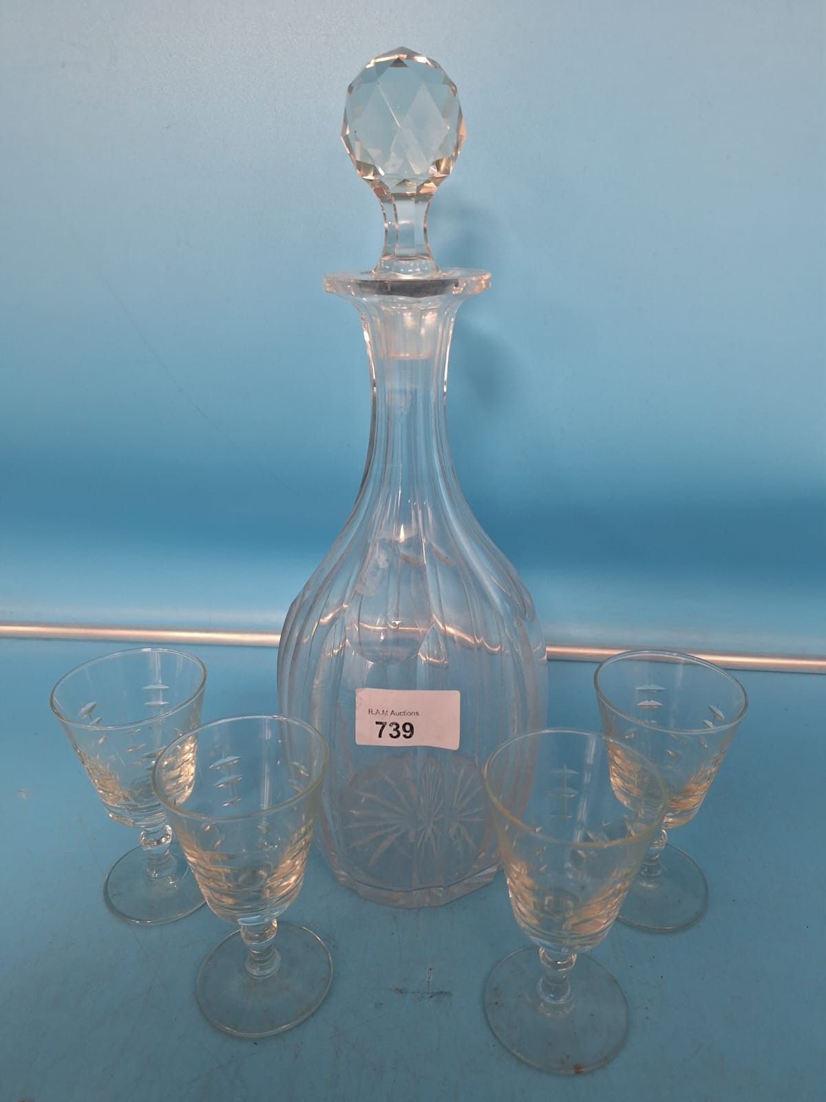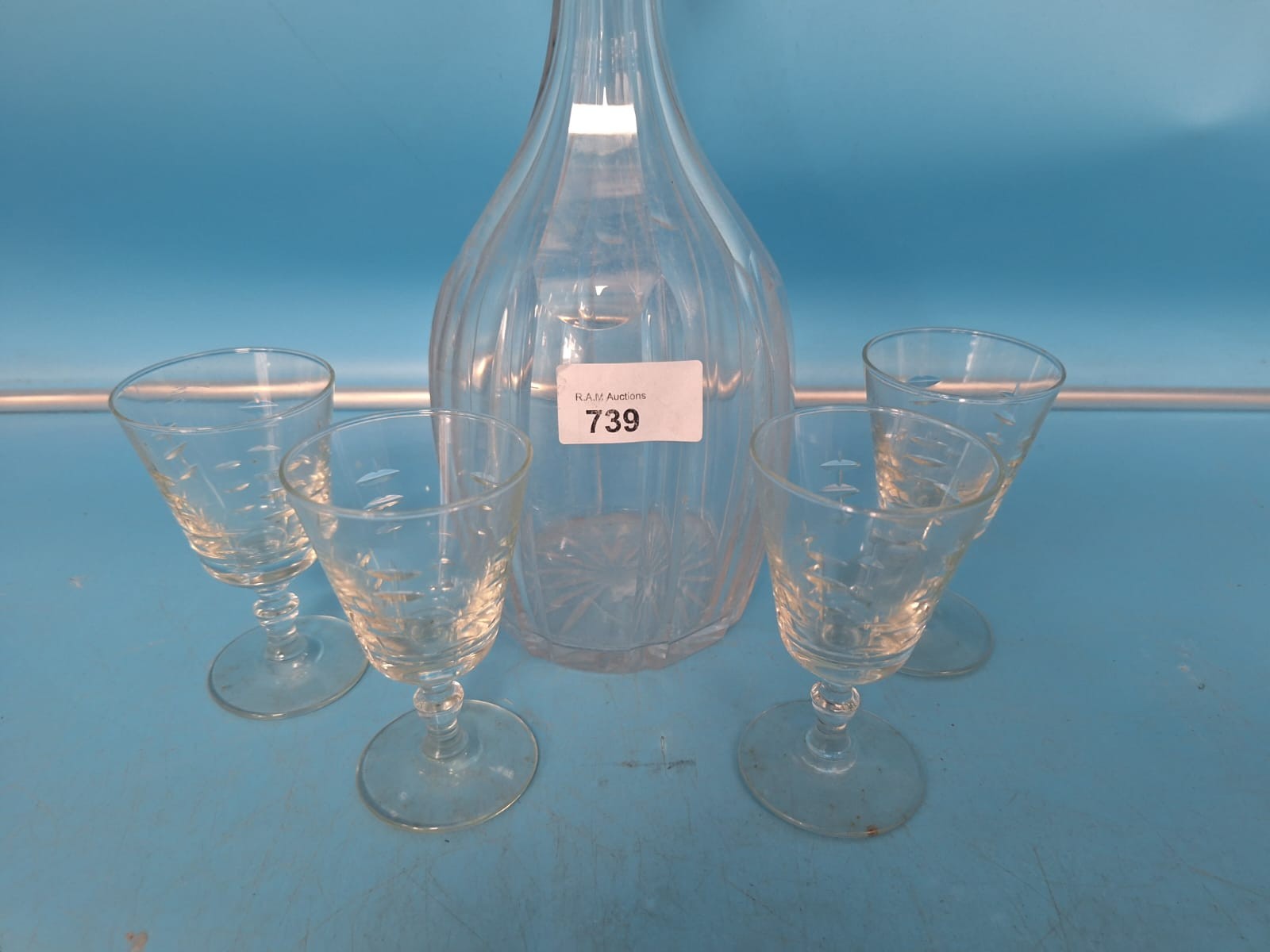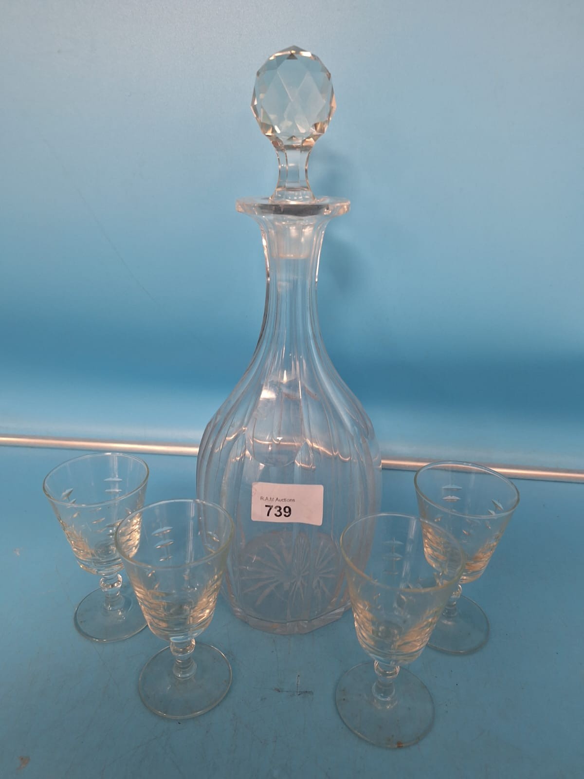 Clear glass decanter with ribbed pattern and starburst base, paired with four etched liqueur glasses.