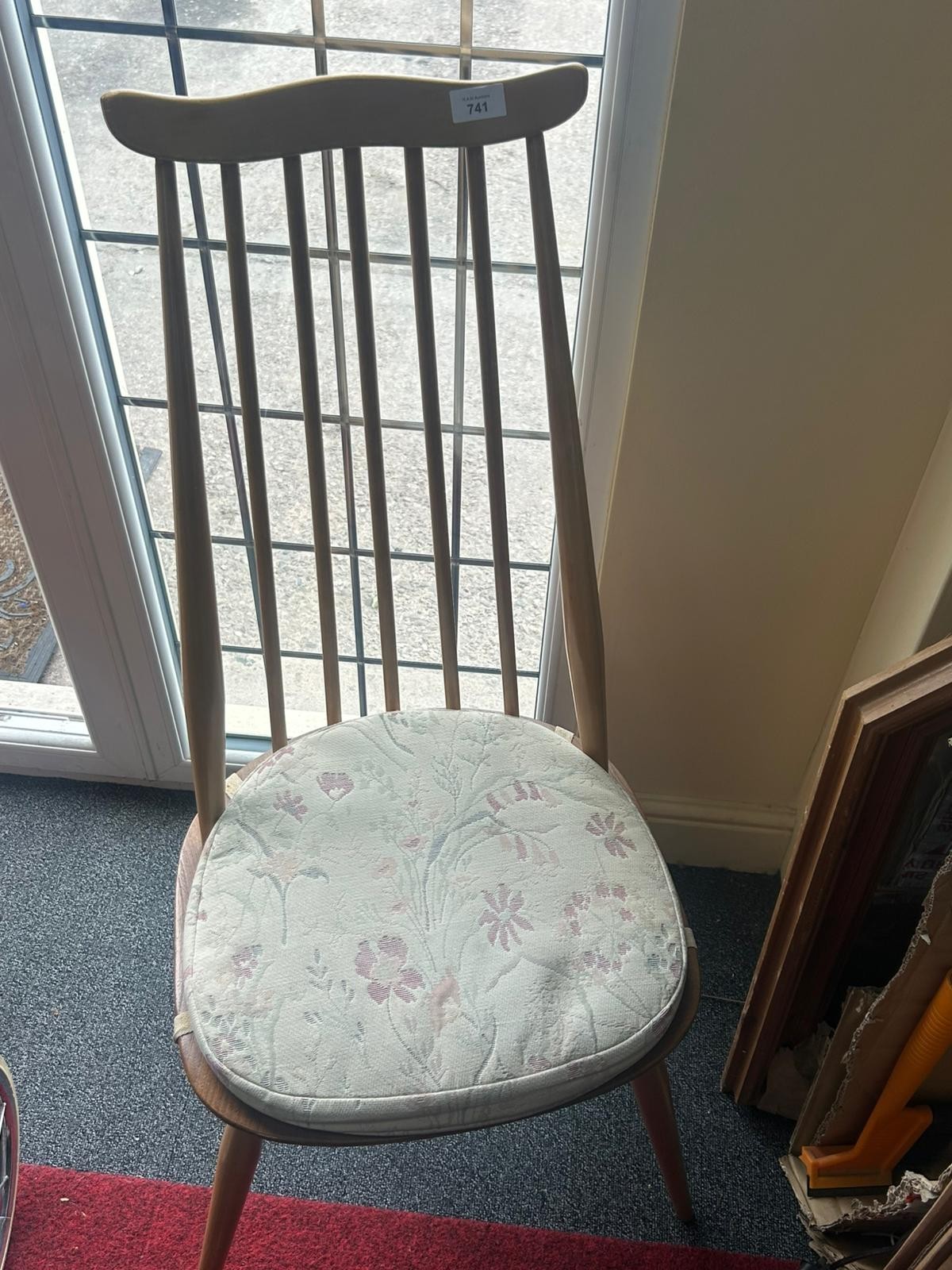 A wooden chair with a curved top rail, vertical spindles, tapered legs, and a round, upholstered seat in floral fabric.