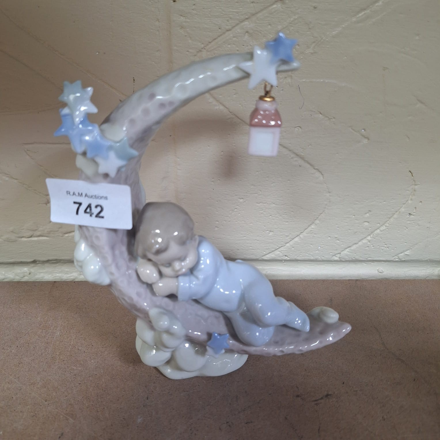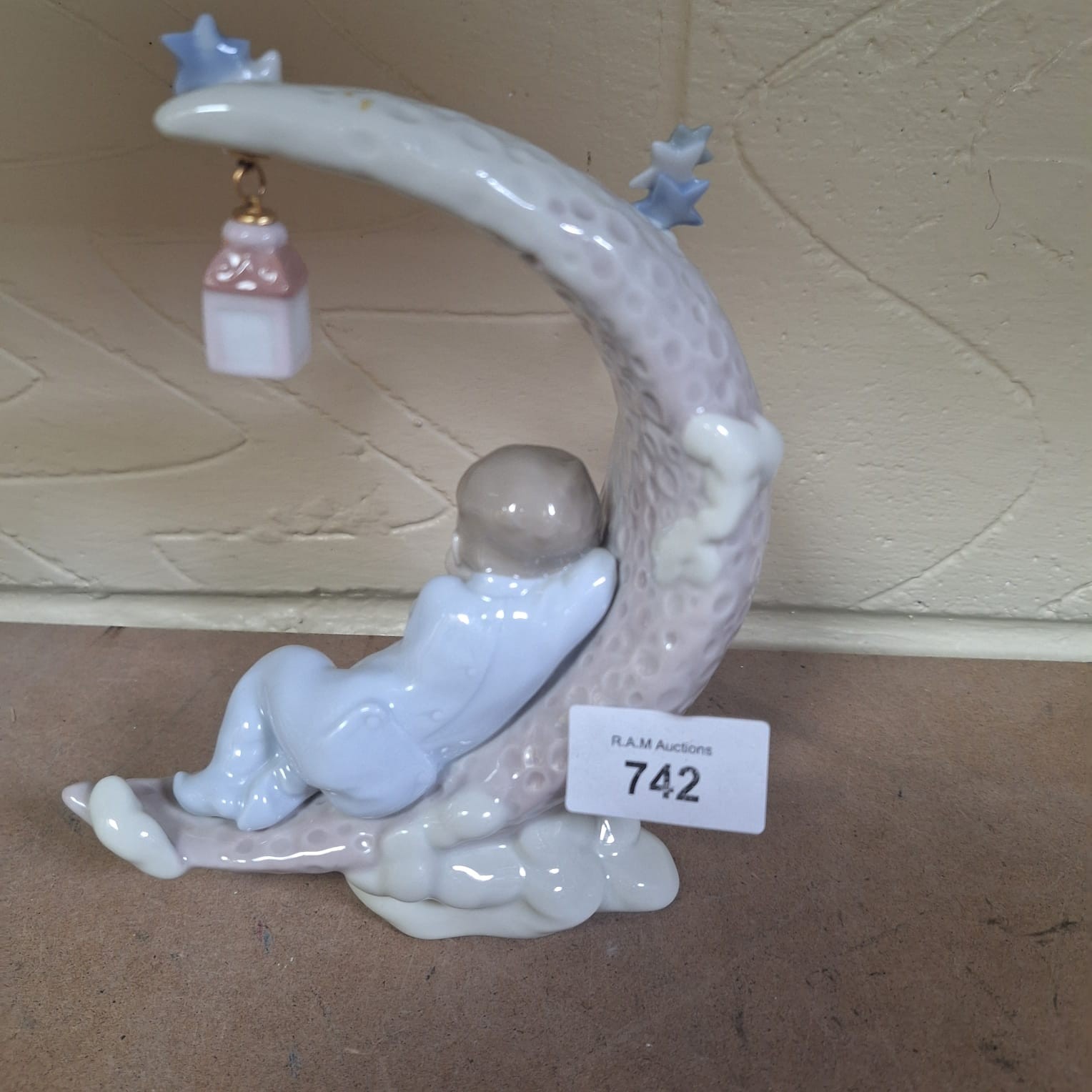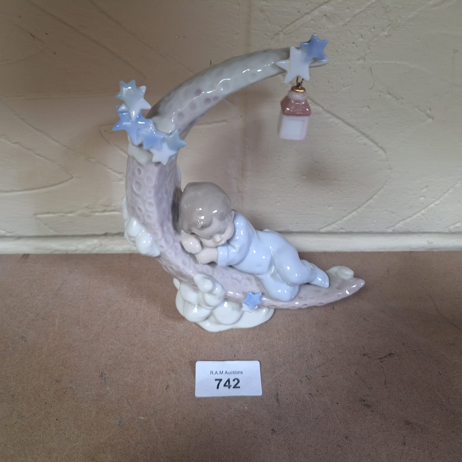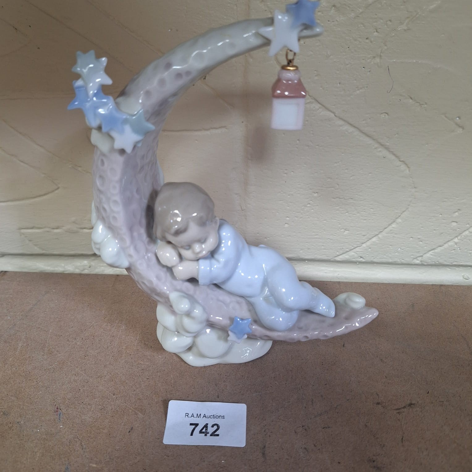 Lladro porcelain figurine of a child sleeping on a moon with a lantern and clouds.