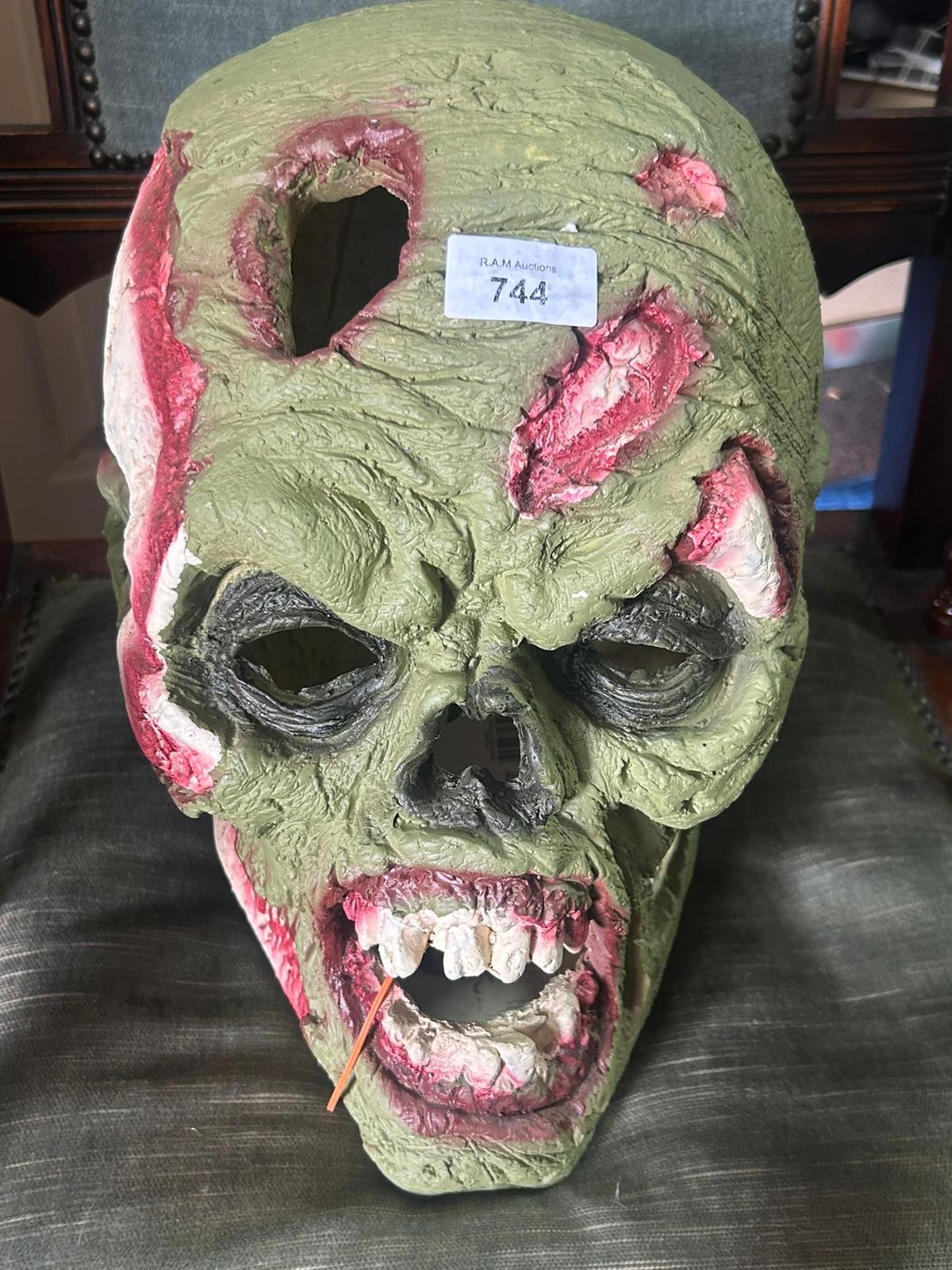 A mottled olive-green zombie mask with sculpted skin texture, deep crevices, and reddish-pink wound details.