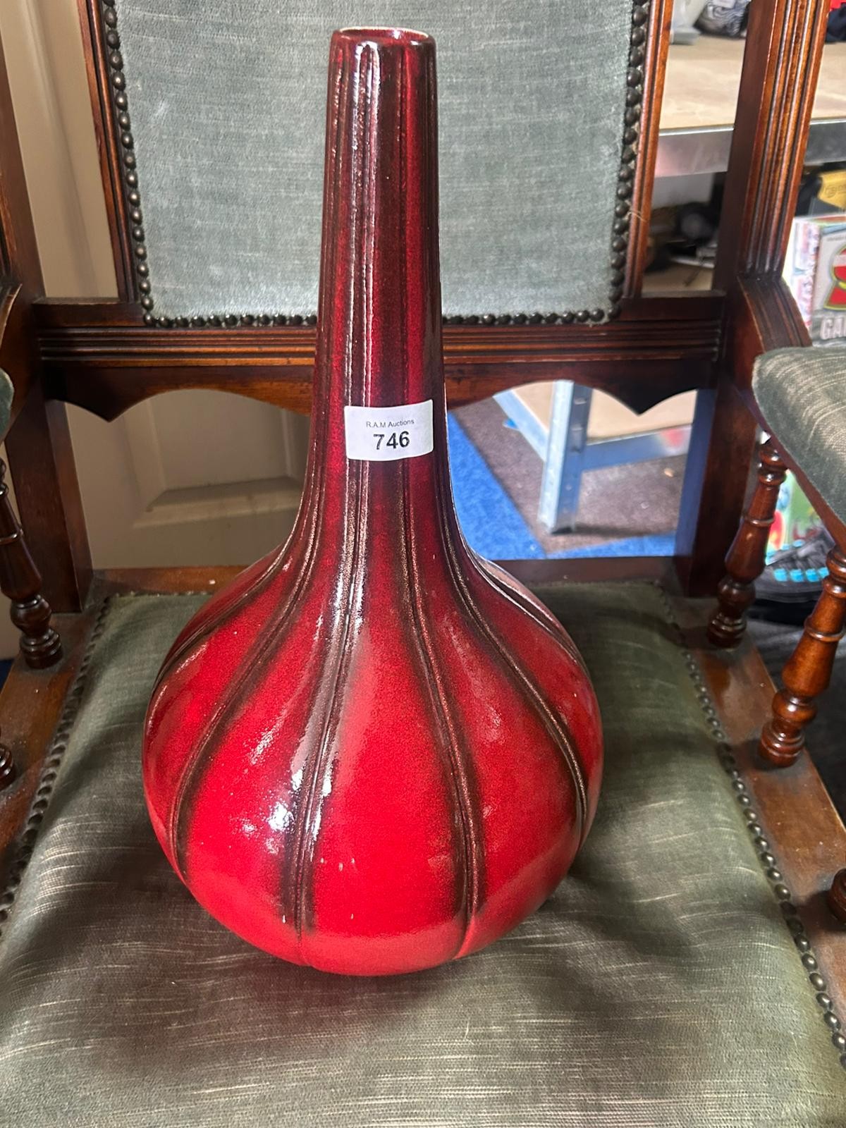 A tall, slender neck ceramic vase with a bulbous body, featuring vertical ribbed detailing in red and dark brown.