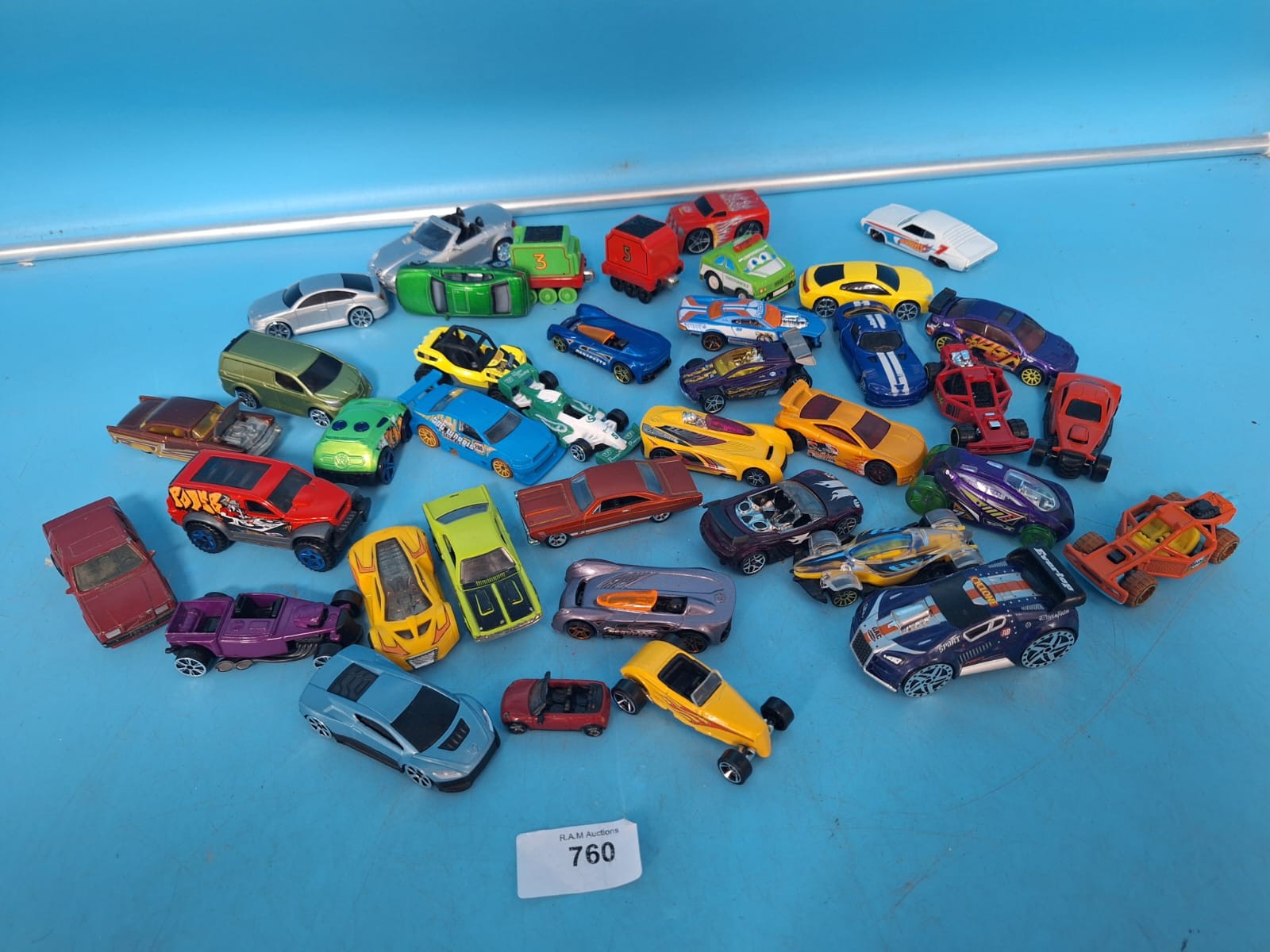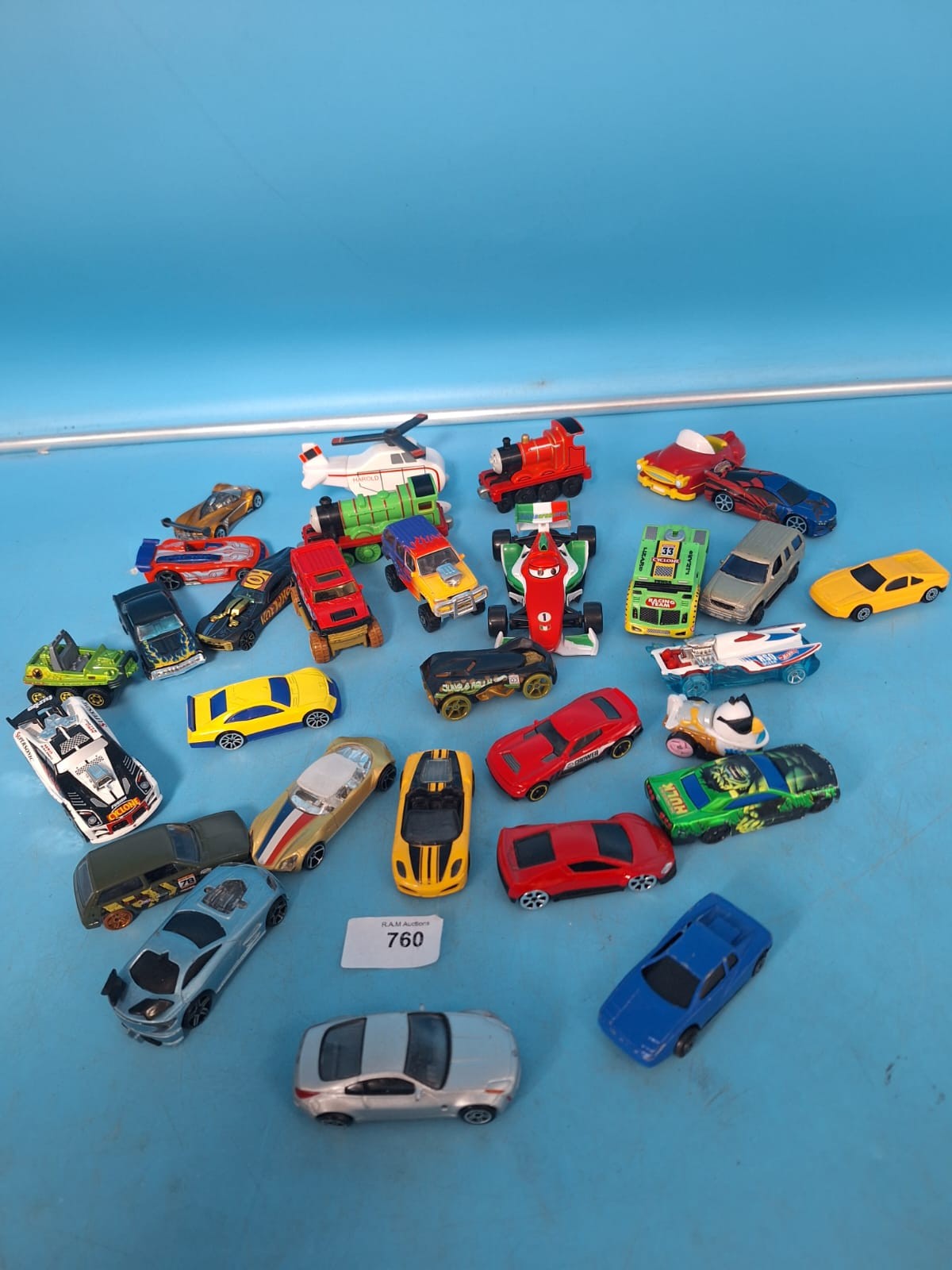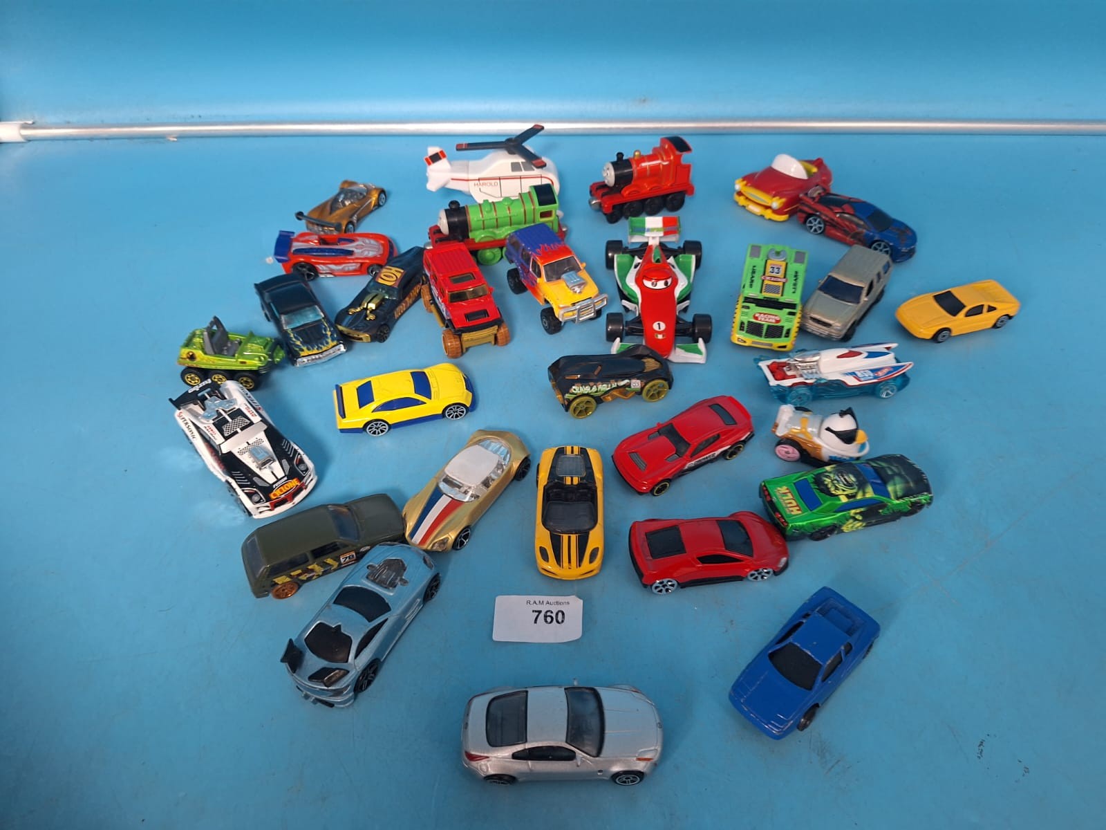 A collection of diecast toy vehicles including cars, trucks, a locomotive, and a helicopter, featuring various colors and graphics.