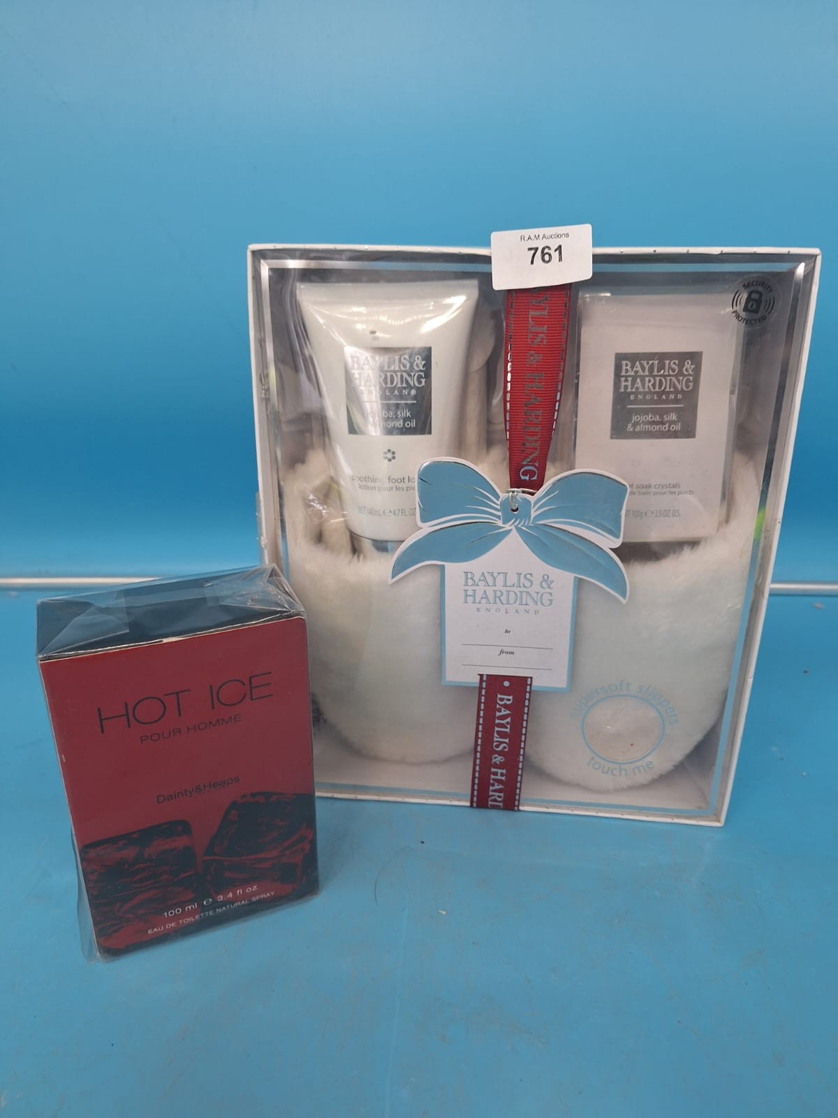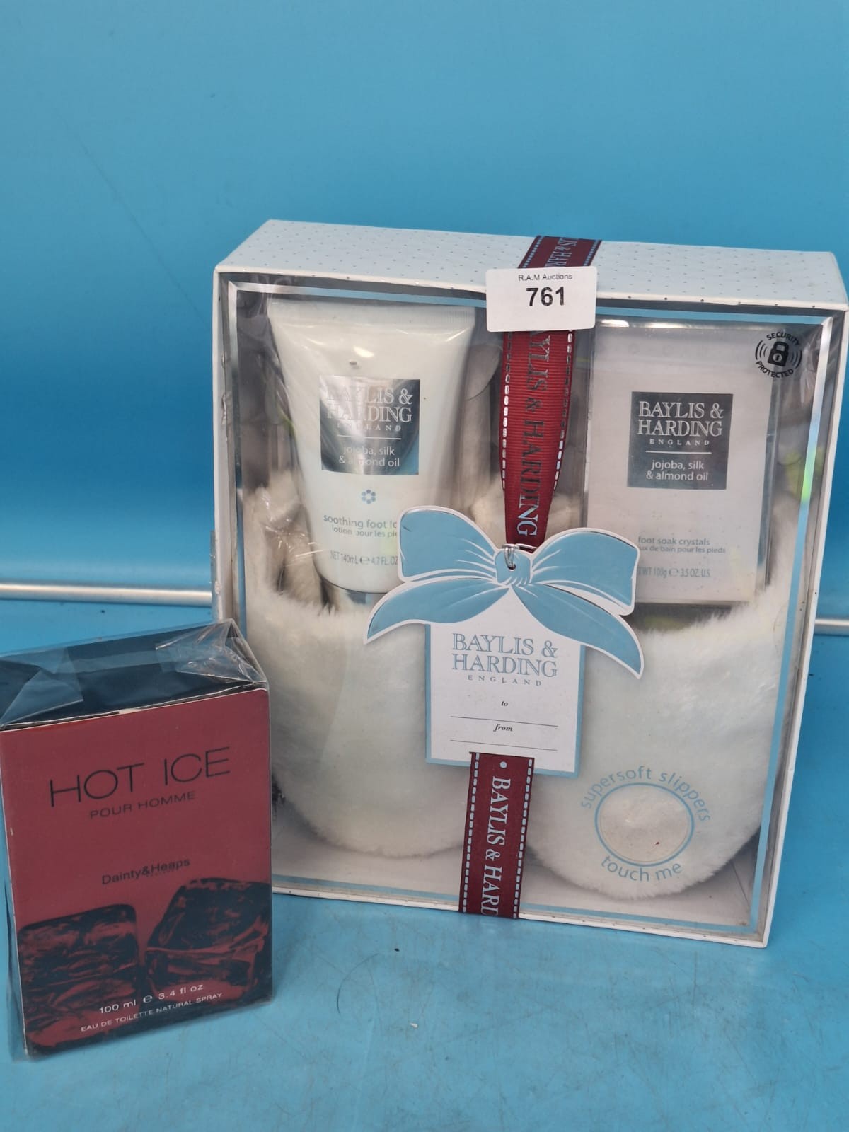 Baylis & Harding foot care gift set featuring lotion, soak crystals, and slippers, alongside a Hot Ice Pour Homme Eau de Toilette.