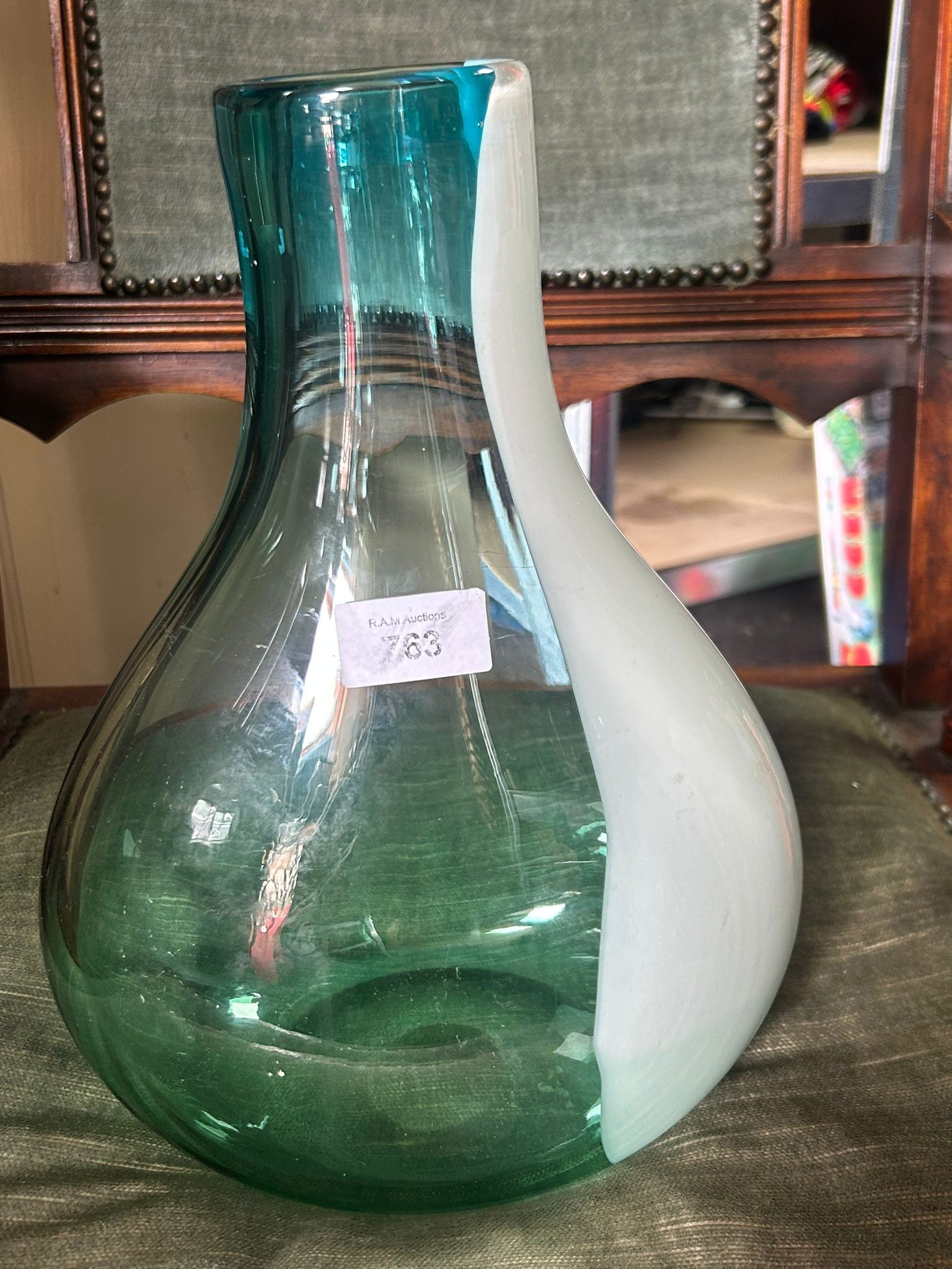 Teal and opaque white glass vase with a pear-like shape and darker teal neck.