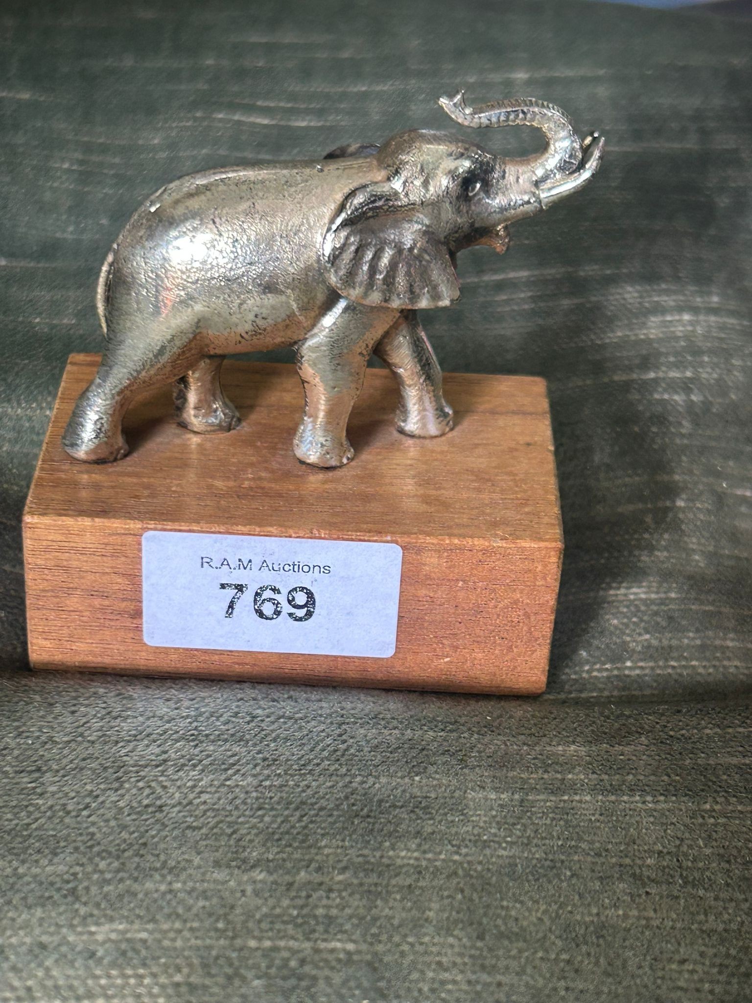 Silver-colored elephant figurine with trunk raised on a dark reddish-brown wooden base.