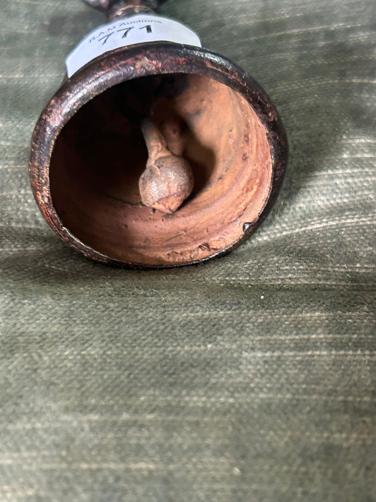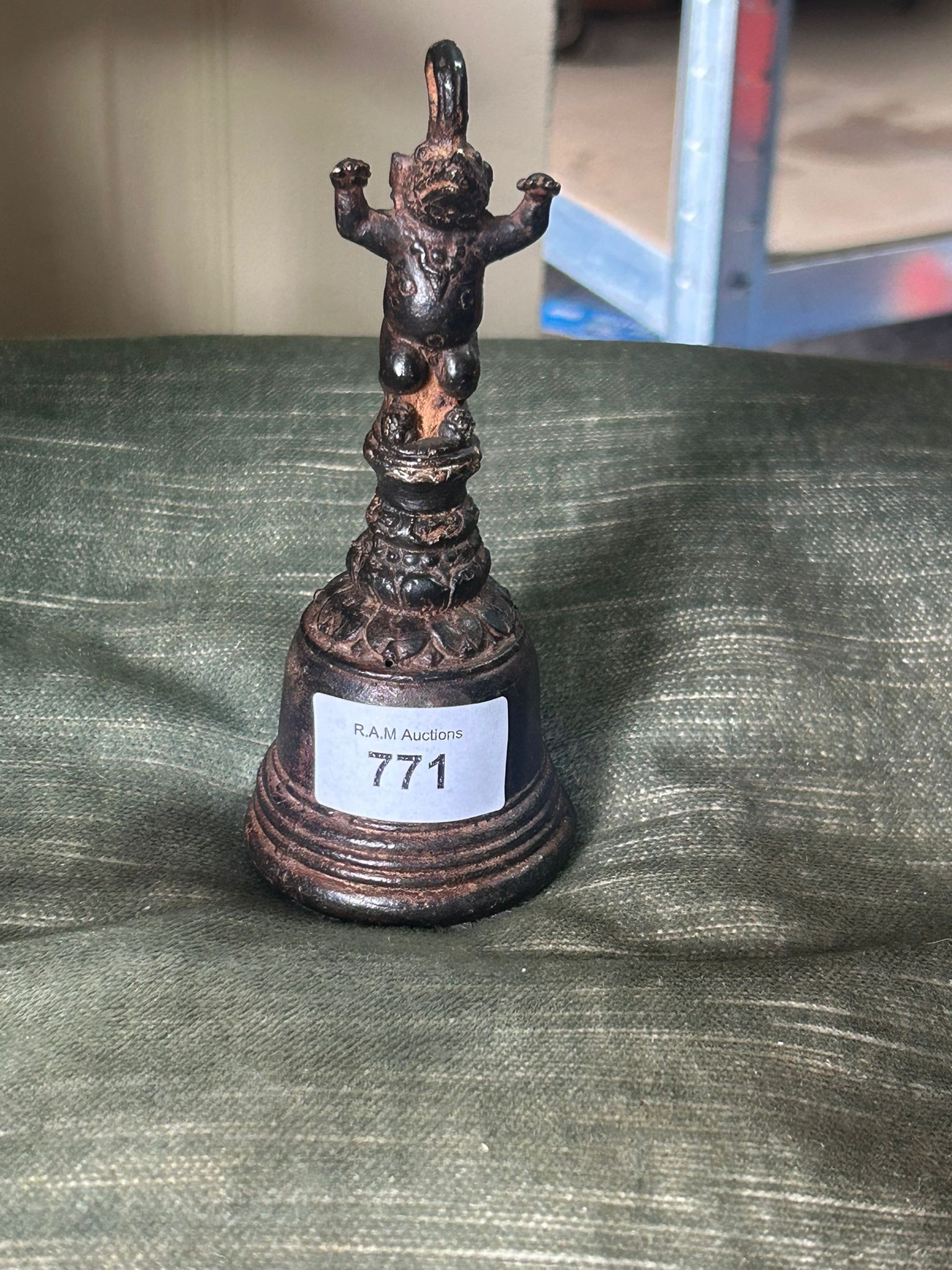 Small, dark-brown/black bell-shaped object with a figural top and a round clapper.