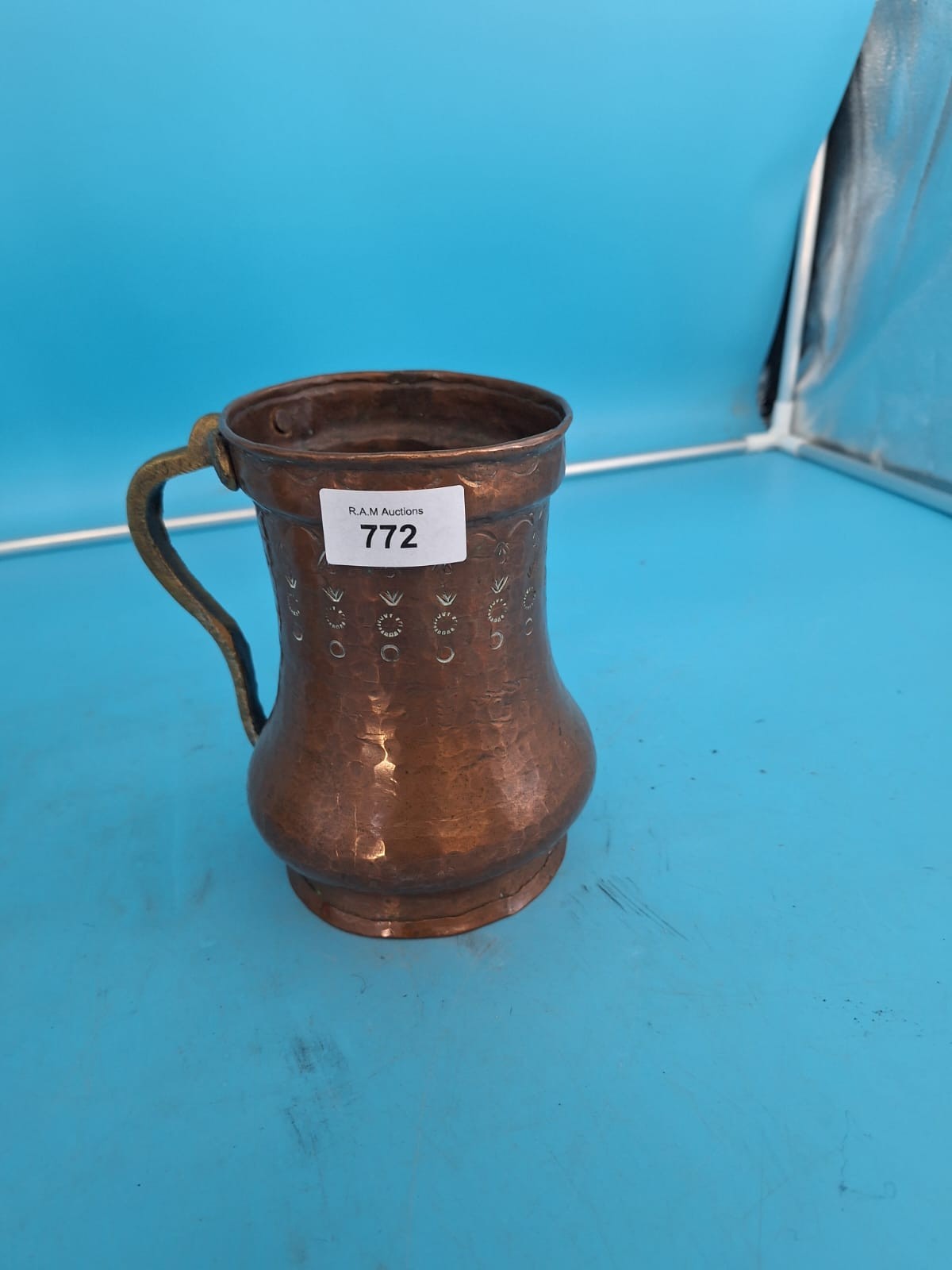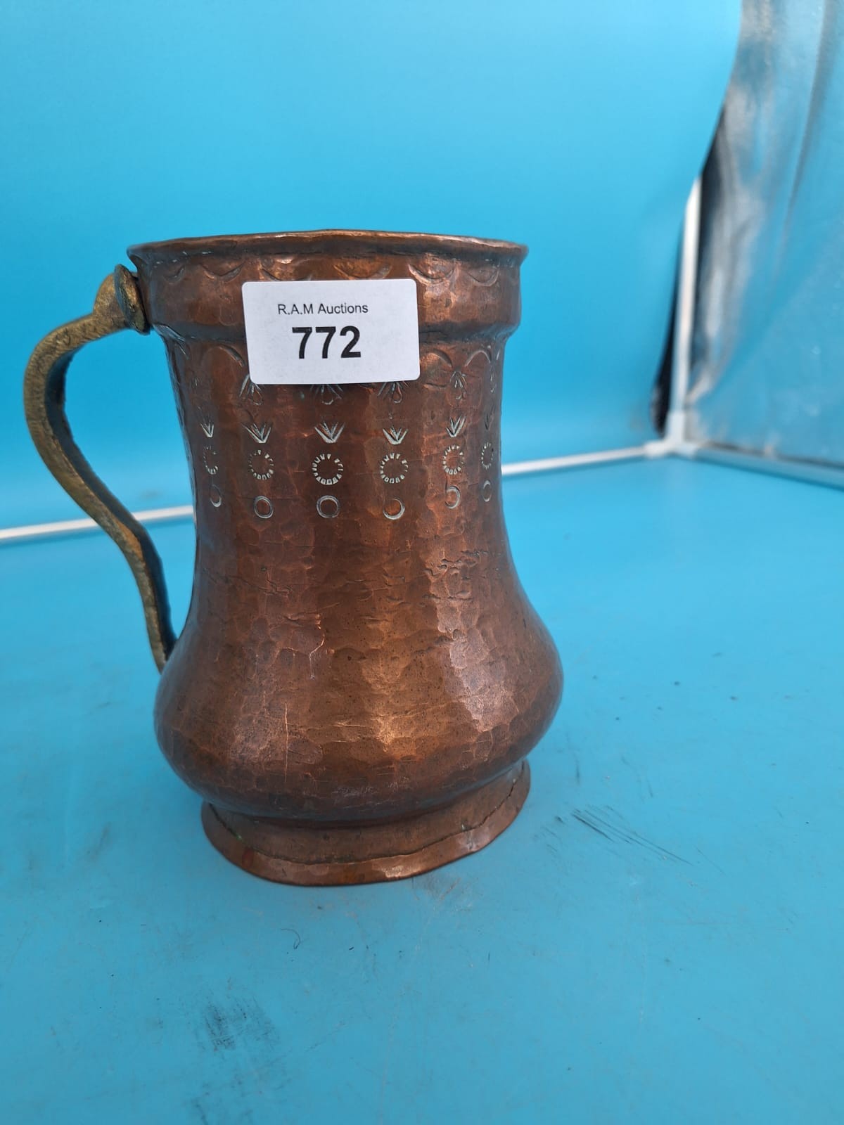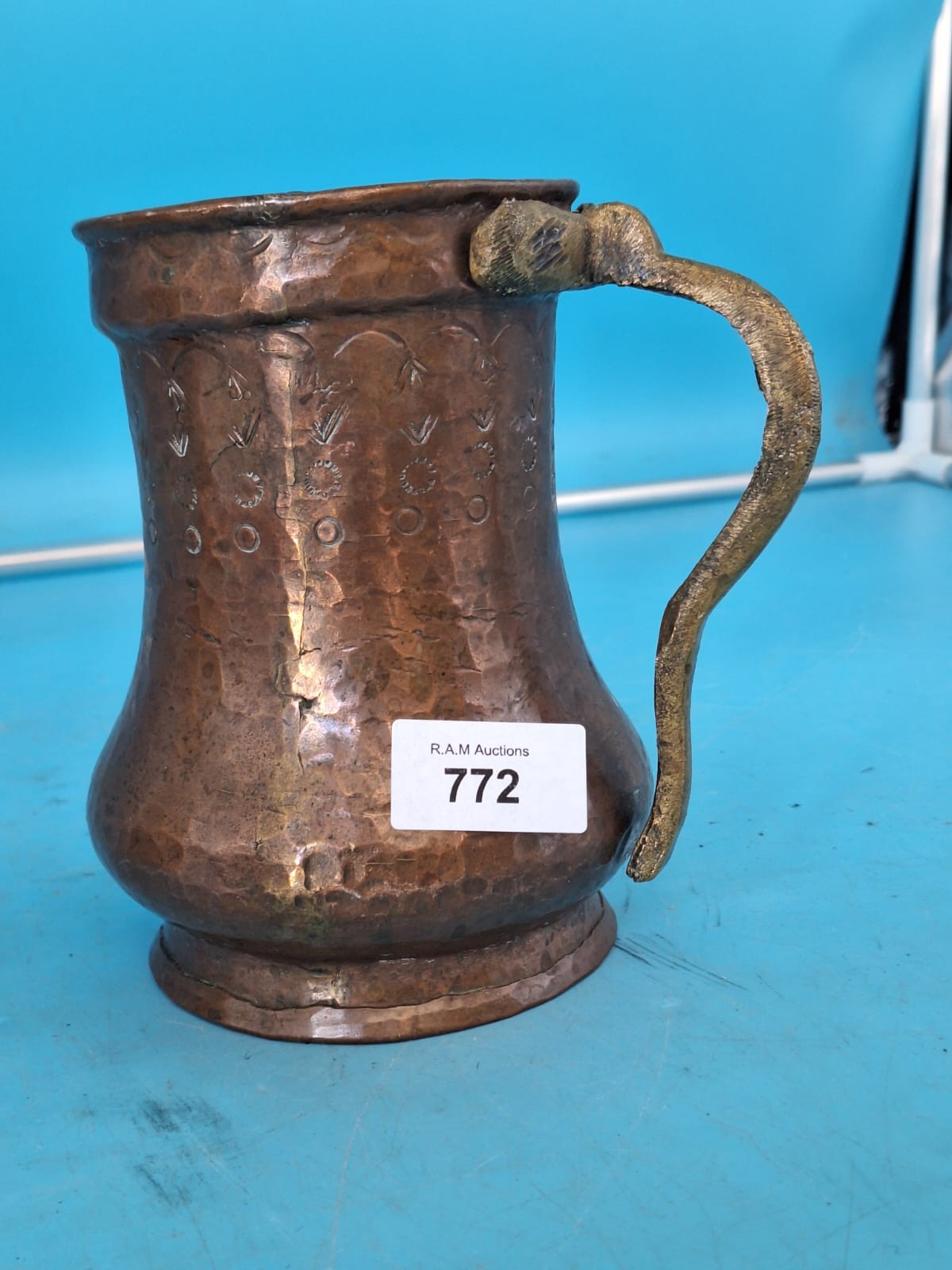 A patinated copper tankard with a hammered texture, bulbous body, and embossed floral motifs, featuring a bent brass handle.