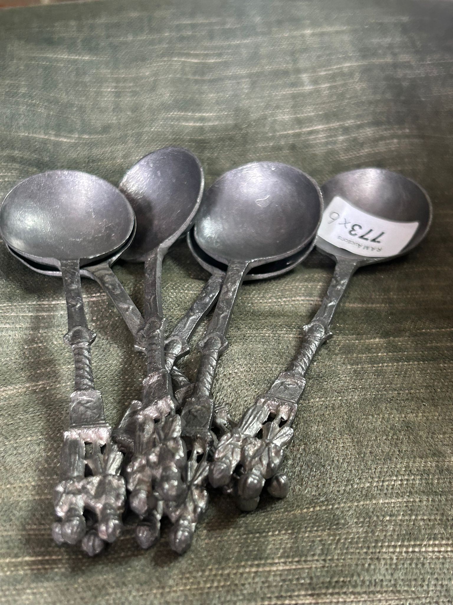 Pewter spoons with oval bowls and ornate floral/leaf handles.