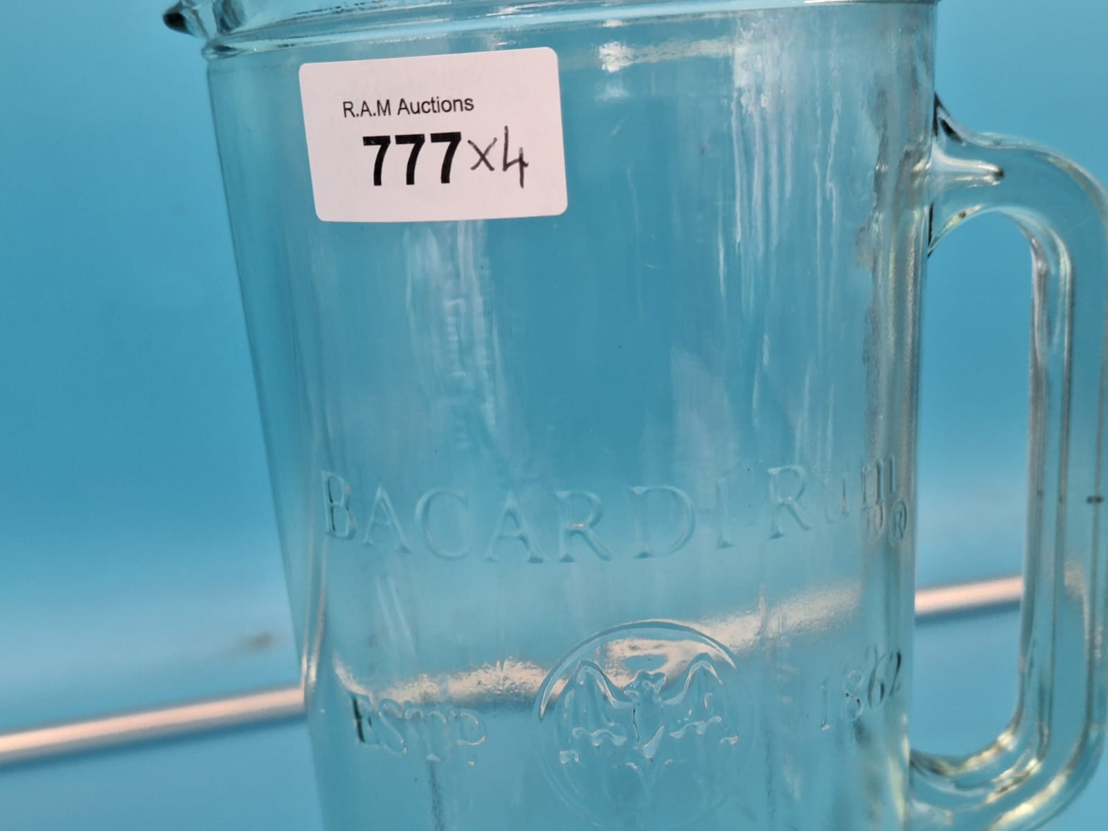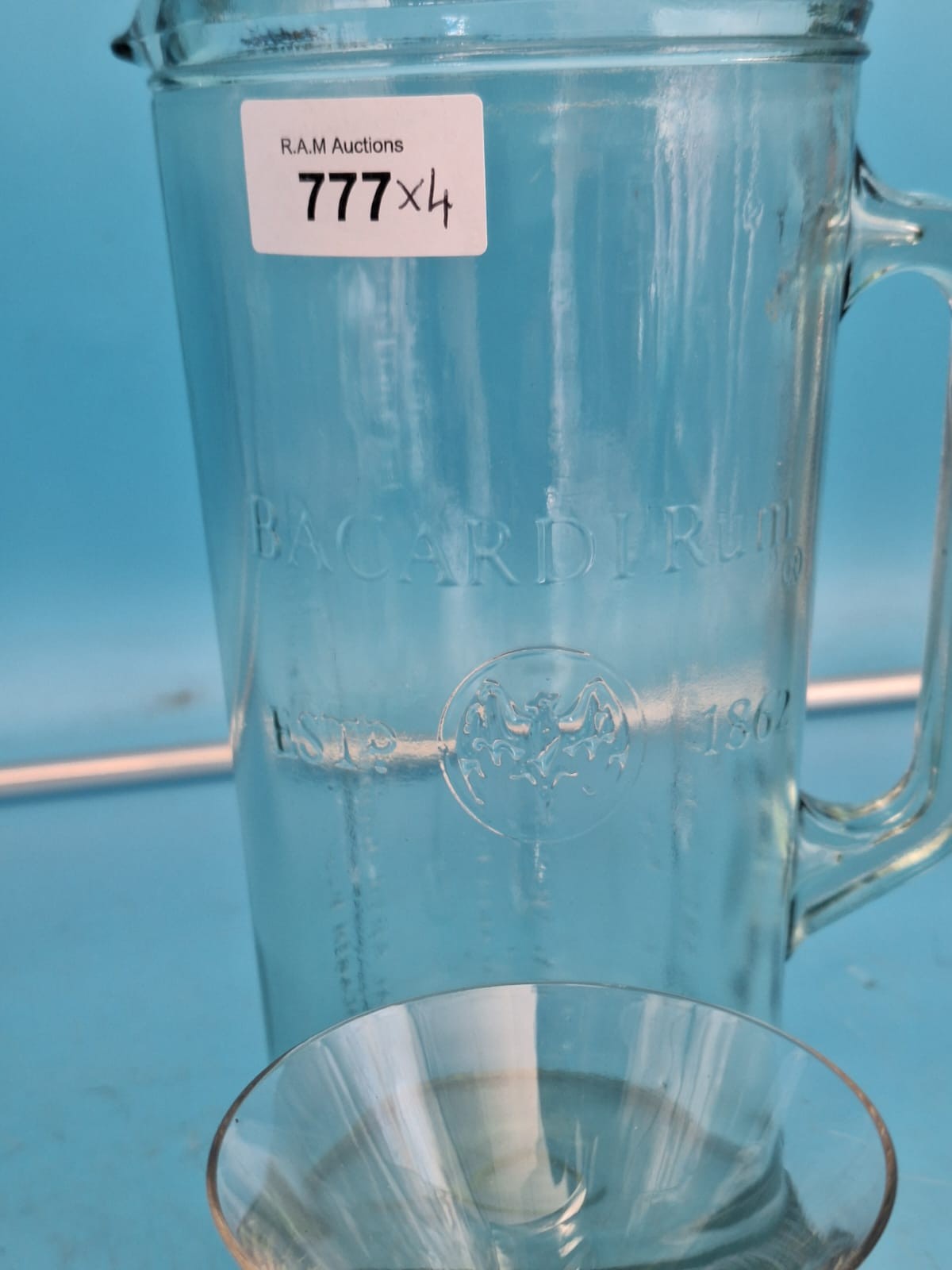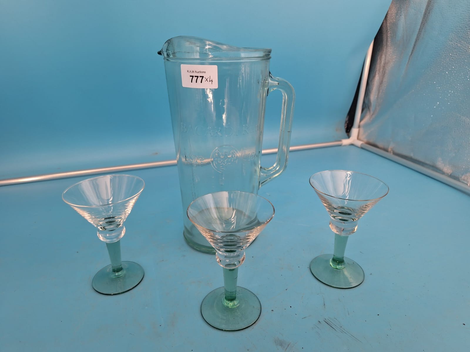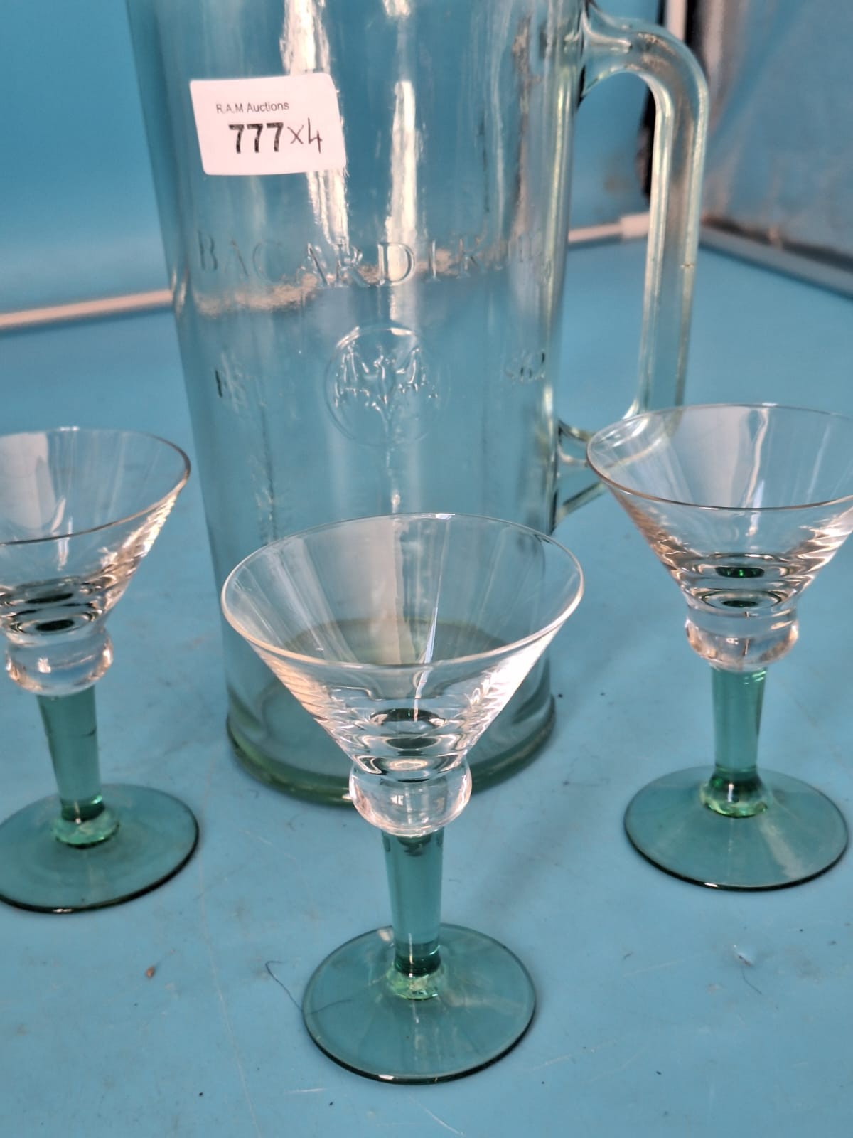 Clear glass pitcher with Bacardi logo and three glasses with light green stems.