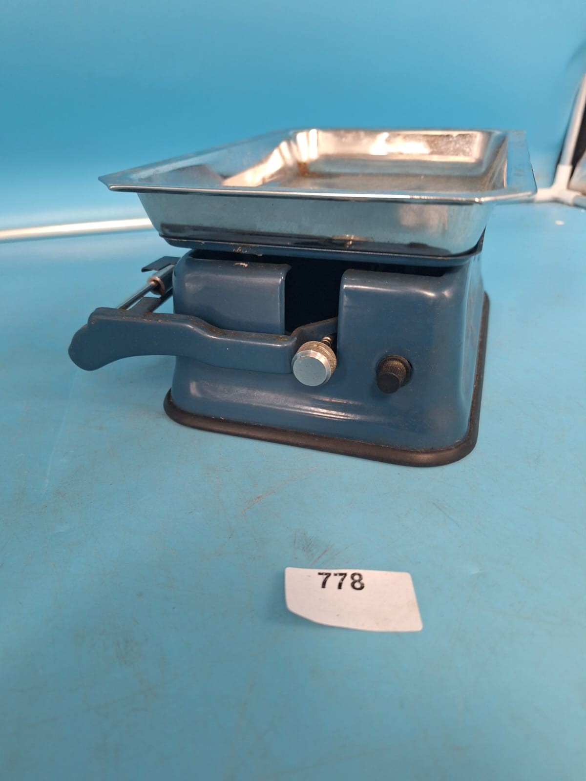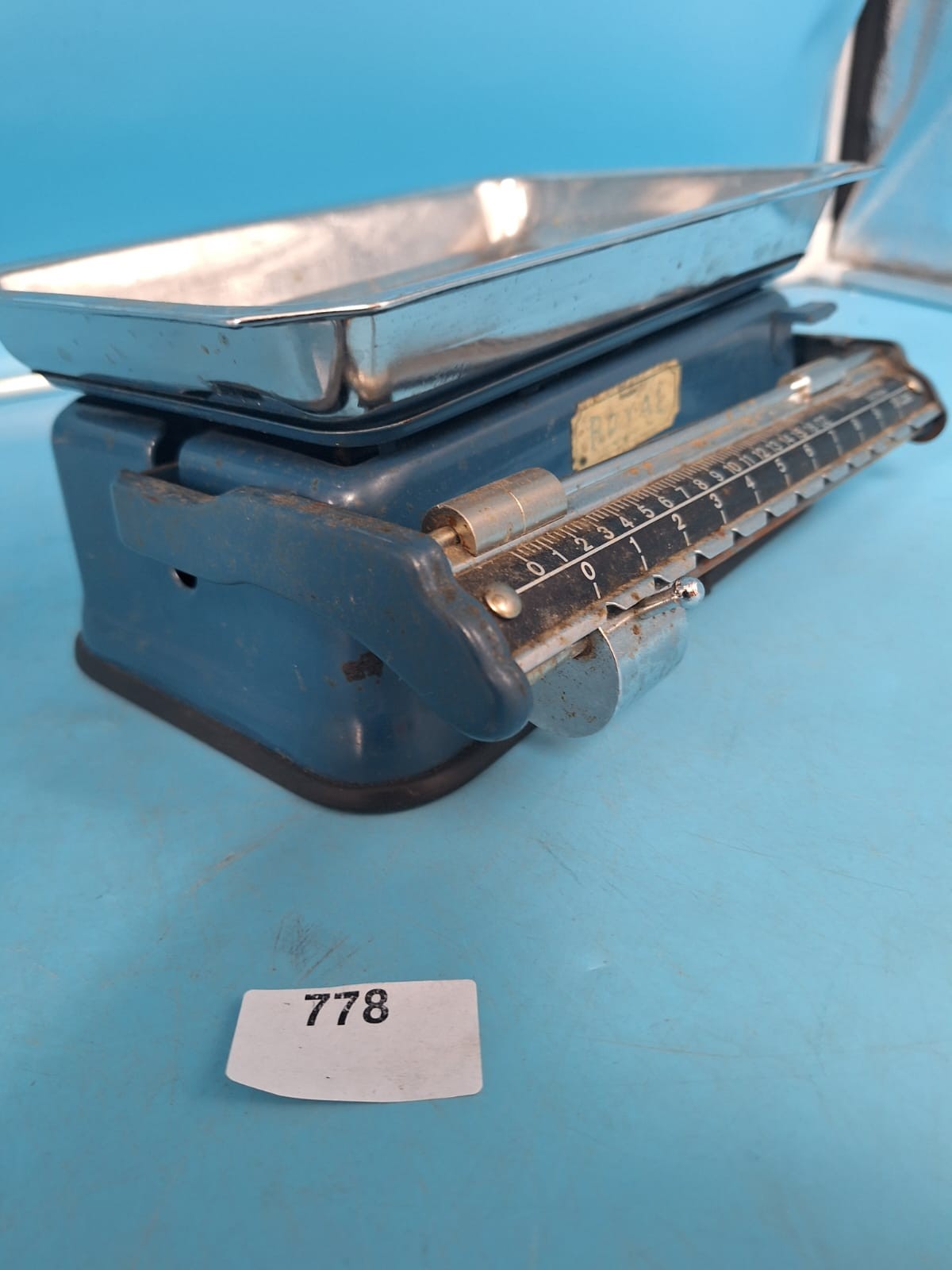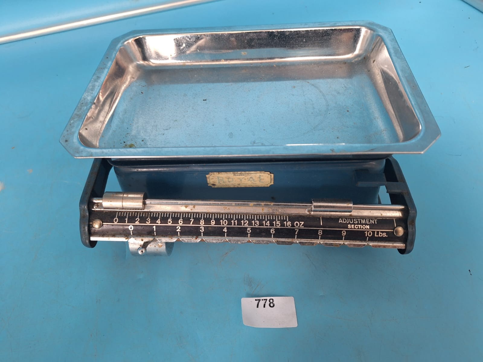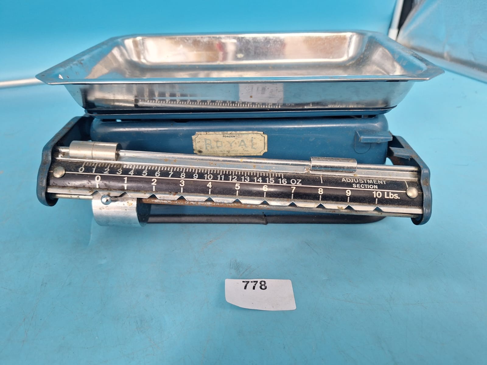 Rectangular blue-painted metal base scale with a stainless steel weighing pan, featuring a calibrated measuring bar marked in ounces and pounds.