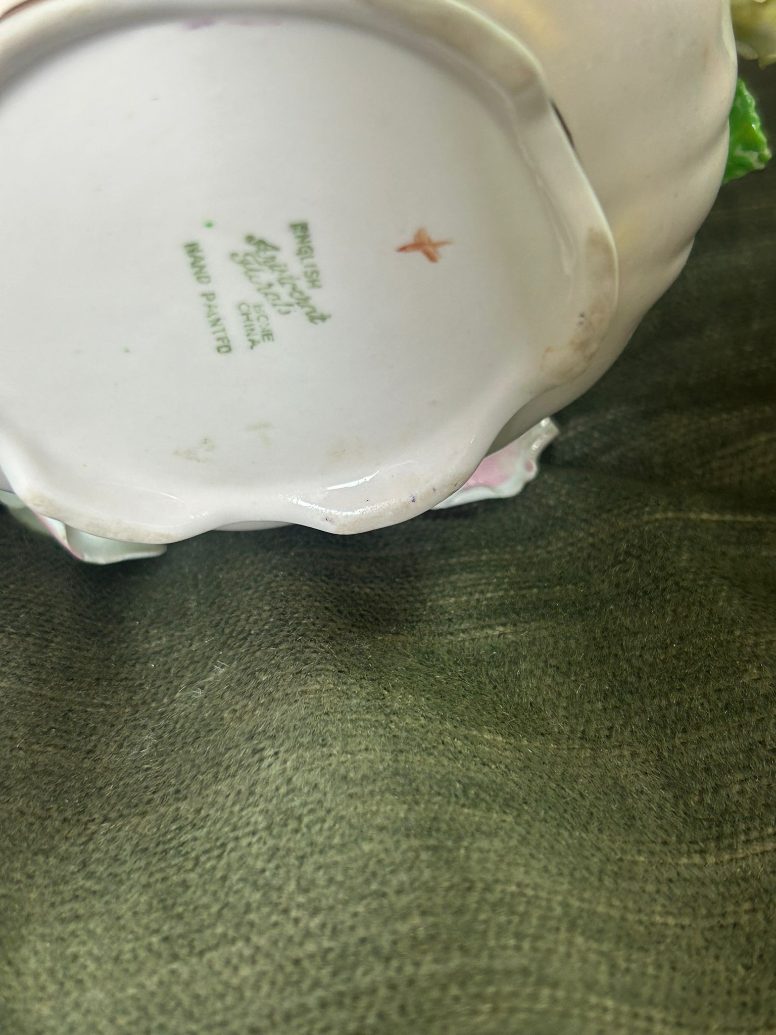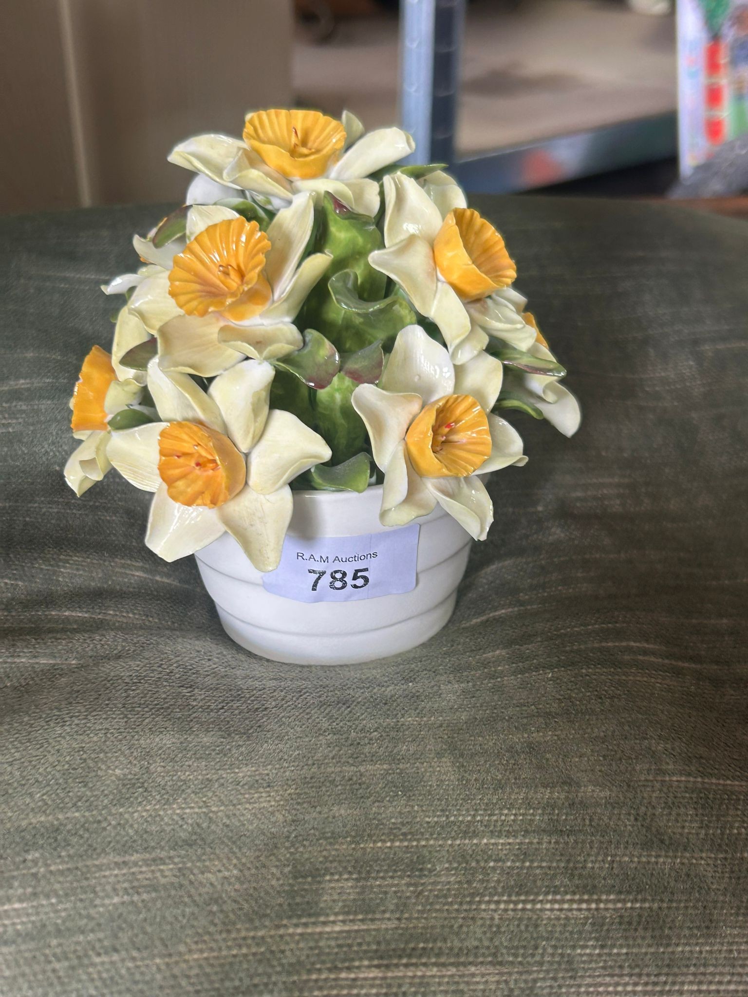 A hand-painted porcelain figurine of white and yellow daffodils with green leaves in a cream pot.