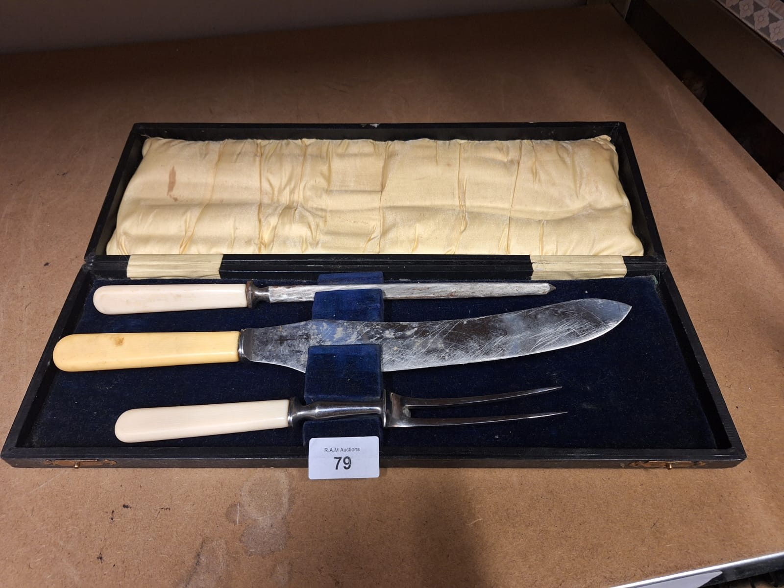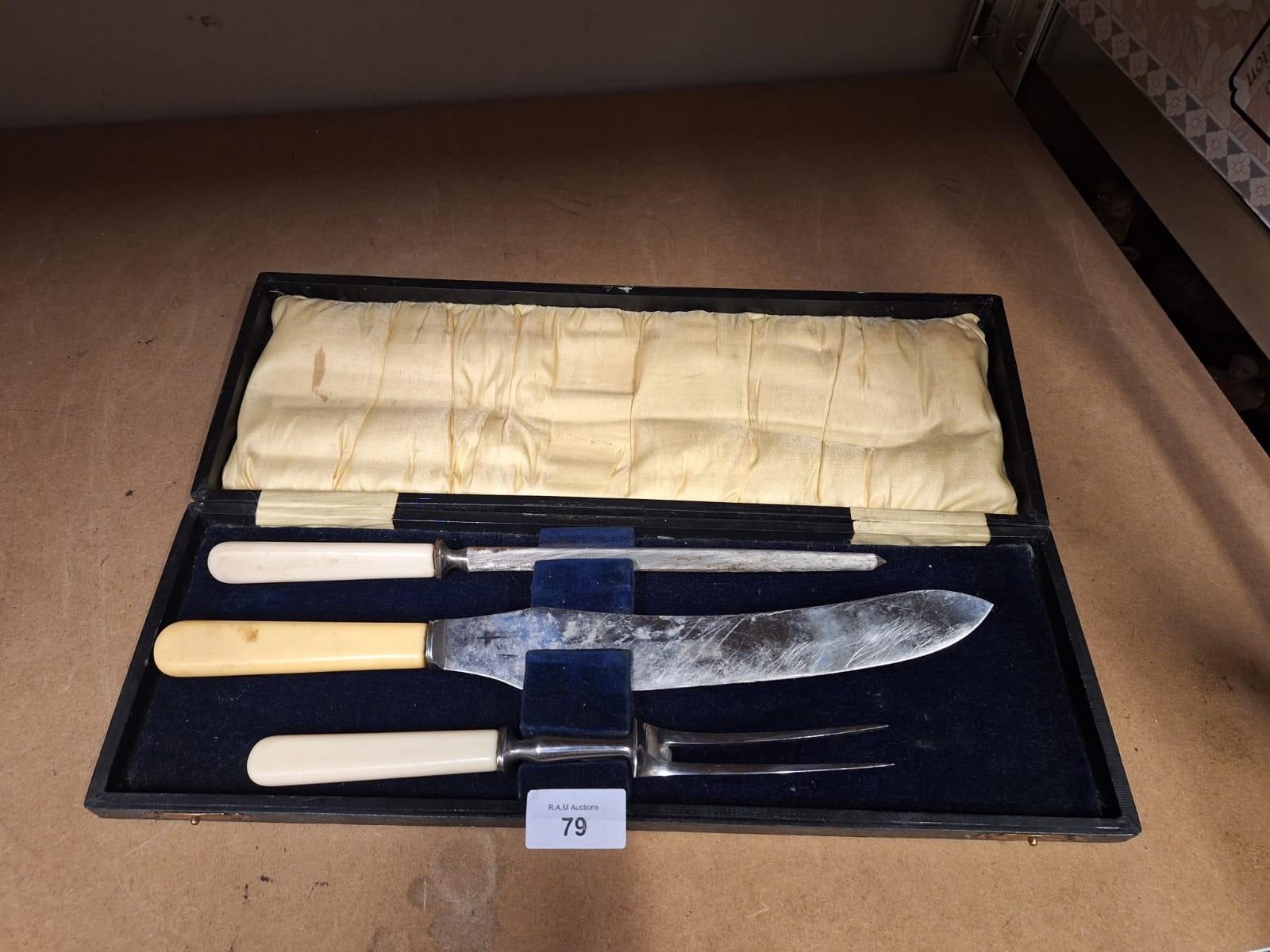 A three-piece carving set with off-white handles in a worn black wooden box.