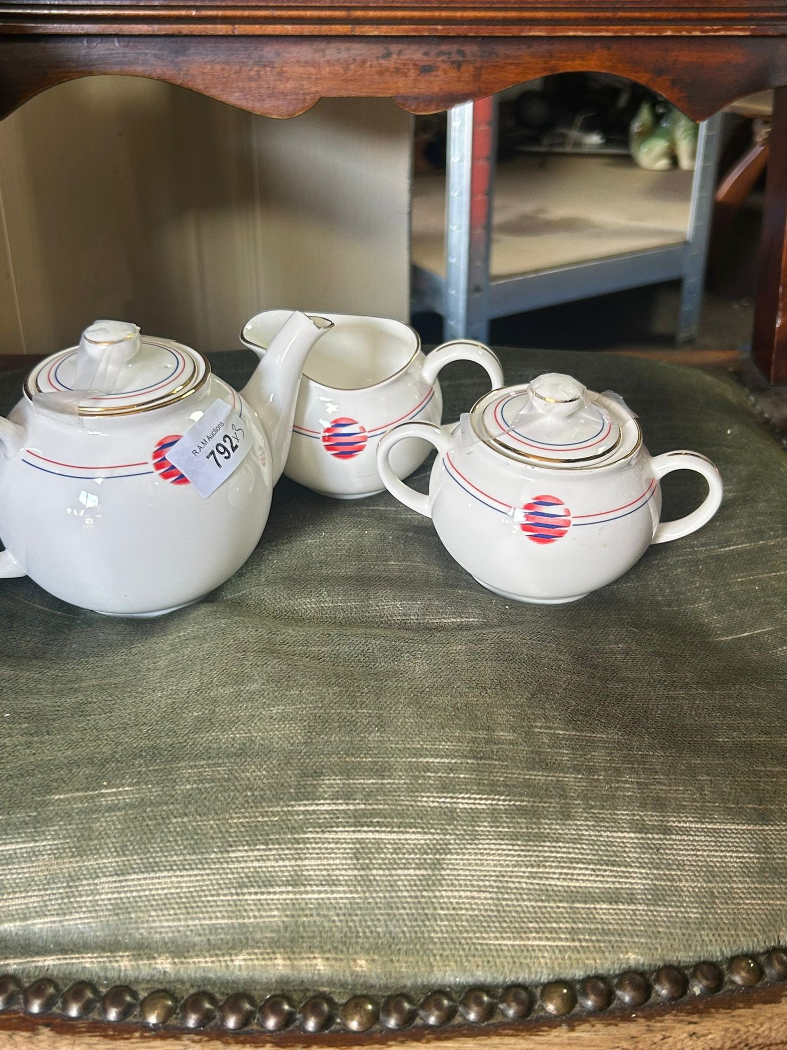 White porcelain three-piece tea set with red and blue circular design and gold trim.