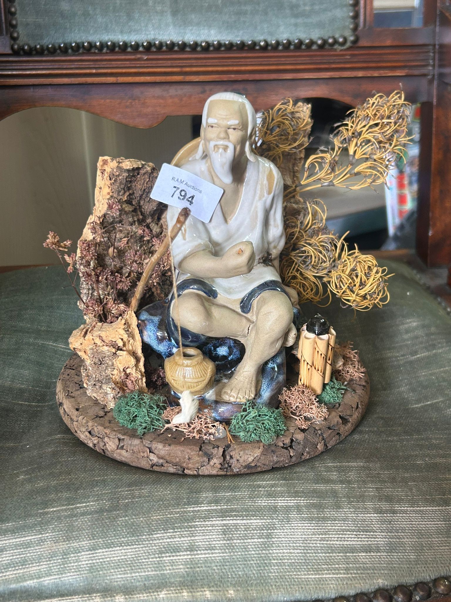 Ceramic figurine of a bearded elderly man fishing, with blue clothing accents, on a base with dried plants and a small pot.