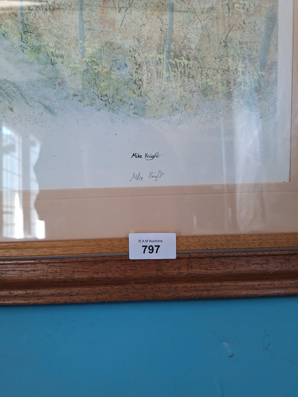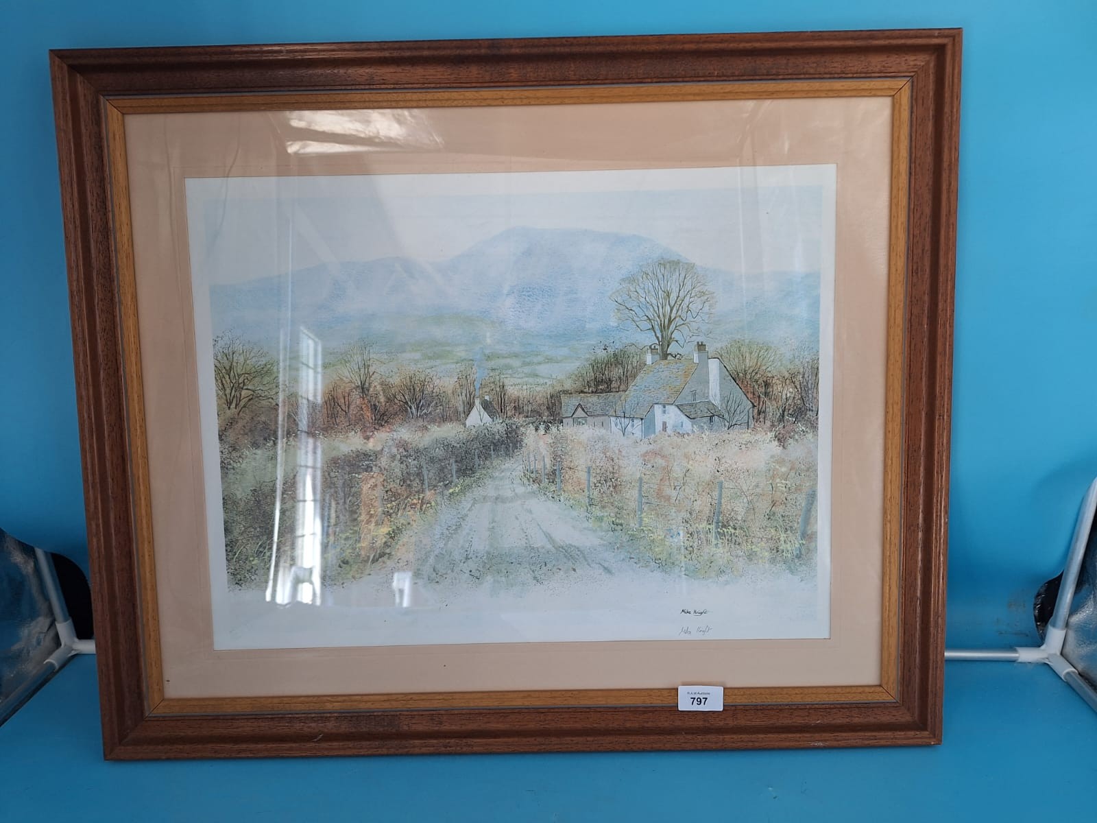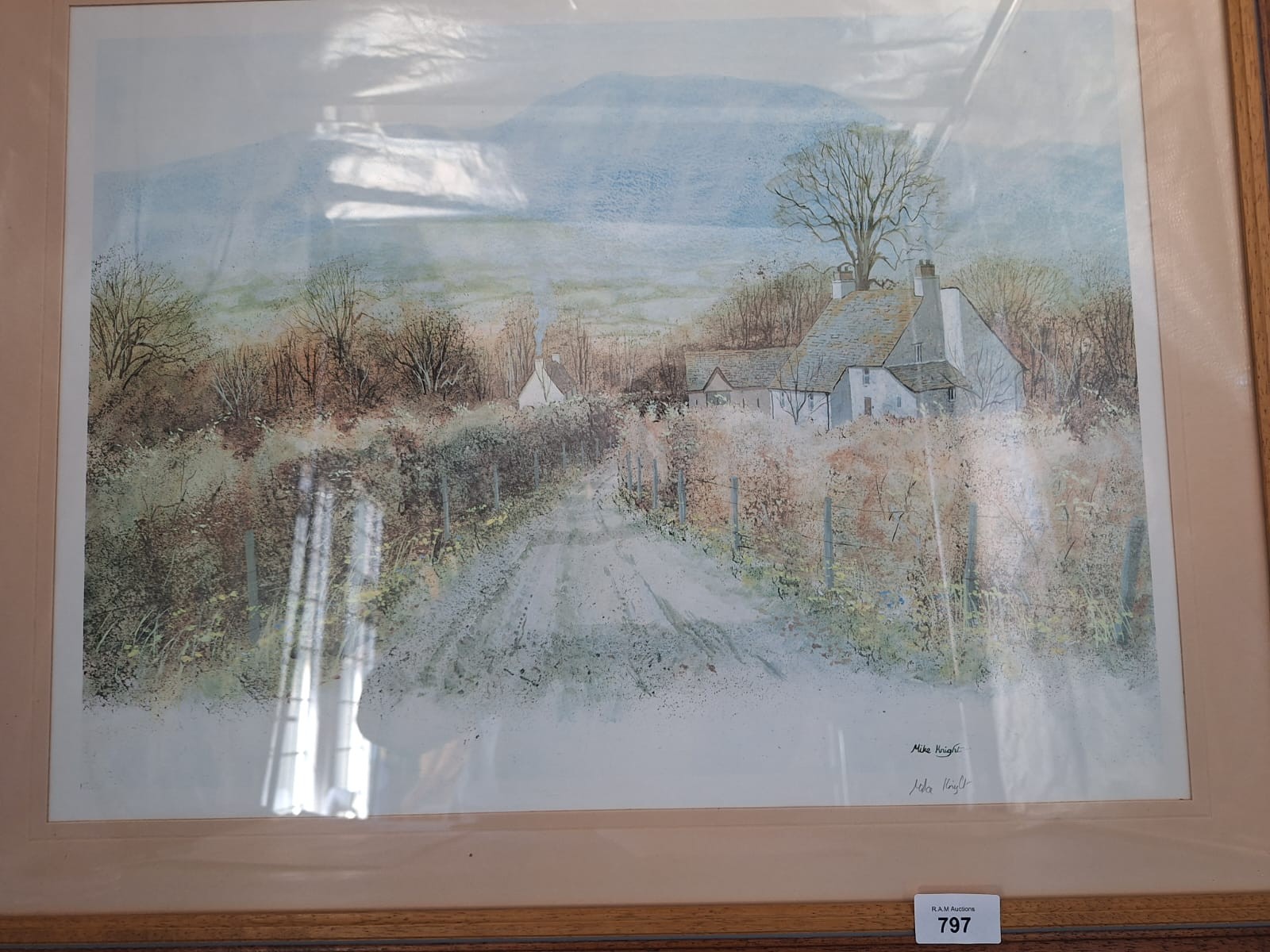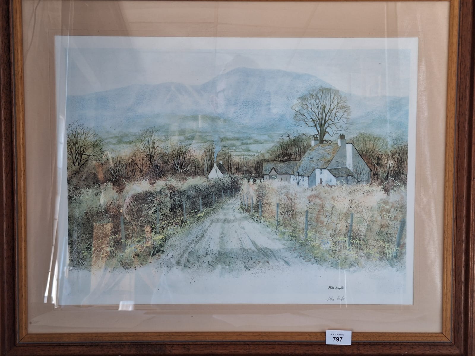Framed print by Mike Knight depicting a landscape with a cottage, road, and mountains.
