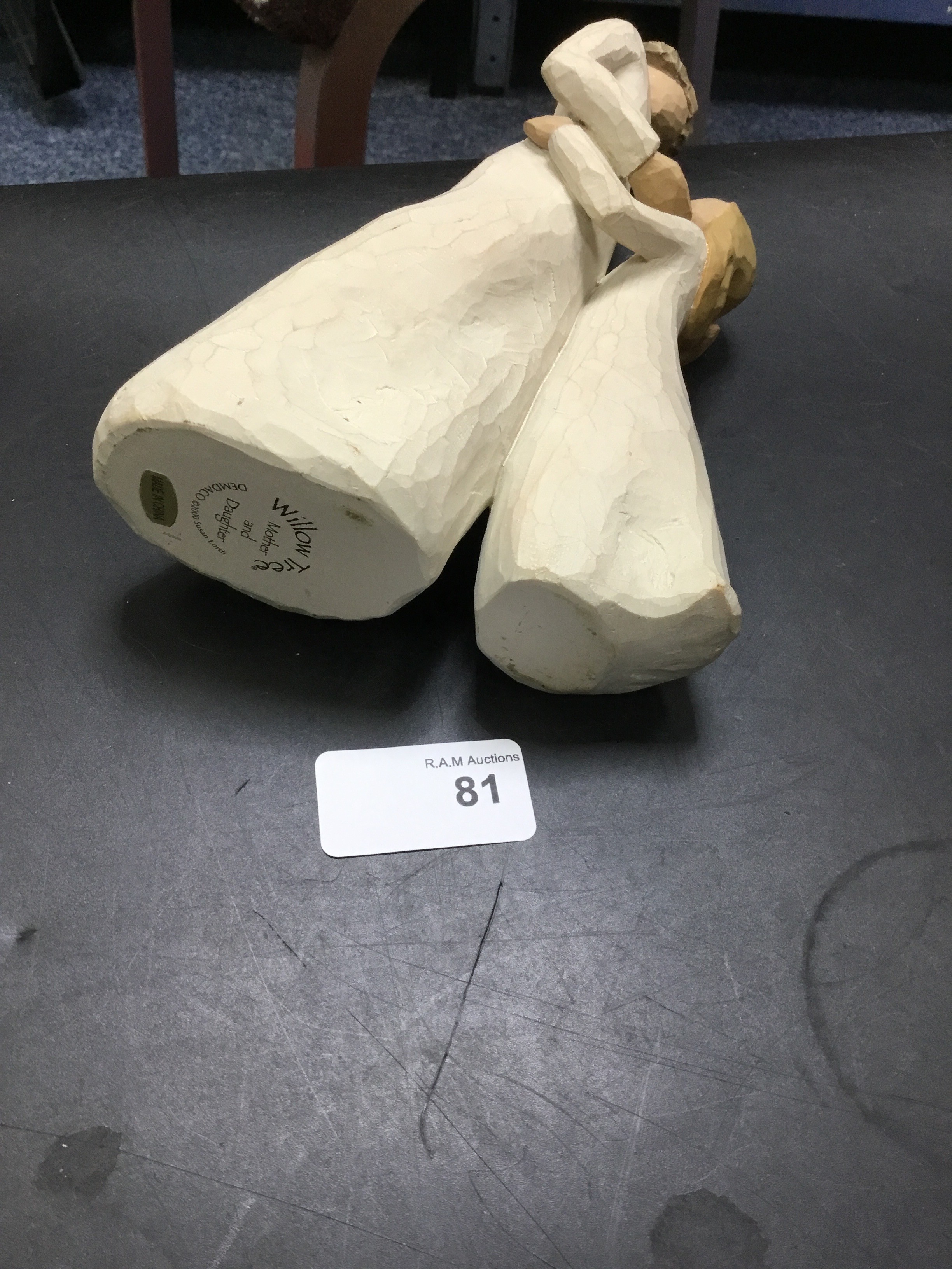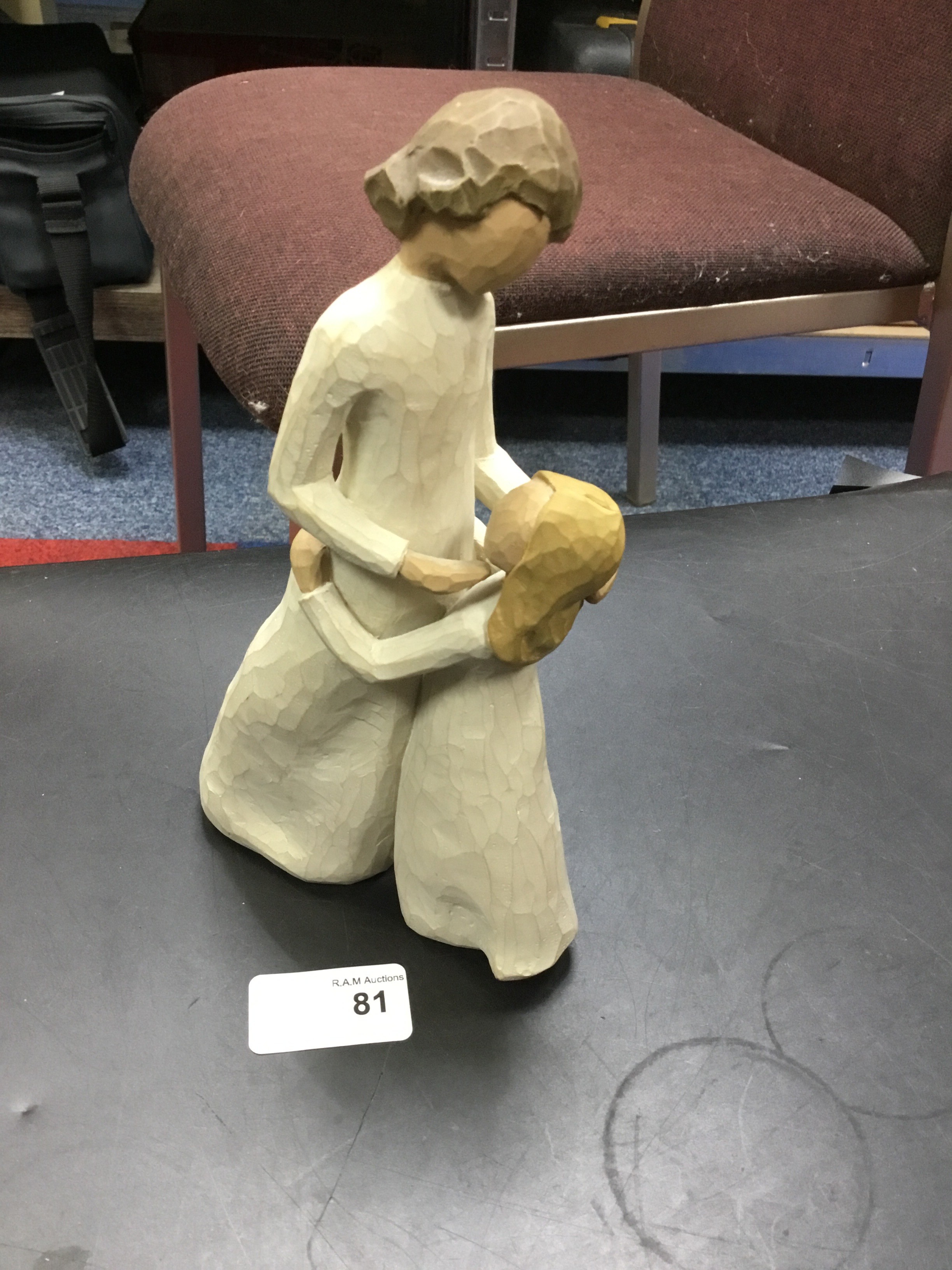 A resin figurine depicts a woman and child embracing, styled like wood carving.