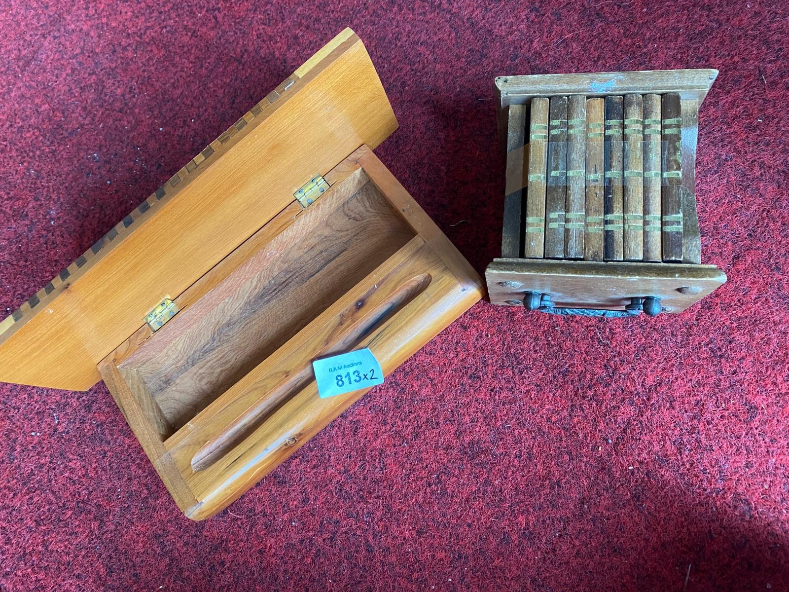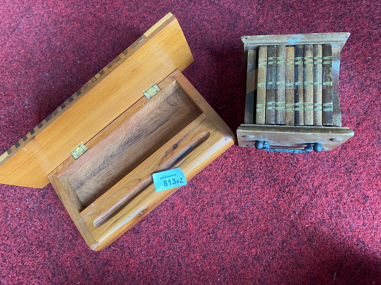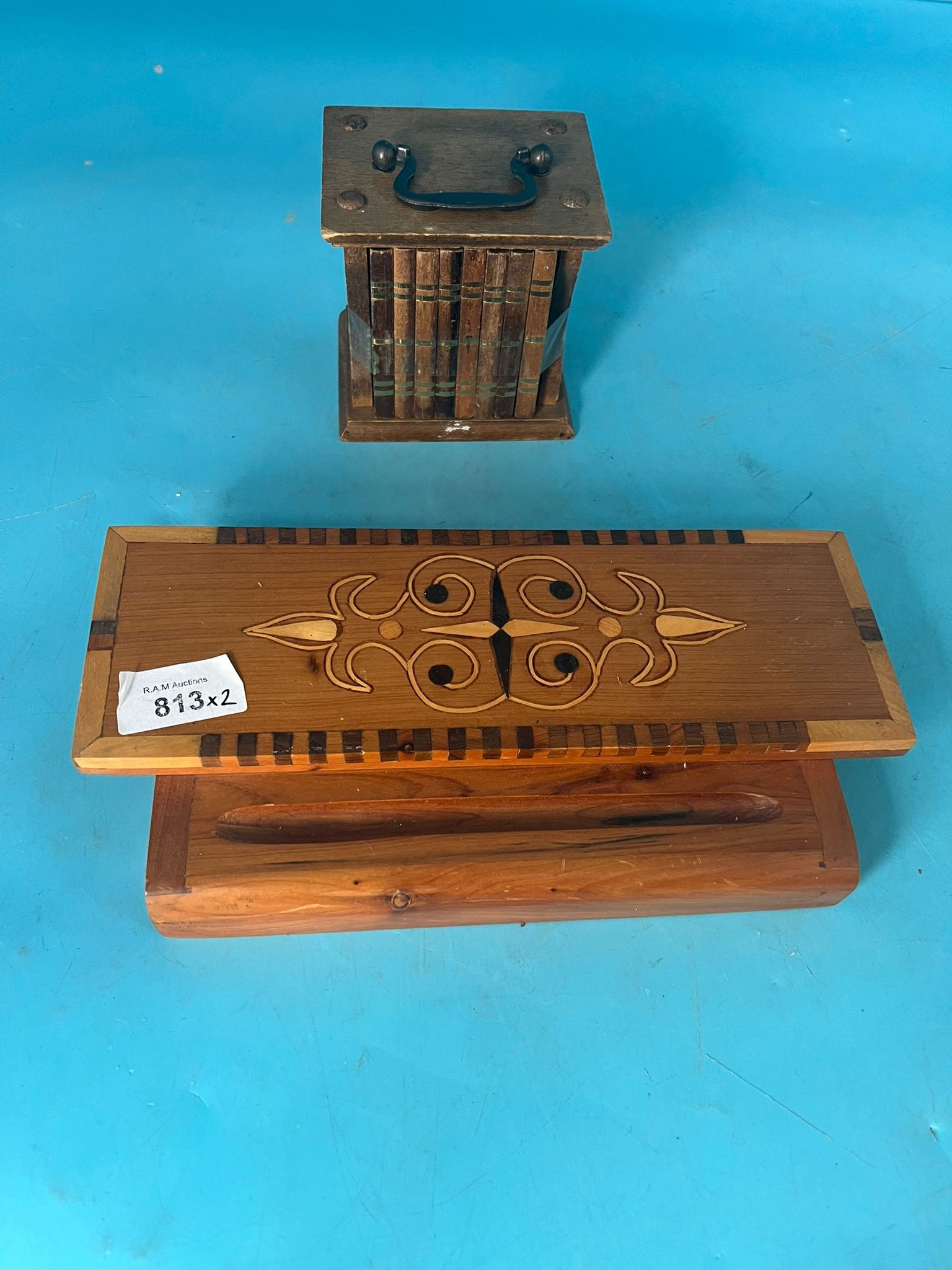 Rectangular wooden box with inlaid geometric pattern and carved lid, alongside a dark wood container with stacked wooden pieces.